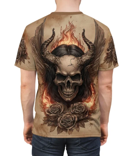 Flaming Horned Skull Tee — Gothic Skull & Roses All-Over Print