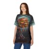 A Skeleton Hand Holding a Burger design on a unisex cut and print tee, giving off an eerie vibe. Perfect for those who appreciate dark and quirky designs. Ideal for Halloween enthusiasts, horror lovers, and anyone with a unique sense of style. Great for Halloween parties, horror movie marathons, or everyday wear.
