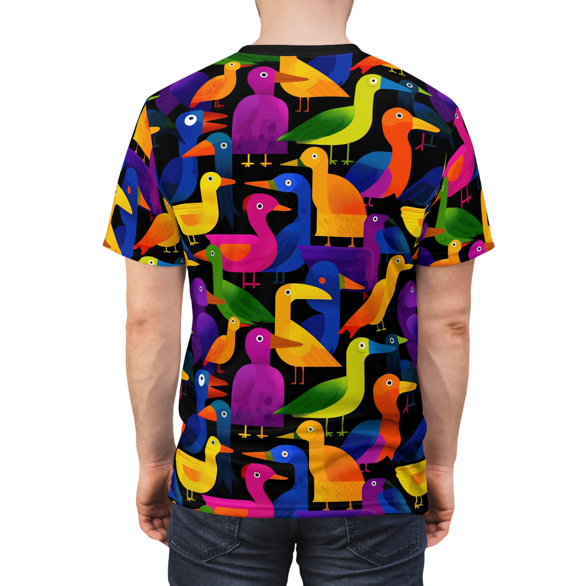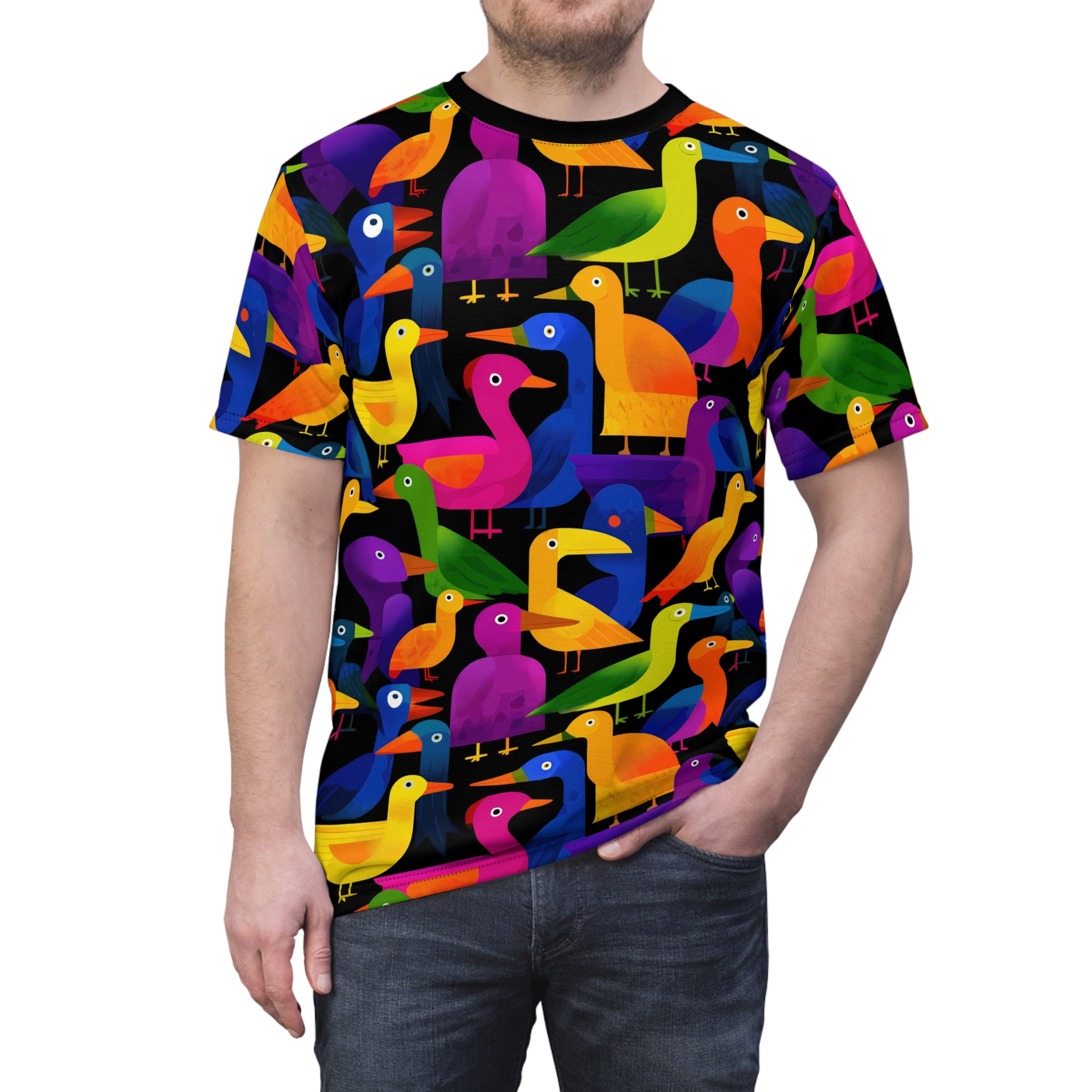 Brighten up your wardrobe with this vibrant UnisexAll Over PrintTee! Featuring a playful design of colorful birds, this tee exudes a joyful and whimsical vibe. Perfect for casual outings or lounging at home, it makes a statement piece for those who love unique and artistic fashion. Ideal for bird lovers, art enthusiasts, or anyone looking to add a splash of color to their collection. Celebrate special occasions like birthdays, casual gatherings, or simply gift it to someone special for a fun surprise. With its comfortable fit and stylish design, this tee is a versatile addition to any wardrobe, perfect for year-round wear.