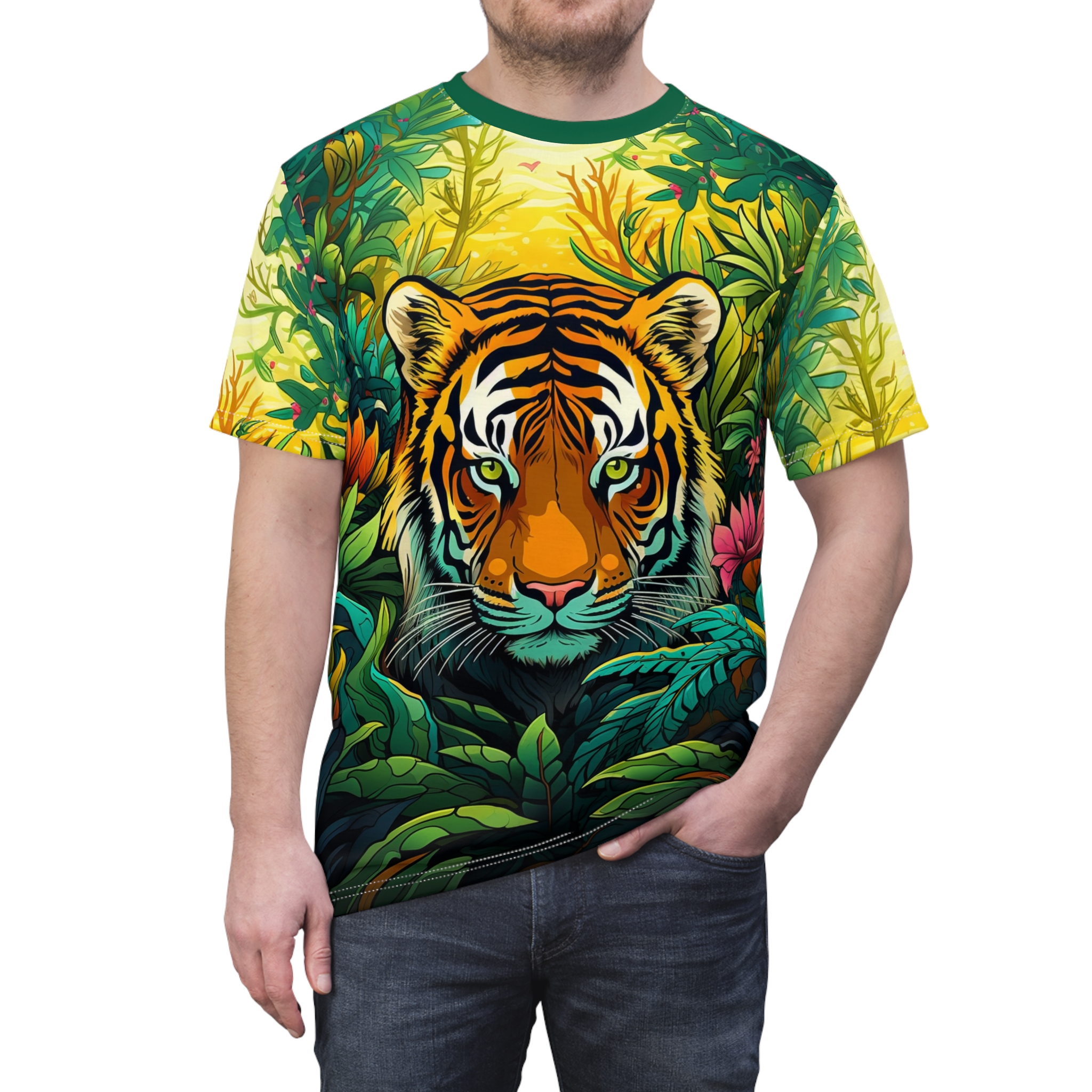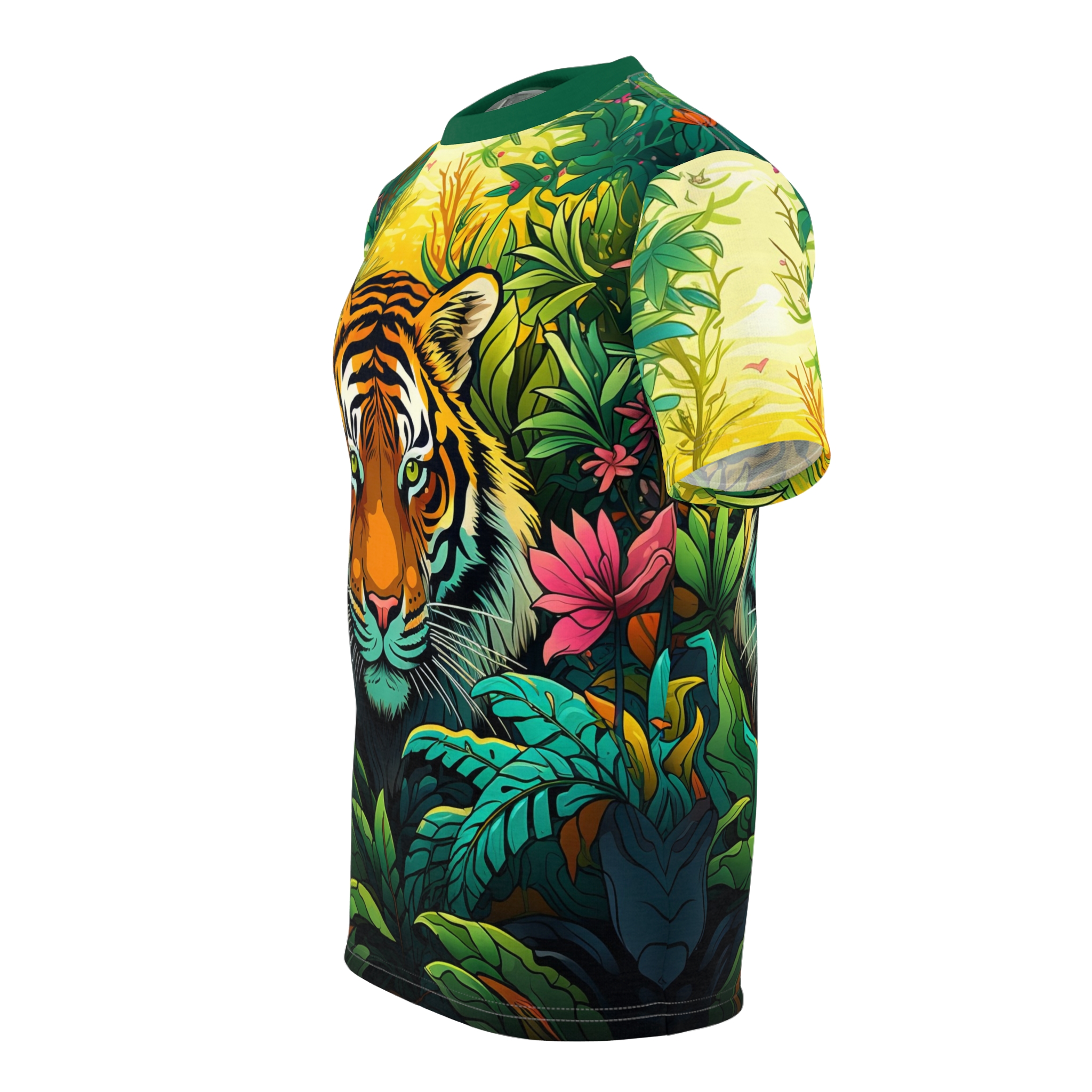 A colorful tiger in a jungle design on a high-quality polyester tee. This vibrant and eye-catching tee is perfect for nature lovers and animal enthusiasts. Great for casual wear or as a statement piece. Ideal for wildlife enthusiasts, zoo visitors, and jungle-themed parties.