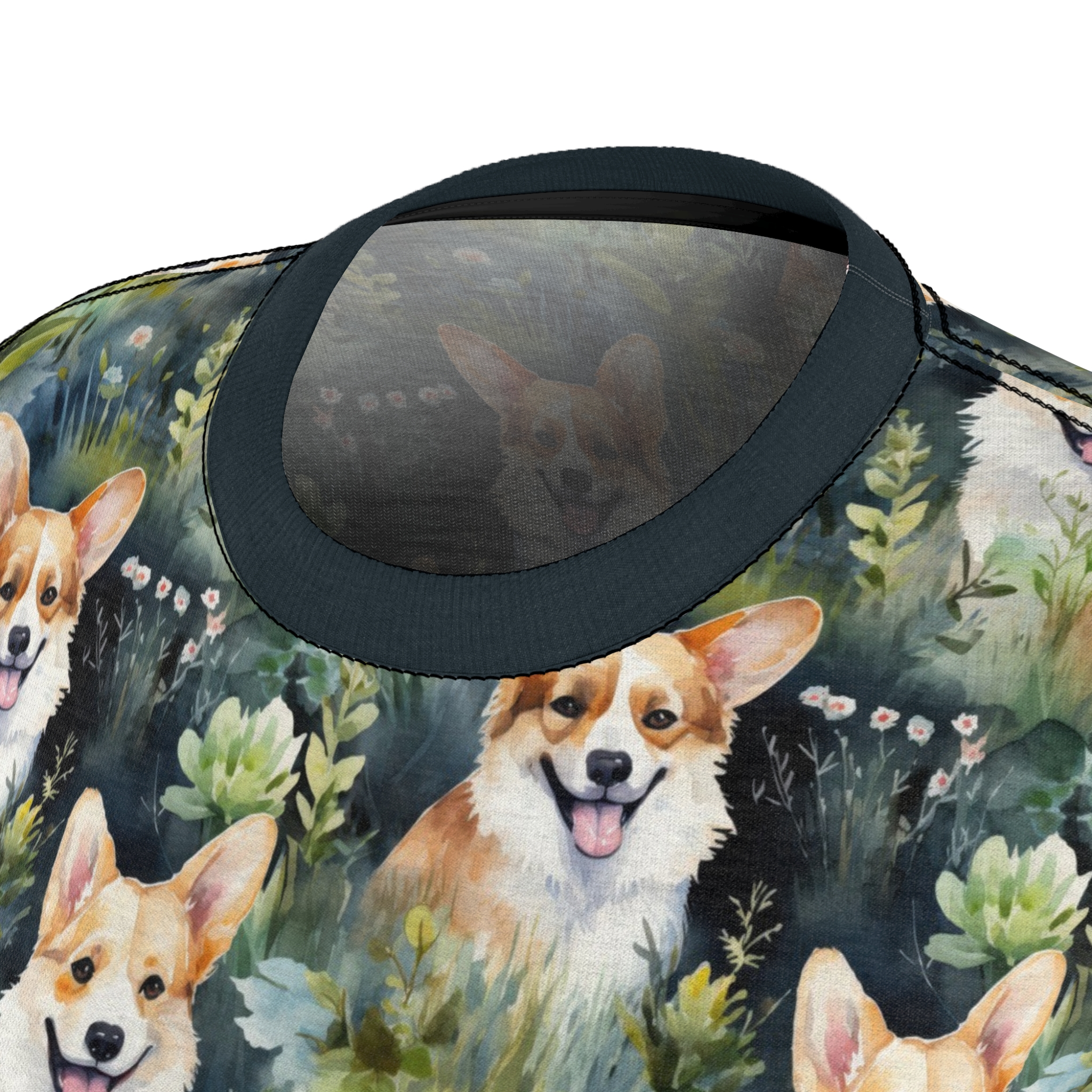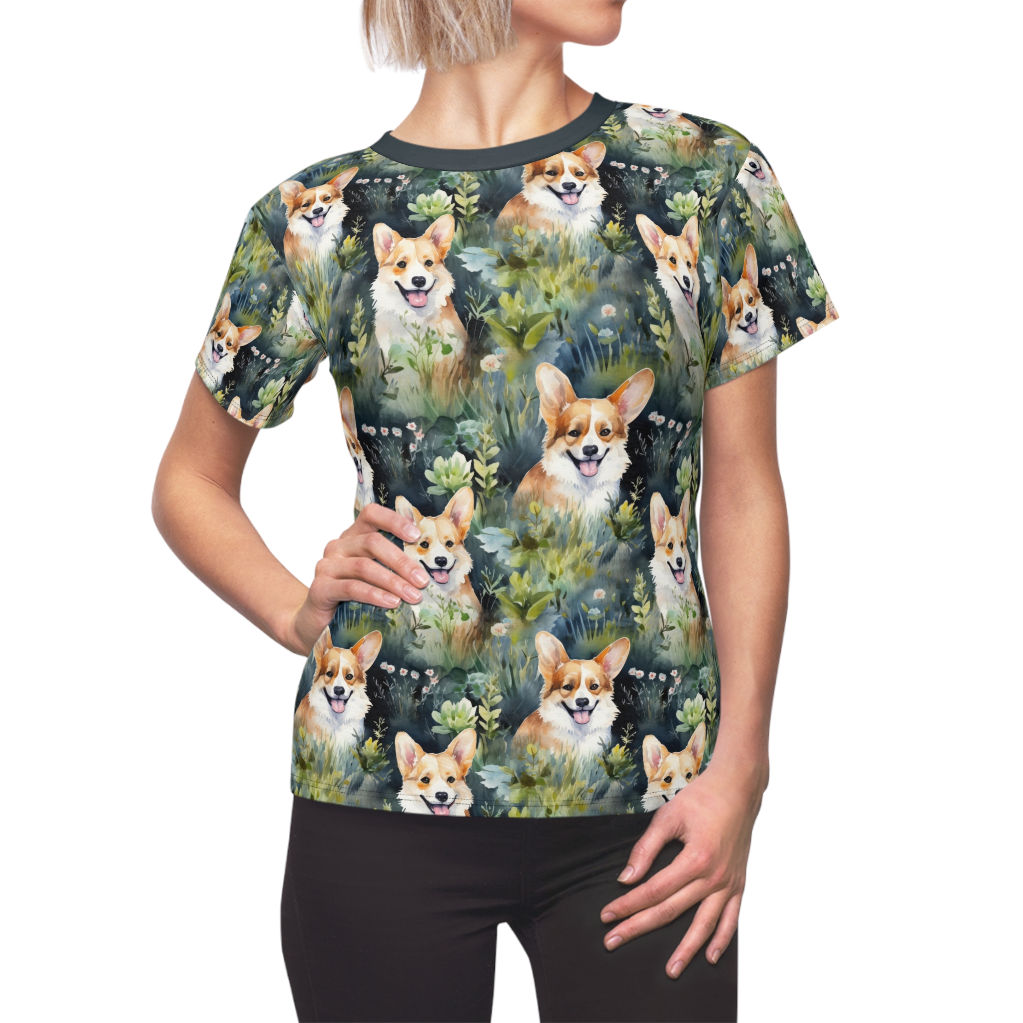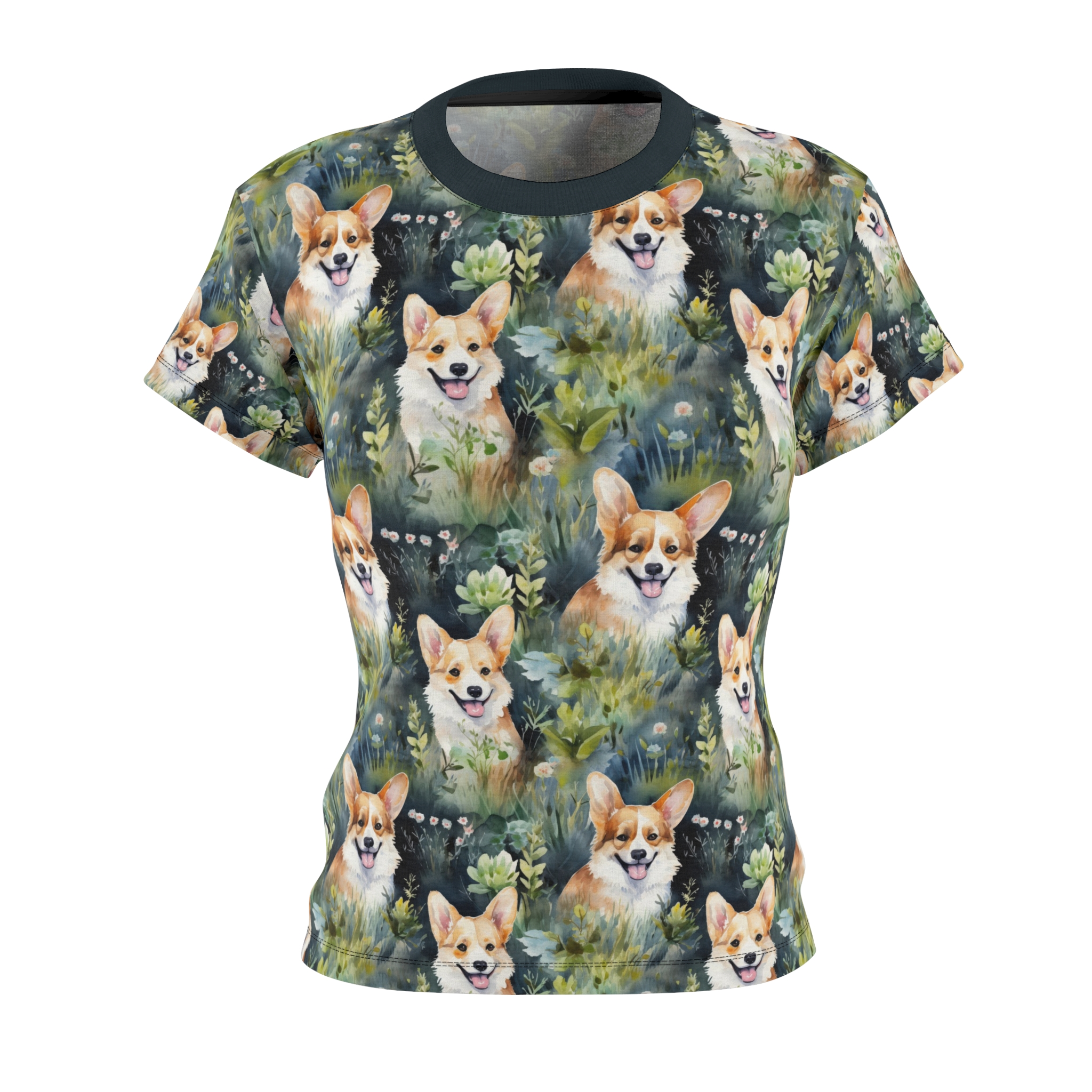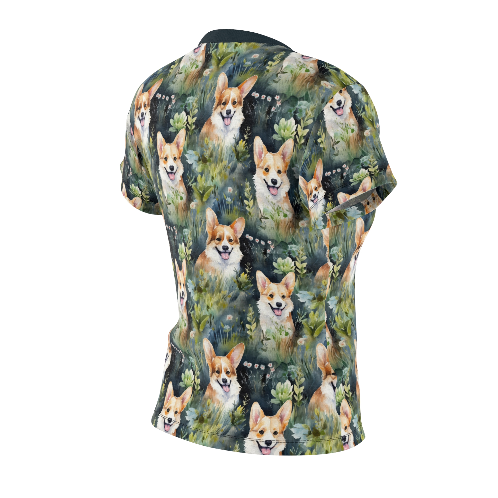 Soft, lively, and endlessly cheerful — this all-over print tee brings a pocket of woodland brightness to everyday wear. Hand-painted corgis peek out from mossy greens and soft florals, creating a playful, watercolor landscape that moves with you. The lightweight polyester keeps the print vivid and the fabric quick-drying, while a ribbed collar and side seams give the shirt a clean, flattering shape. Wear it on nature walks, dog meetups, or quiet mornings with coffee; it slips easily into the routines of someone who loves animals, color, and a touch of whimsy in their wardrobe.