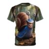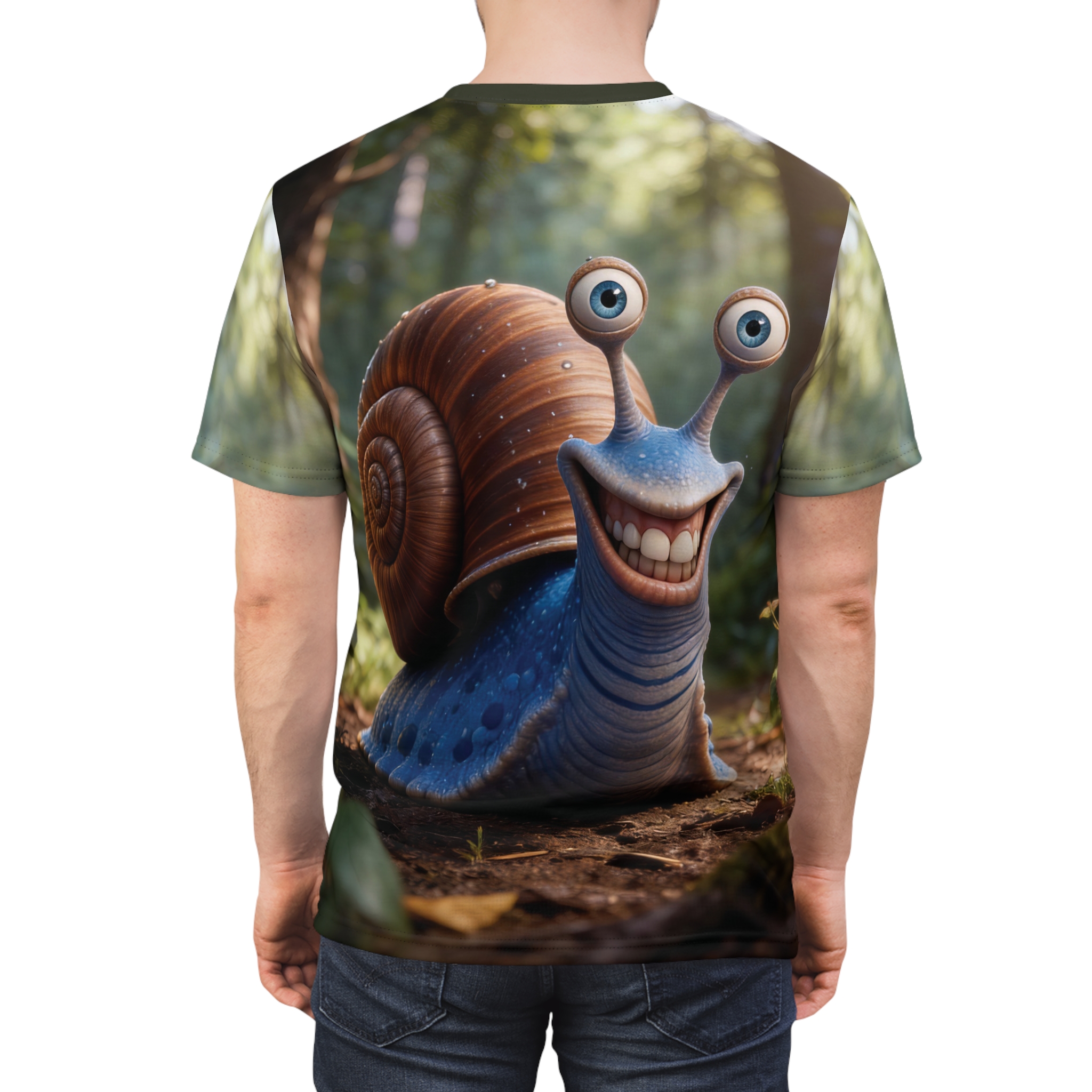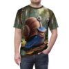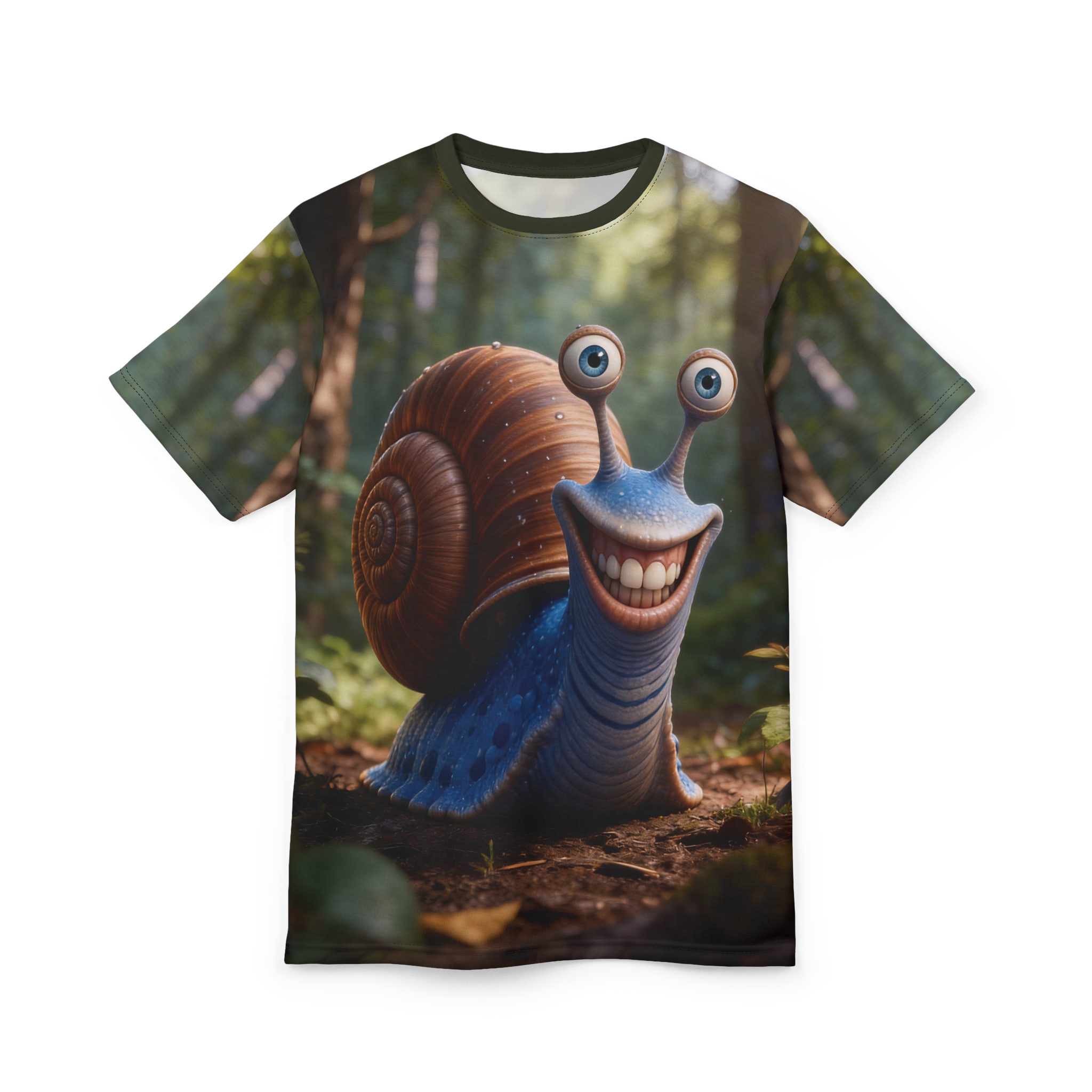 This playful all-over-print tee brings a burst of woodland mischief to your everyday wardrobe. The shirt features a highly detailed, smiling snail character set in a sun-dappled forest — bright, expressive eyes and a cheerful grin that spark conversation and lift the mood. Lightweight, quick-drying polyester keeps the colors vivid and the print seamless across front, back and sleeves. Wear it when you want to lean into whimsical style: layering under a jacket for a weekend stroll, slipping it on for a nature-themed meet-up, or packing it for a relaxed trip where comfort and personality matter. The regular fit and tagless finish make it easy to wear all day, while the reinforced collar, shoulder tape and side seams keep the shape looking crisp after repeated washes. This tee reads like a tiny, wearable story — friendly, slightly surreal, and undeniably fun.