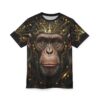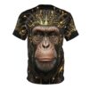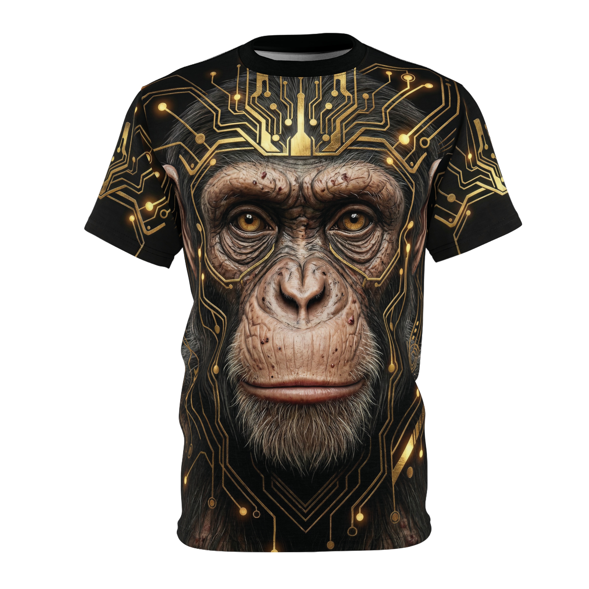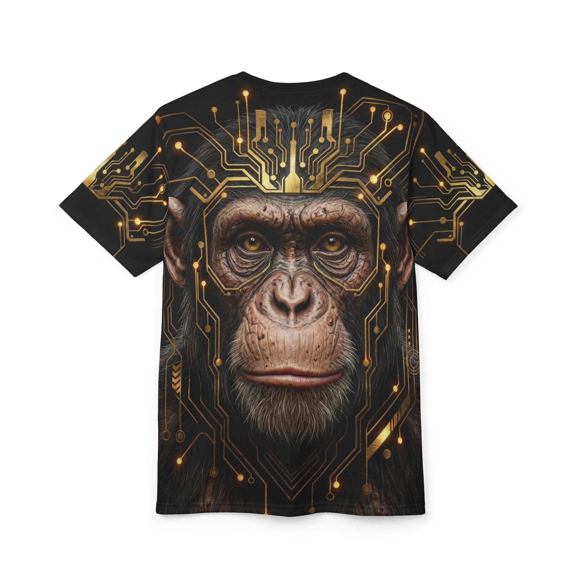 This all-over printed tee brings together raw intelligence and high-tech circuitry in a single, wearable statement. The front-and-back design features a lifelike chimpanzee face framed by glowing gold circuitry, giving the shirt a mysterious, cyber-primitive energy. Lightweight and quick-drying polyester keeps the print vivid and the fit comfortable whether you’re layering under a jacket or wearing it solo. Wear it to signal curiosity, roam city streets, or spark conversation at meetups and creative events.