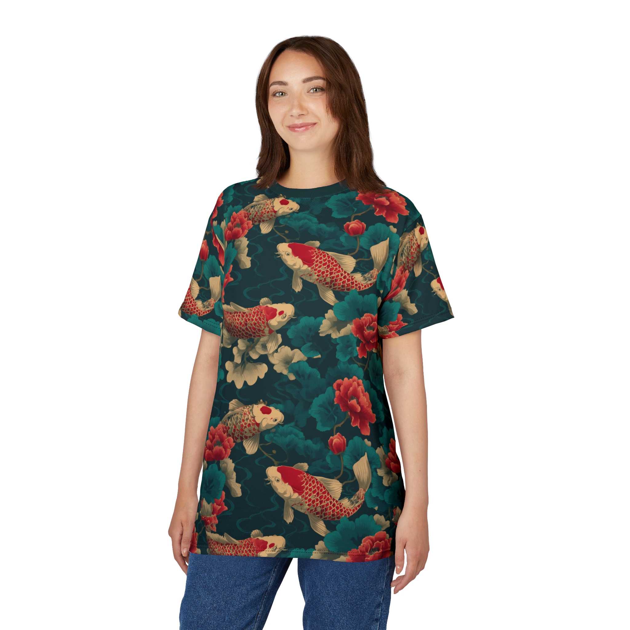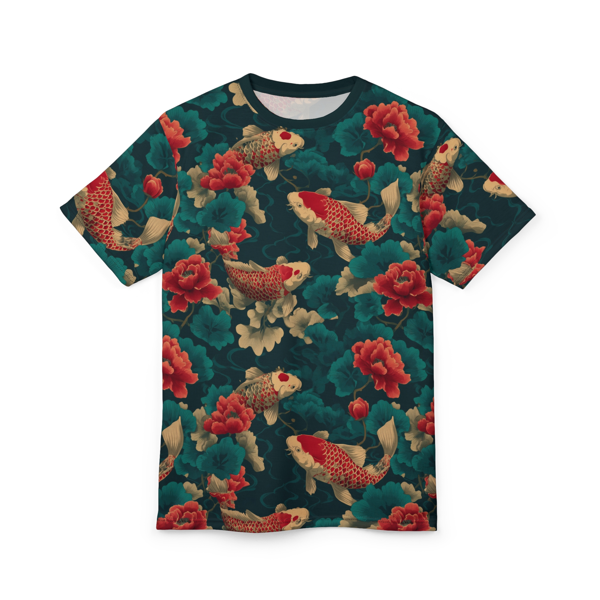 Elegant Koi Fish Floral Tee, Unisex AOP T-Shirt, Perfect for Summer Vibe, Casual Wear, Gift for Nature Lovers, Unique Art Apparel