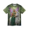 Step into a quiet, sunlit grove where magic feels possible. This all-over print tee carries a gentle, storybook scene: a serene fairy with lavender wings seated on a white unicorn garlanded in blossoms. Soft greens and dappled light wrap the design, creating a calm, otherworldly mood that lingers when you move. Wear it for slow, thoughtful days — wandering craft fairs, sharing stories around a bonfire, or layering for a woodland-themed gathering. The imagery invites lingering glances and sparks conversation with others who love mythic creatures, renaissance fairs, or cottage-core days in the park.