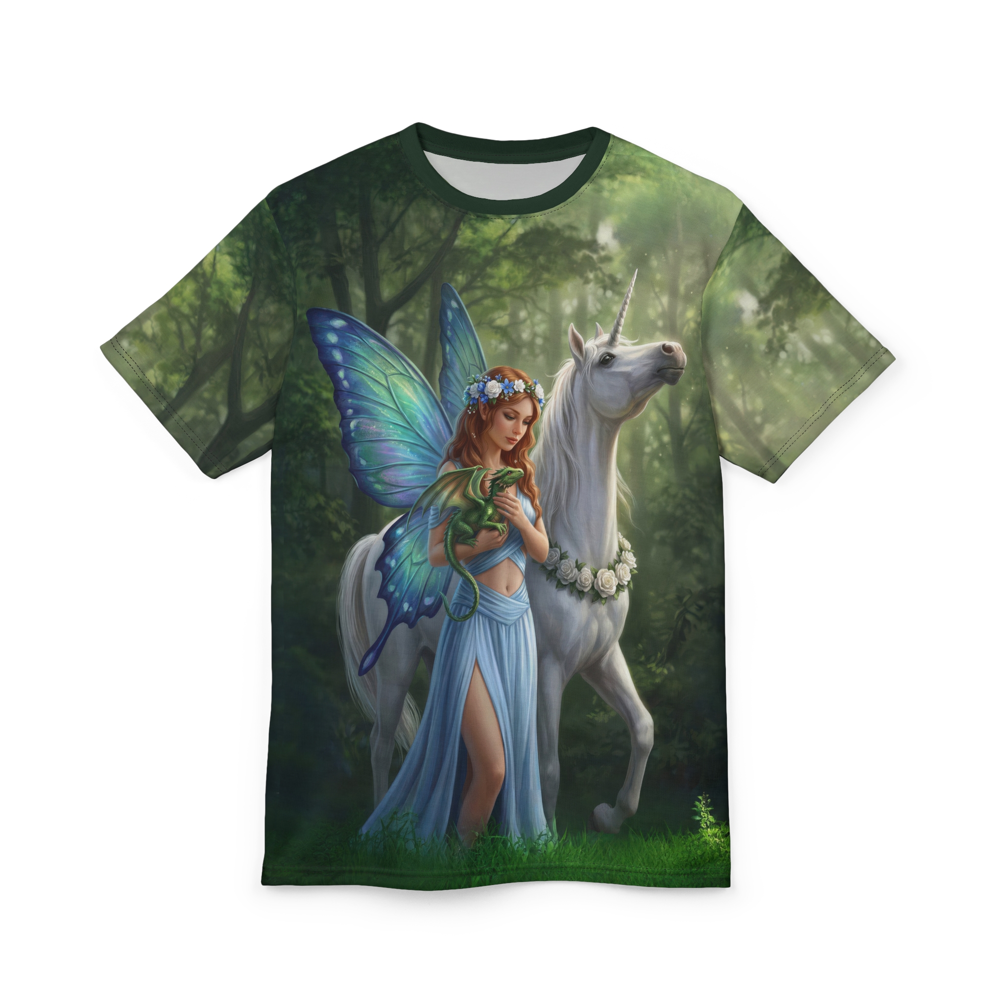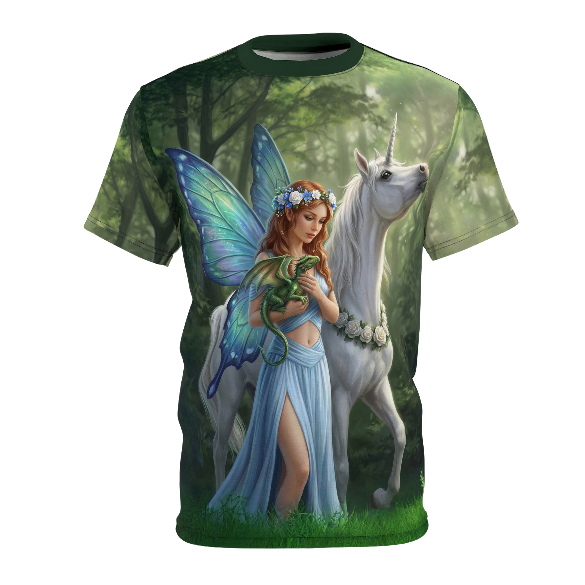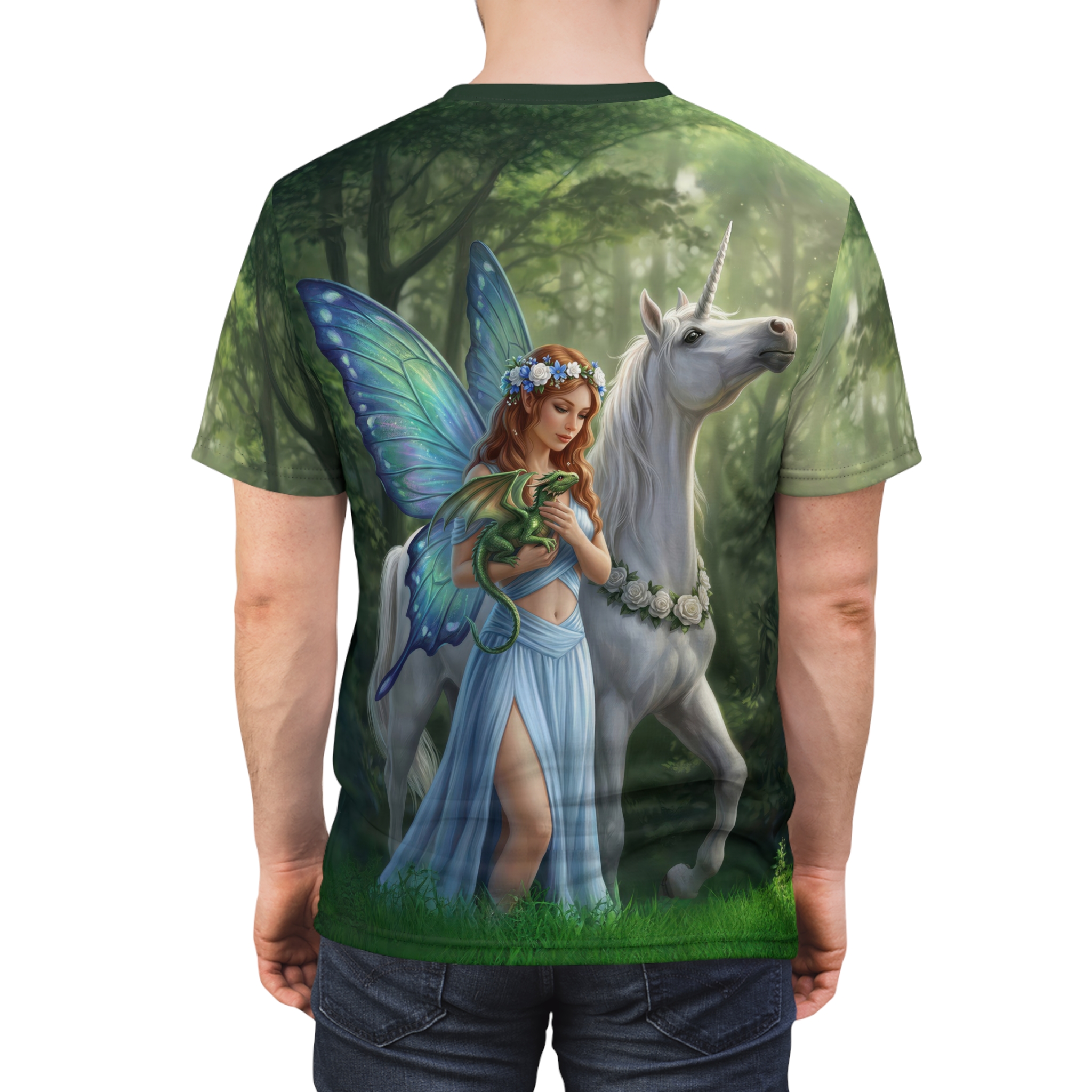 Step into a quiet, enchanted grove with this all-over print tee. Softly shaded greens and dappled light wrap around a detailed scene: a gentle unicorn standing beside a serene fairy in a flowing blue gown, her iridescent wings catching the forest glow. The shirt feels like a wearable story—calm, wistful, and a little bit magical—made for days when you want to carry a bit of wonder with you. Wear it on slow mornings, at fantasy conventions, or whenever you want a gentle reminder of calm forests and timeless myths.
