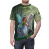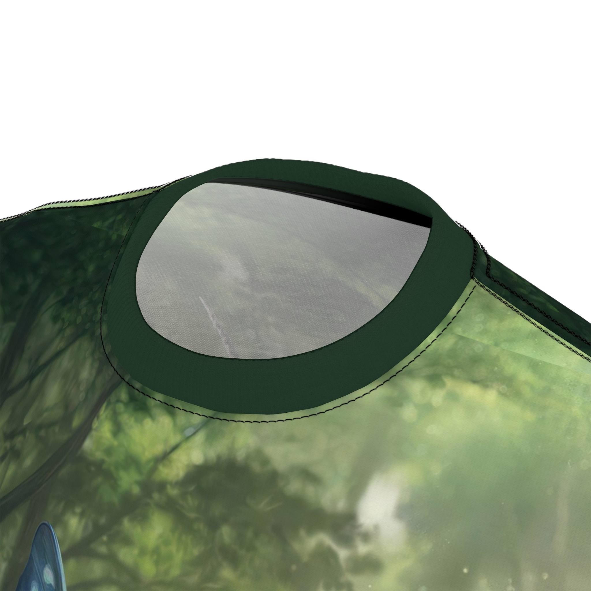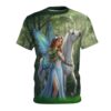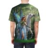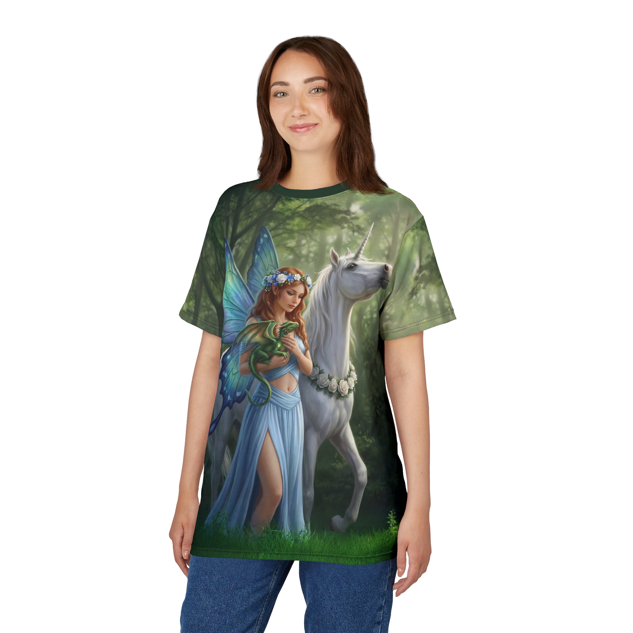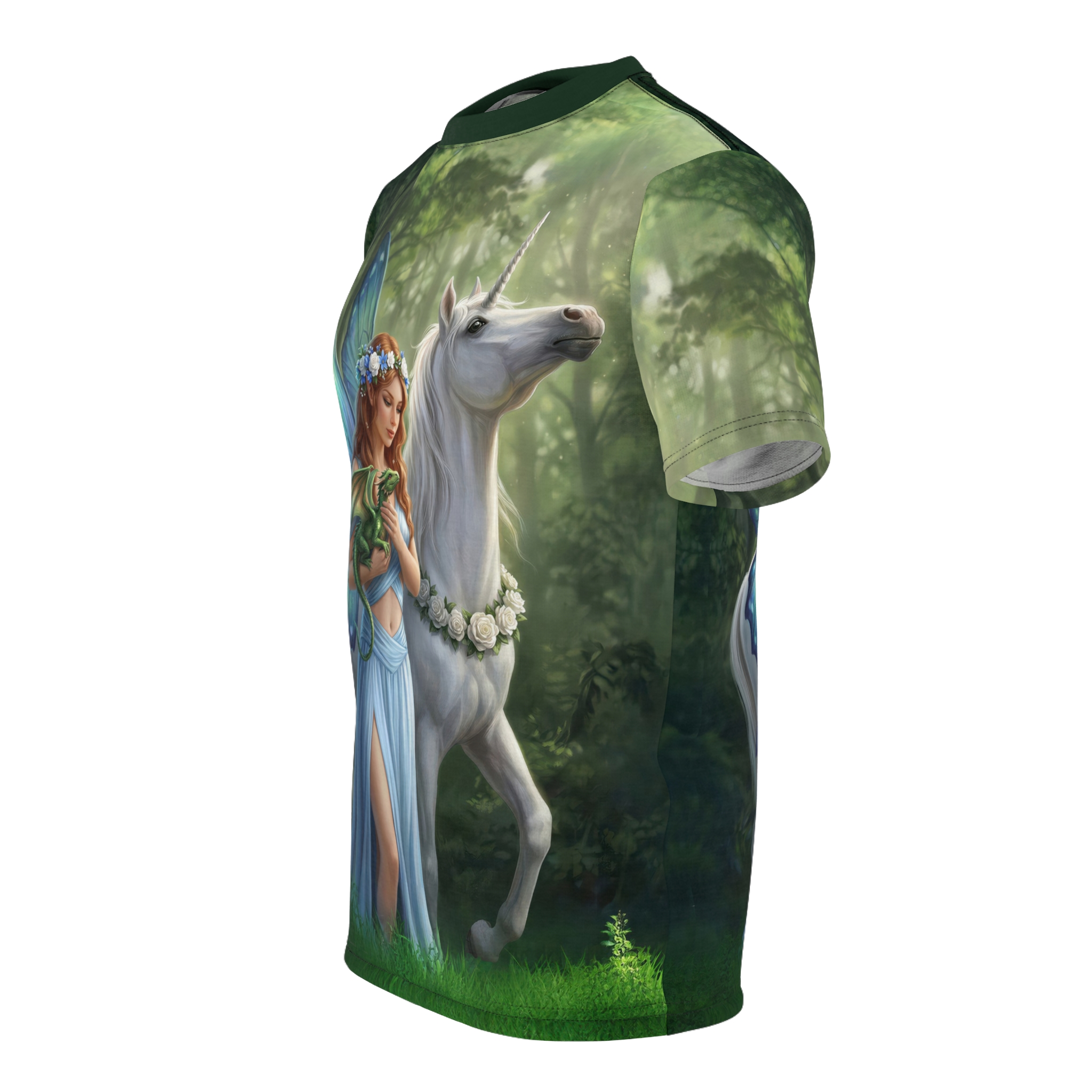 Step into a quiet, enchanted grove with this all-over print tee. Softly shaded greens and dappled light wrap around a detailed scene: a gentle unicorn standing beside a serene fairy in a flowing blue gown, her iridescent wings catching the forest glow. The shirt feels like a wearable story—calm, wistful, and a little bit magical—made for days when you want to carry a bit of wonder with you. Wear it on slow mornings, at fantasy conventions, or whenever you want a gentle reminder of calm forests and timeless myths.