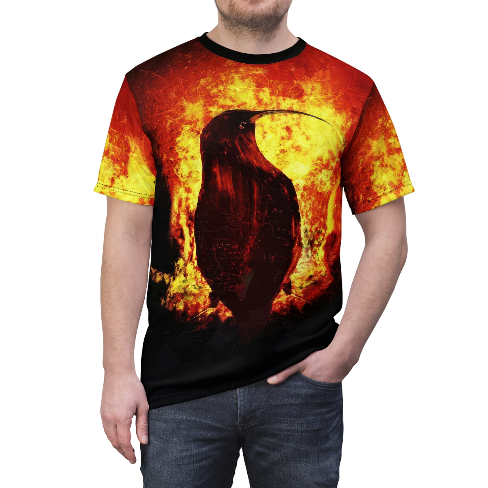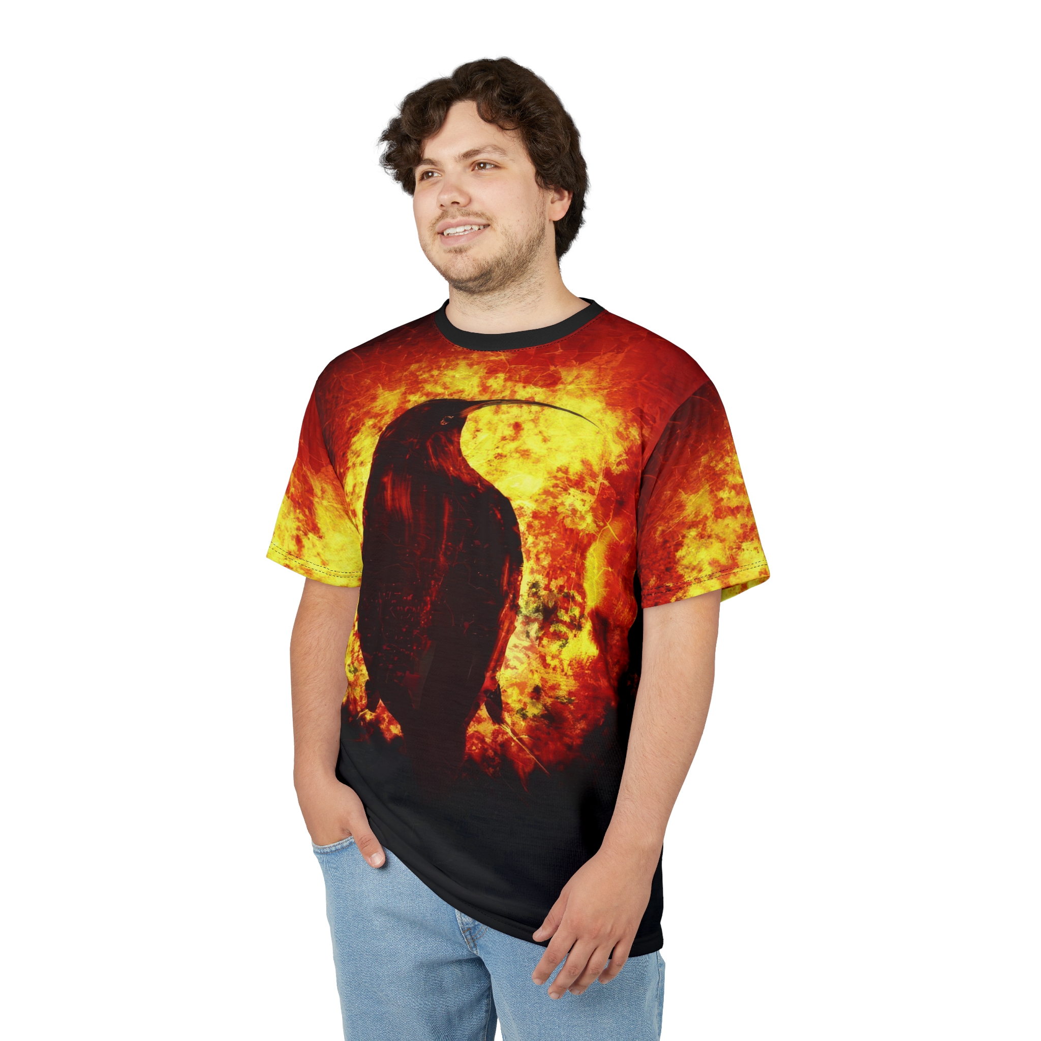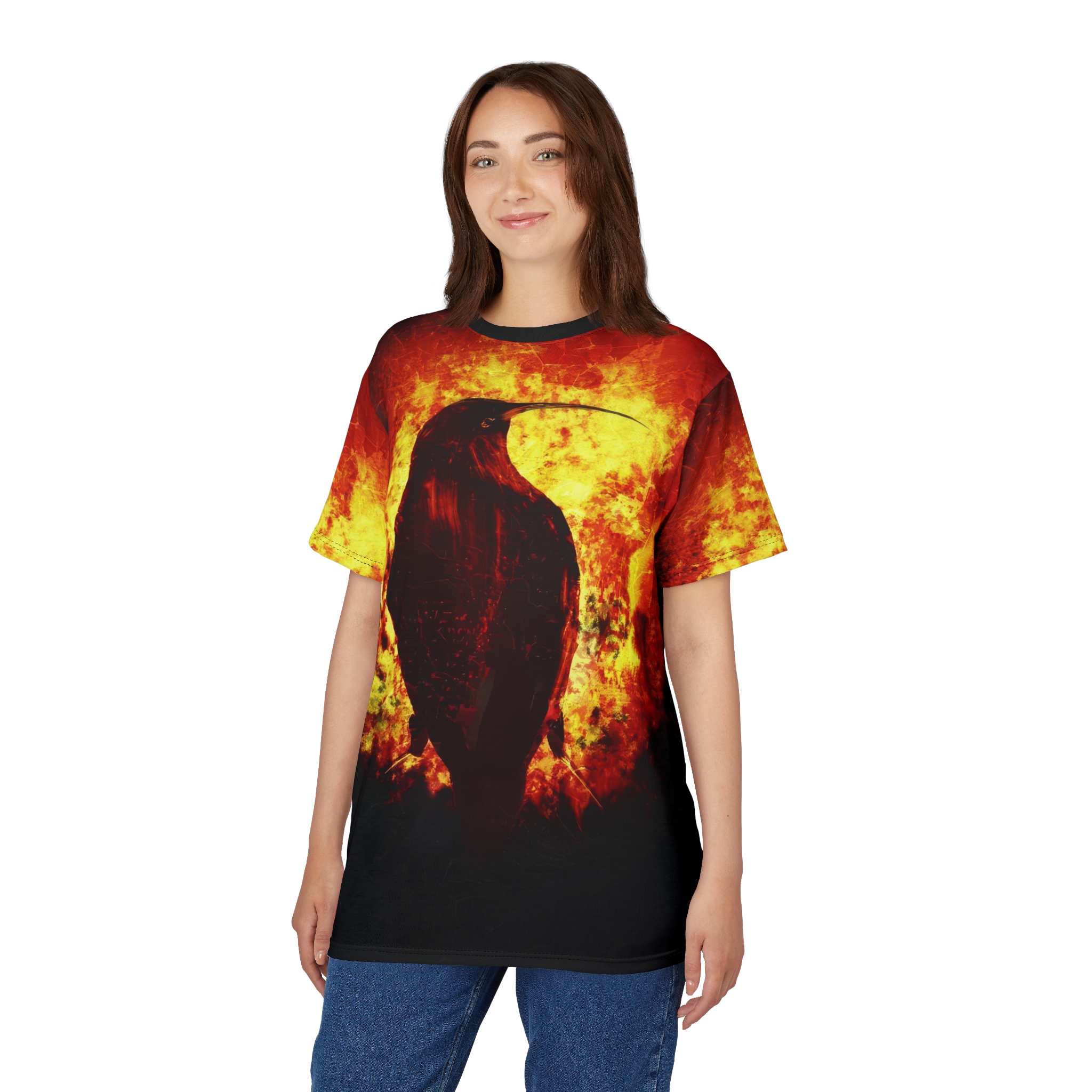 Fiery Raven Unisex All Over Print – Bold Graphic T-Shirt for Edgy Style