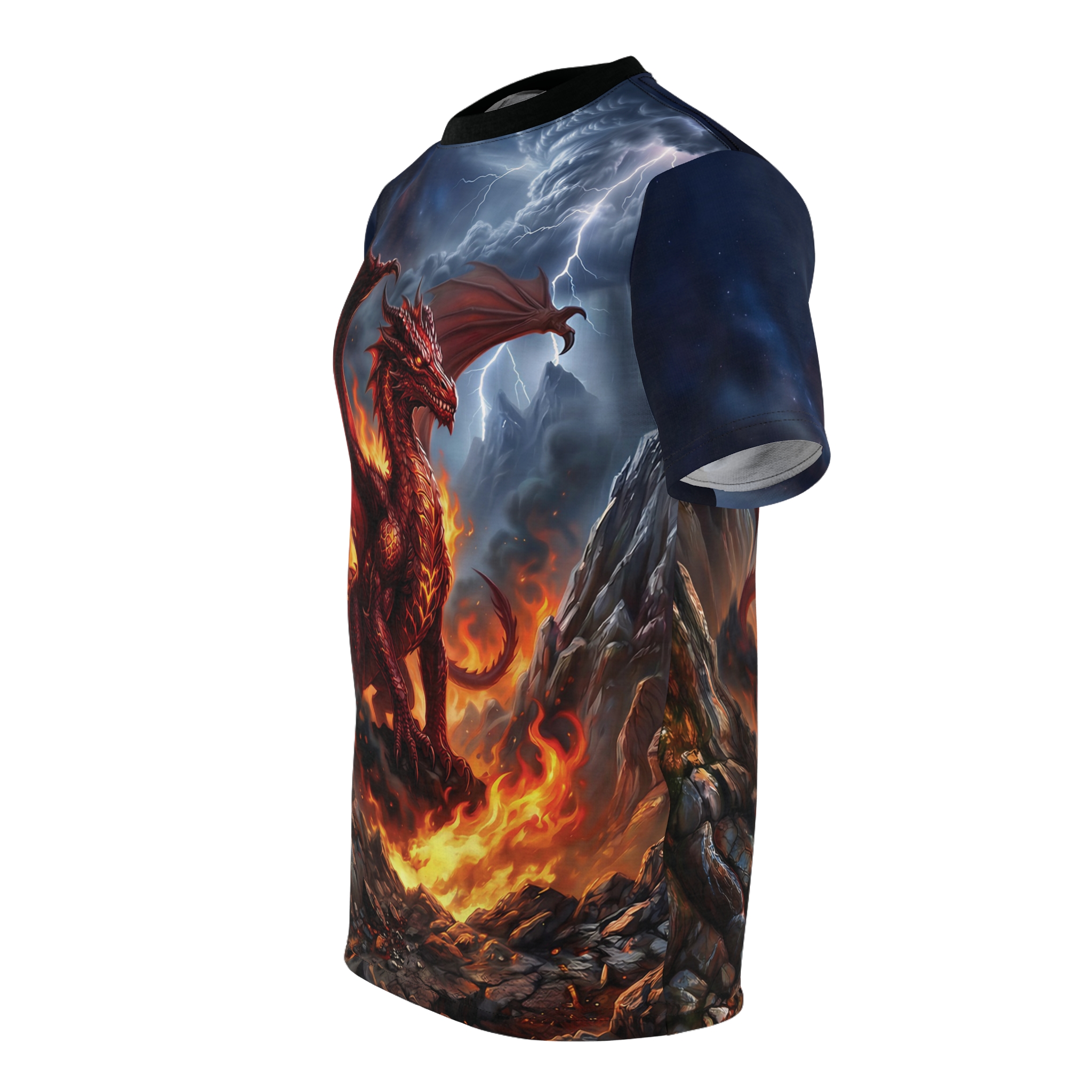 This all-over print tee brings a bold, cinematic dragon scene to life — molten scales, roaring wings and lightning-split skies rendered in rich, saturated color. Lightweight yet durable polyester keeps the print vivid and the silhouette neat, so the artwork stays dramatic wear after wear. Wear it when you want to channel raw energy: at a convention, a game night, a medieval meetup, or just when you need a striking statement piece. The regular fit and tagless finish make it comfortable for long days, while the ribbed collar and shoulder tape keep the shape sharp so the design stays the star.