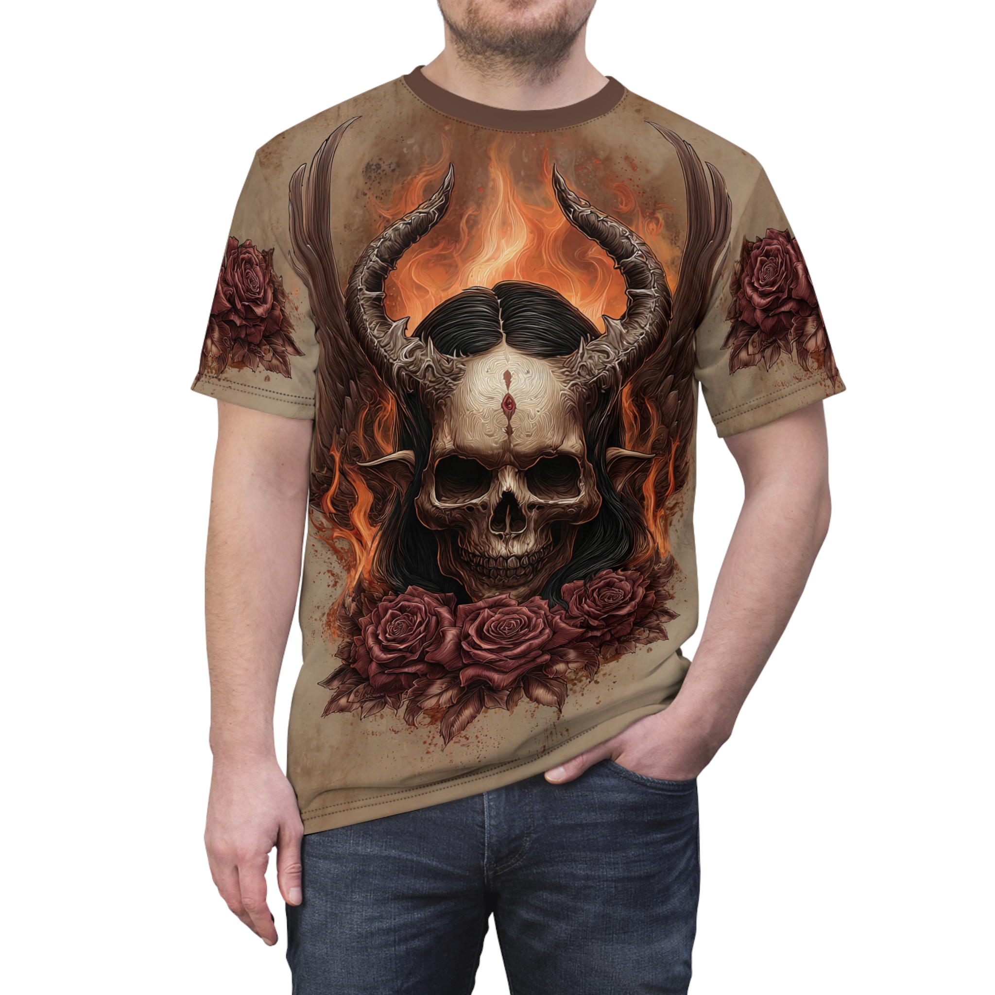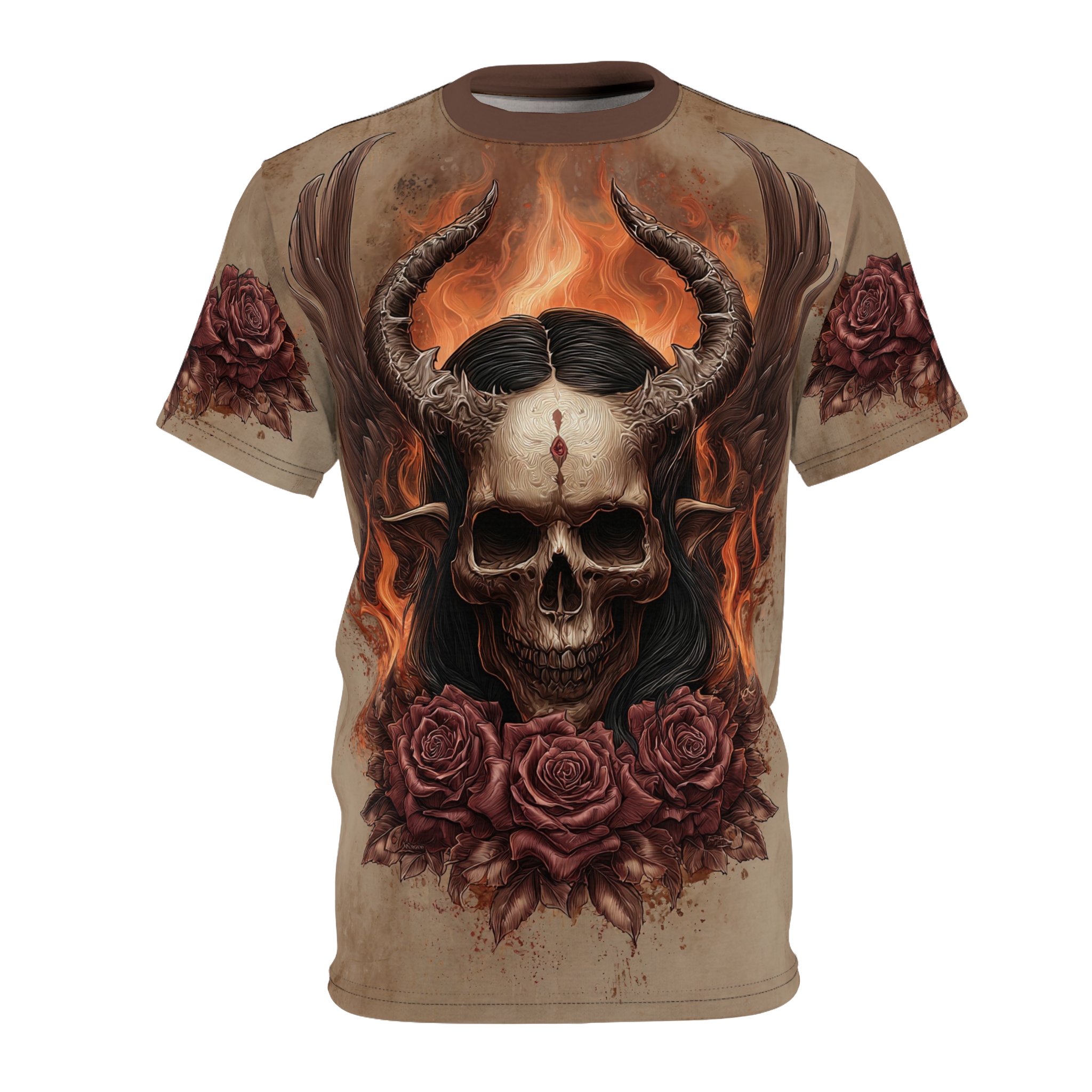Flaming Horned Skull Tee – Gothic Skull & Roses All Over Print T-Shirt