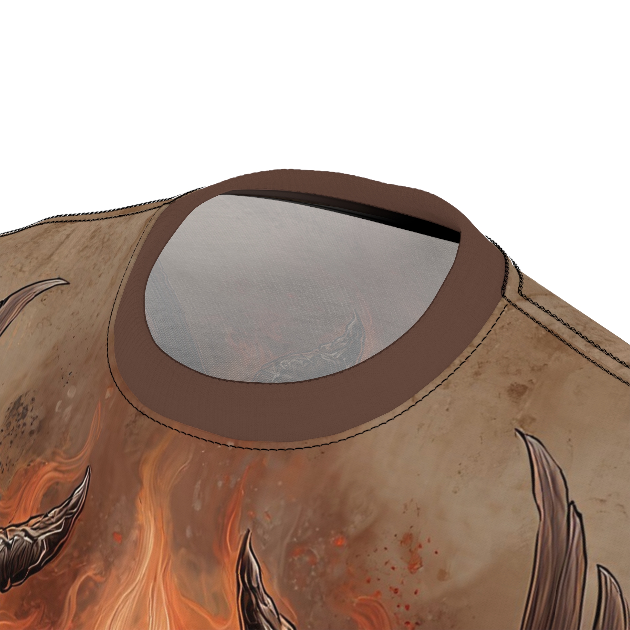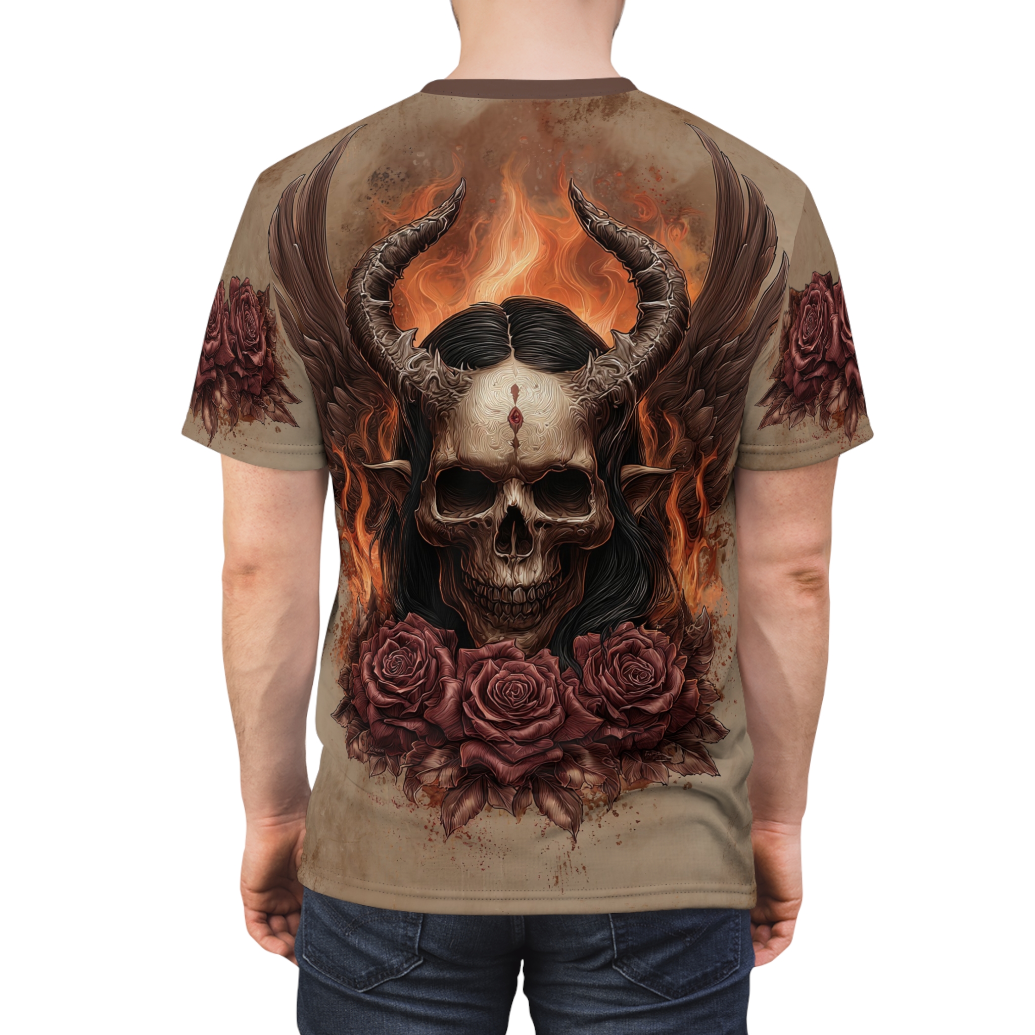 This all-over print tee carries a dark, atmospheric energy—smoky browns, ember flames, and a horned skull crowned with deep red roses. It feels like stepping into a moonlit ritual: heavy incense, warm embers, and a hush that makes you stand taller. Wear it to concerts, late-night rides, or when you want your outerwear to tell a story. The regular fit and tagless finish keep the silhouette comfortable and clean, while the durable polyester and reinforced seams mean the artwork stays vivid and crisp wash after wash. This shirt fits into a wardrobe that leans gothic, metal, or occult-inspired—an easy layer for layering under a leather jacket or wearing solo when the night calls for something bold and brooding.