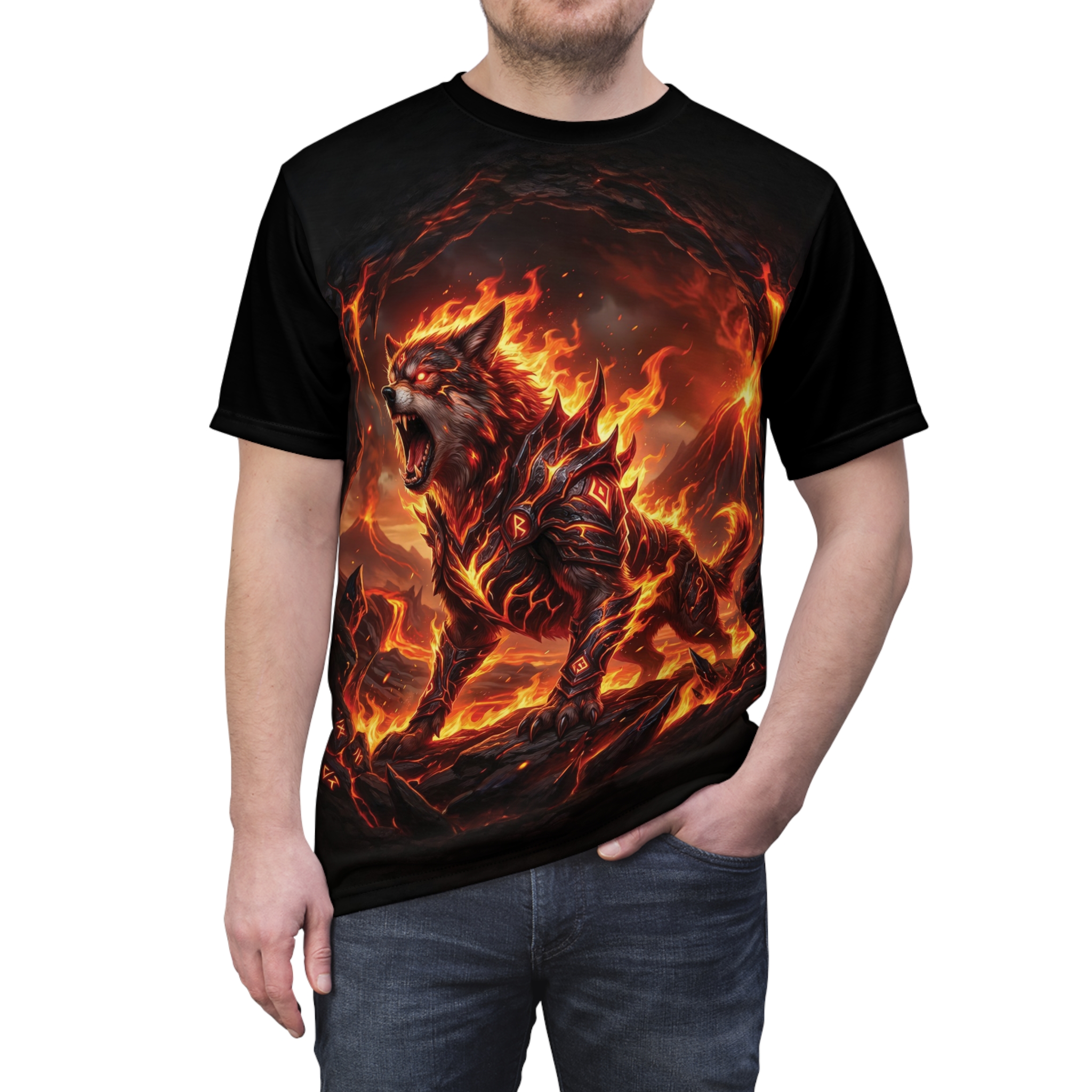 A bold, all-over-print tee that channels raw wildfire energy. The shirt’s front erupts with a blazing wolf forged from flame and ember—muscular, fierce, and impossibly alive. Short lines of contrast and depth give the beast motion; the black backdrop makes every flare feel incandescent. Wear it when you want to carry a wildfire spirit: intense nights at shows, late-night rides, or when you need to tap into something fearless. The fabric is lightweight, quick-drying polyester with a soft, tagless finish and structured seams so the printed scene stays sharp wash after wash. It sits true to size in a regular cut, with a ribbed collar and shoulder taping for a durable, lived-in feel.