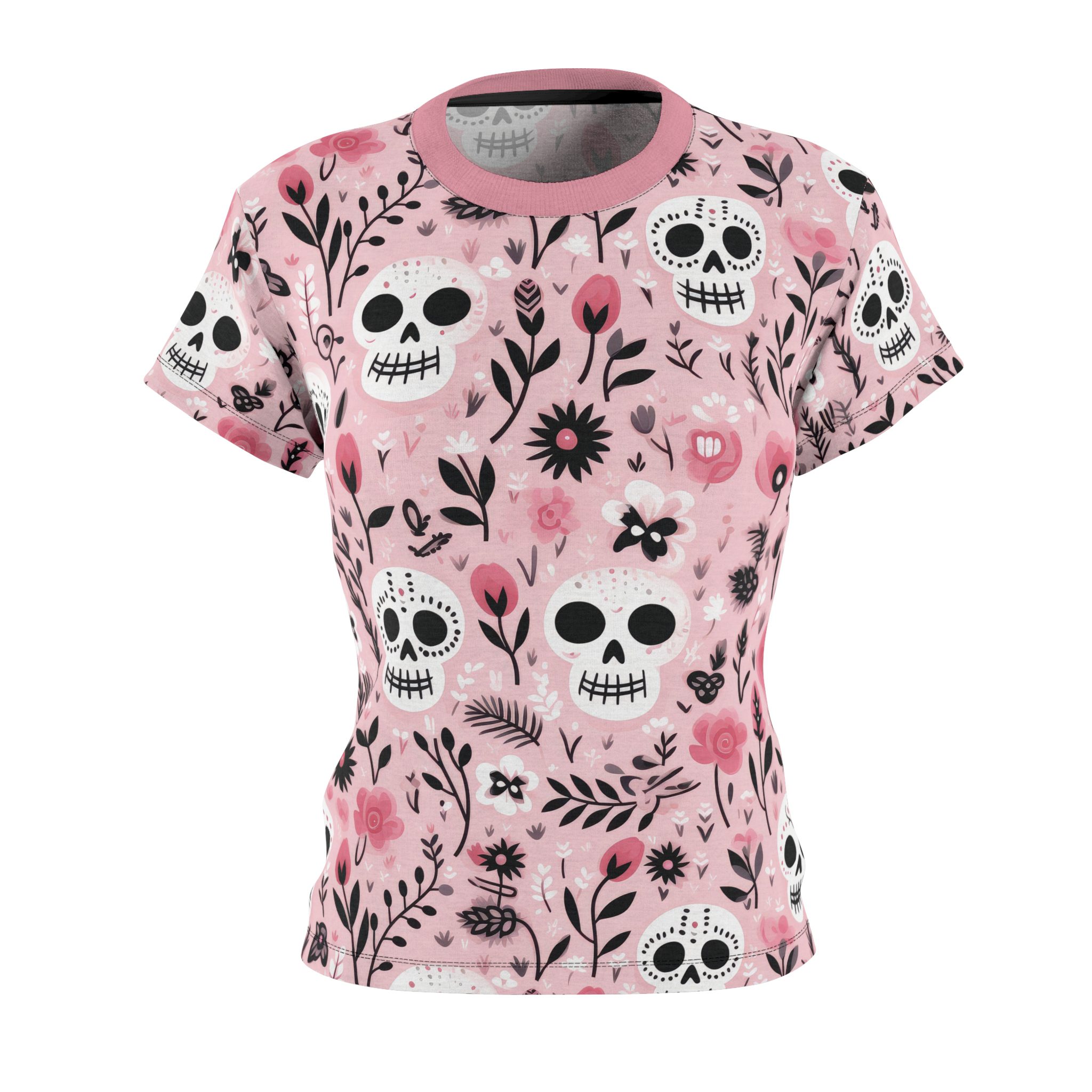 Floral Skull Women’s All Over Print Tee – Stylish Day of the Dead Top