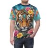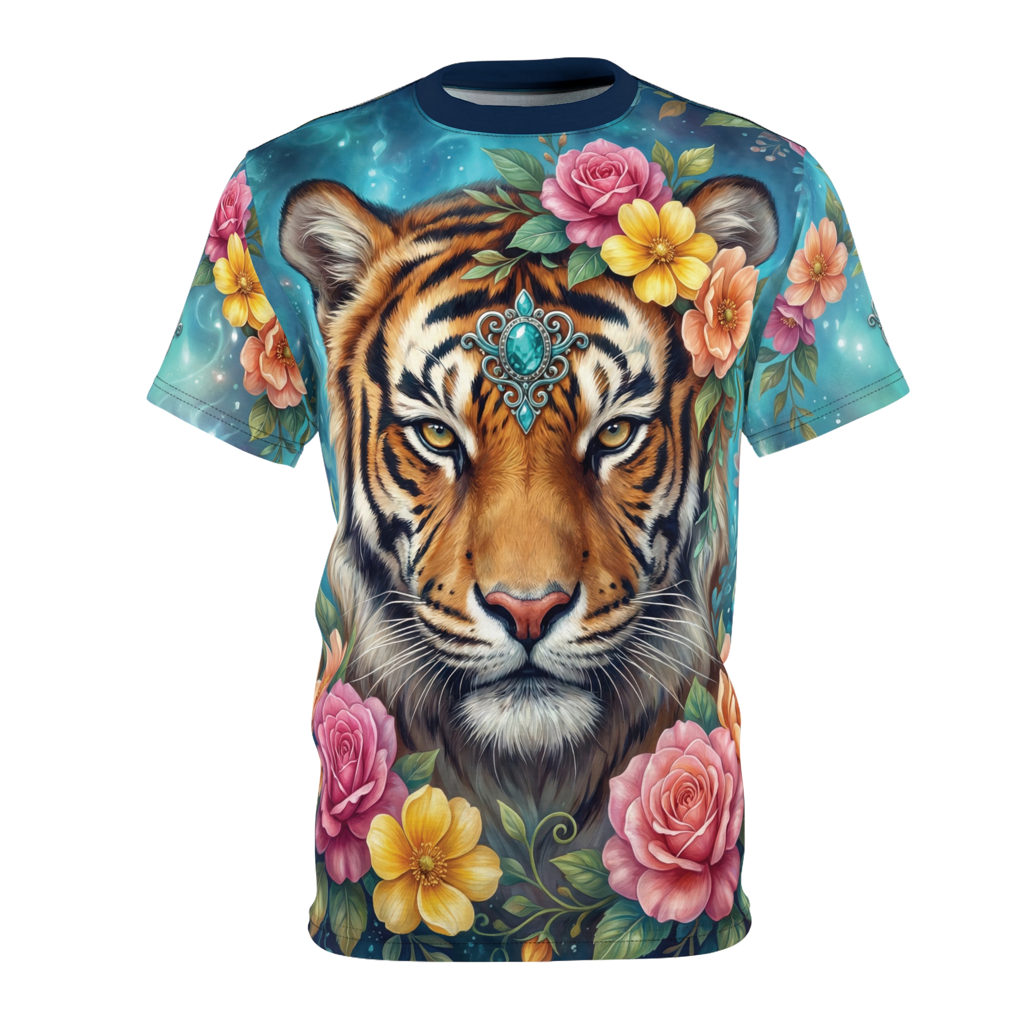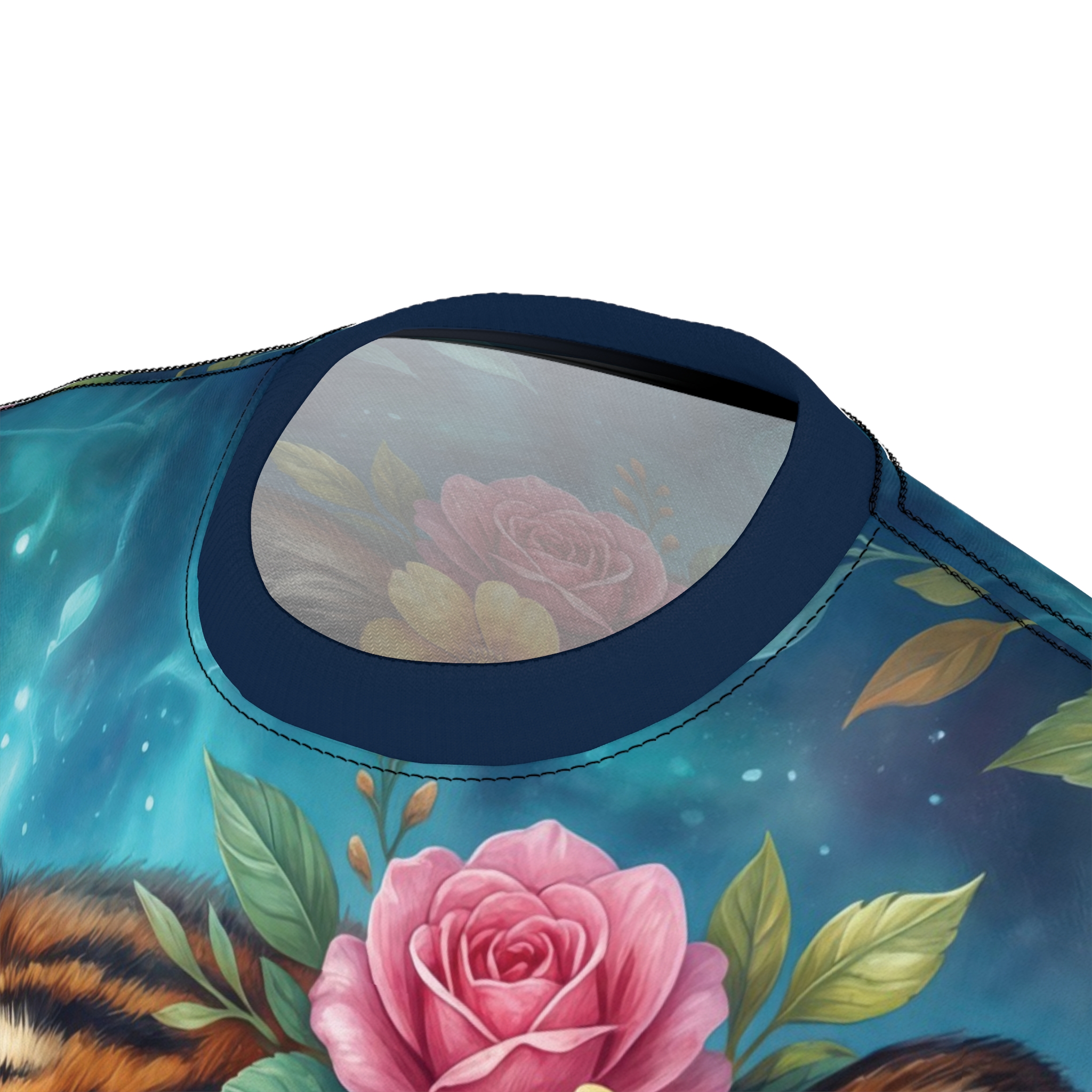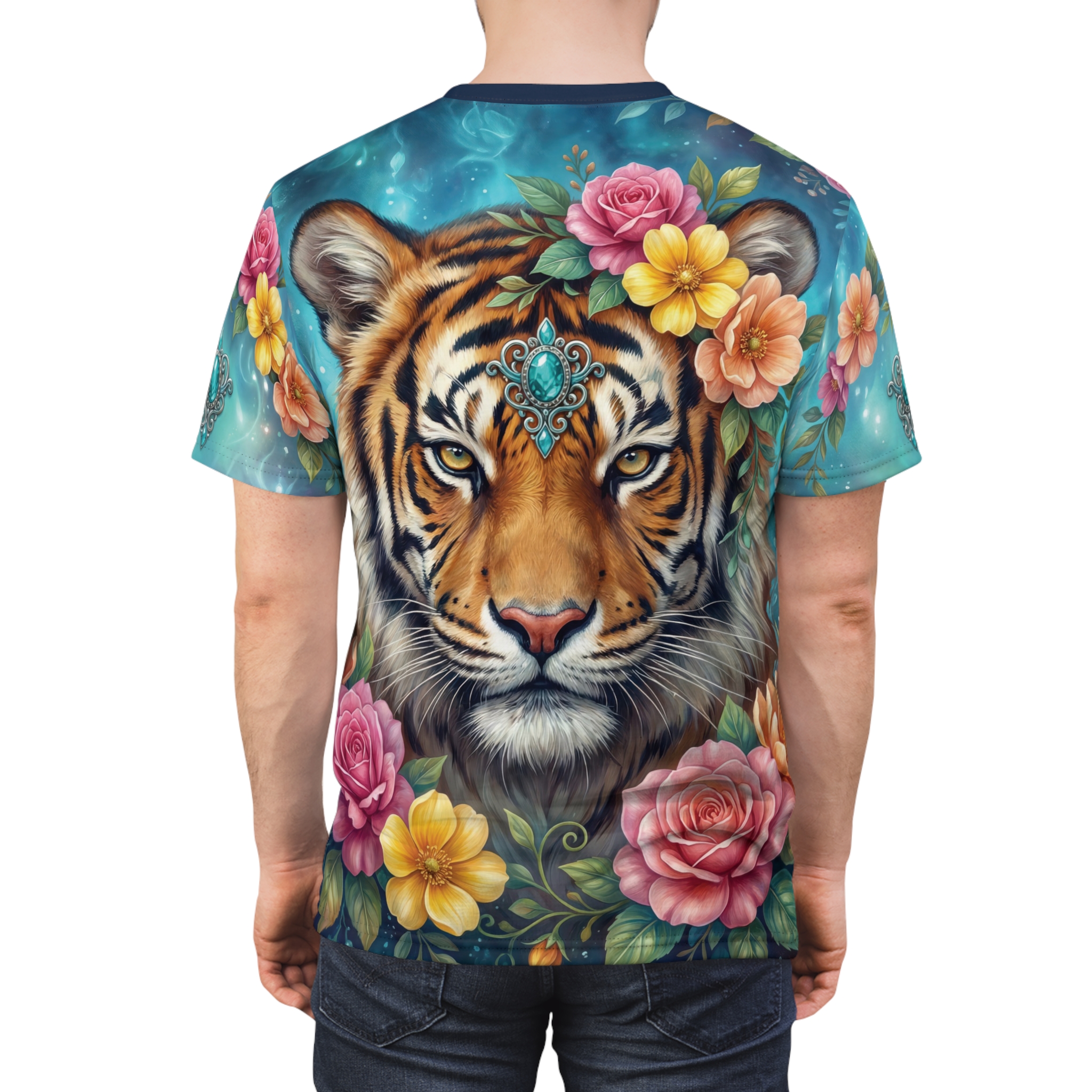 Wearable art that feels like stepping into a secret garden guarded by a calm, watchful tiger. The all-over printed tee frames a detailed tiger portrait with jewel-toned fur, surrounded by lush roses and golden blossoms against a misty teal sky. Lightweight polyester keeps the colors vivid and the fit smooth, so the design stays bold through washes and days on the move. It settles like a statement piece — confident, slightly mystical, and quietly fierce — for anyone who wants their wardrobe to tell a story without saying too much.