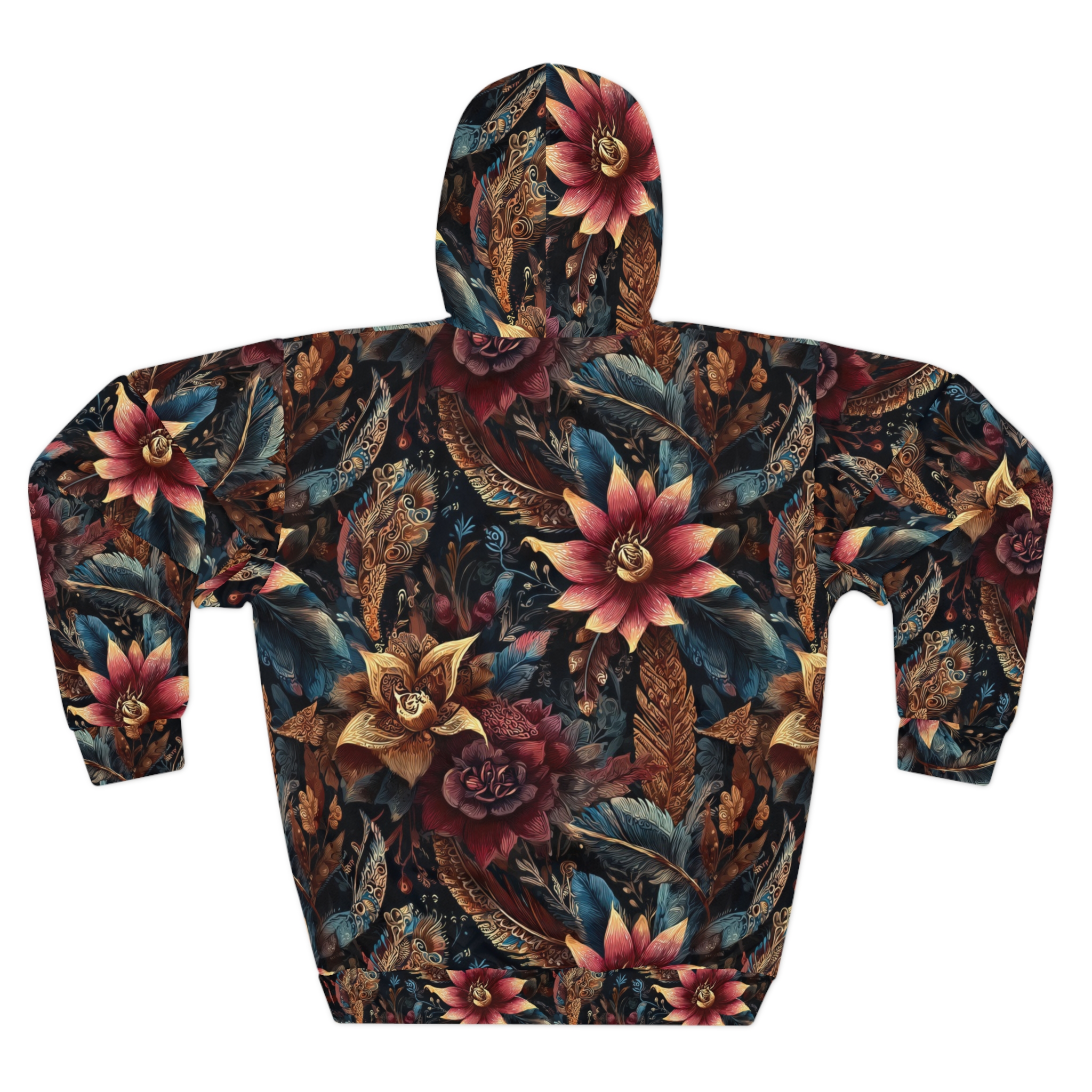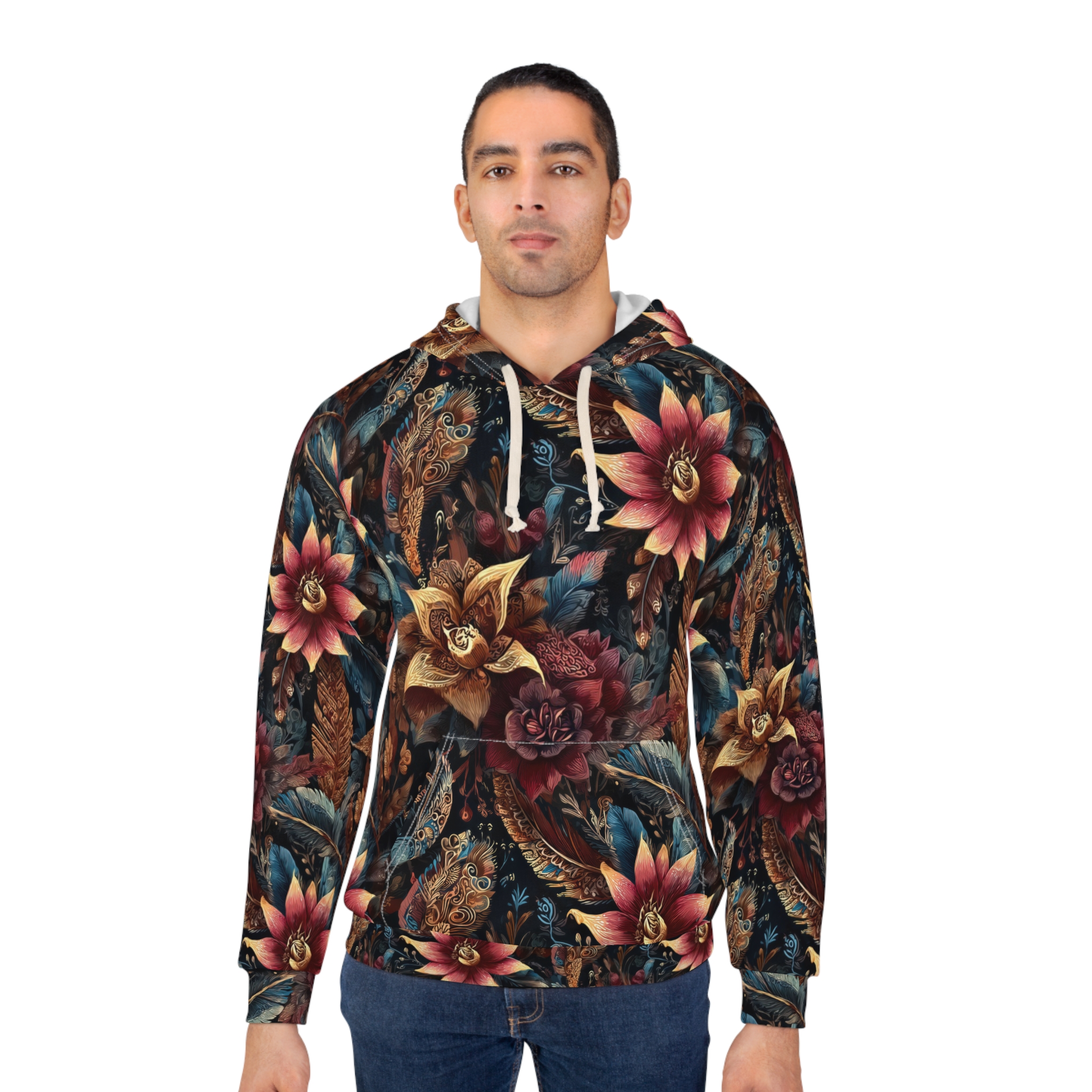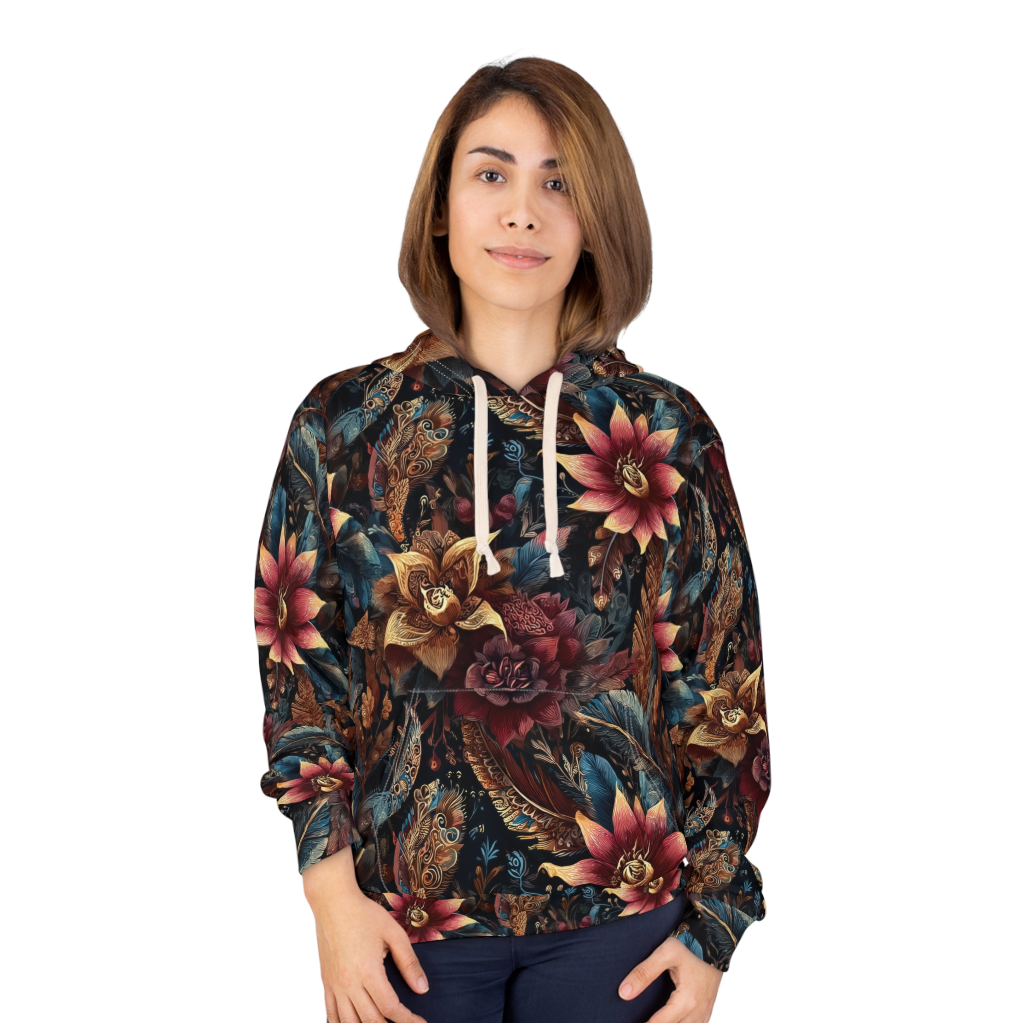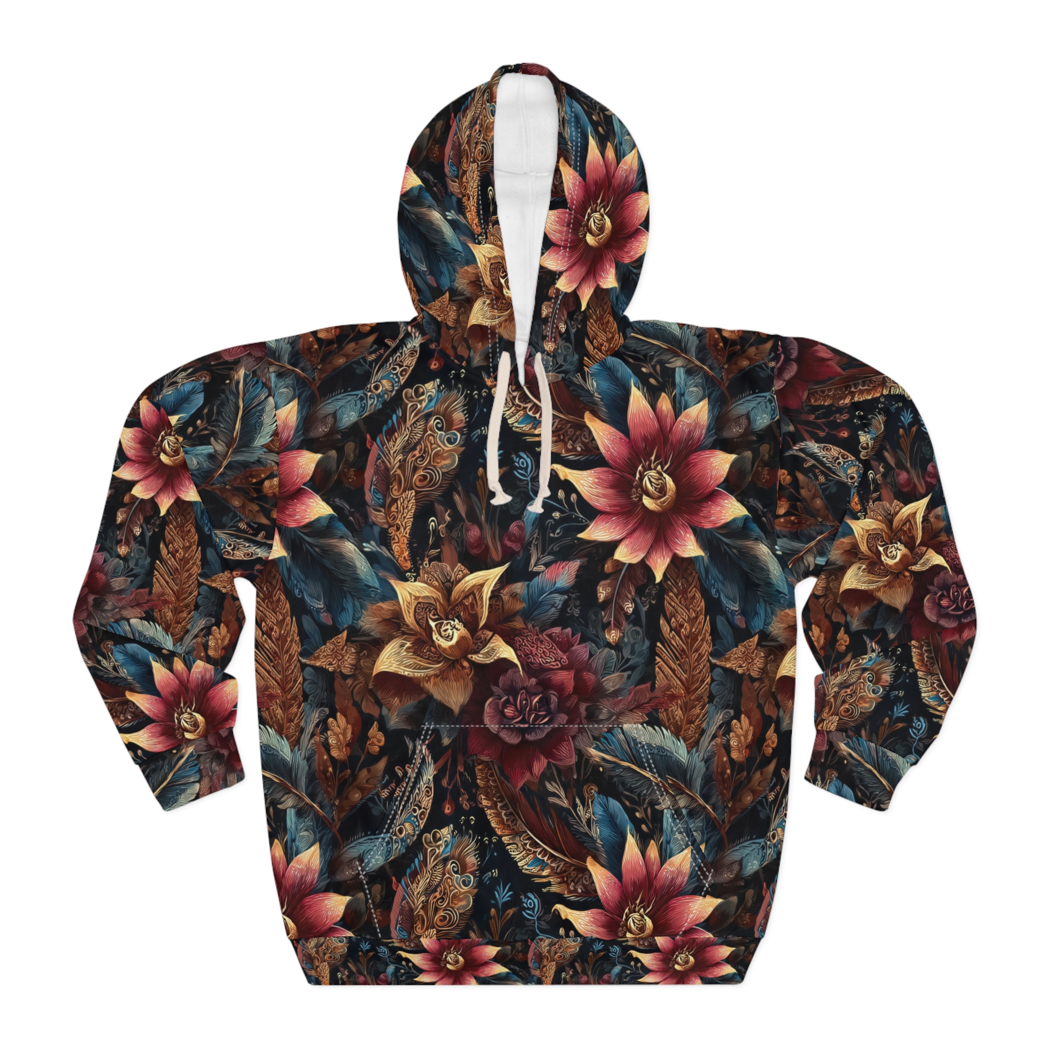 A richly patterned hoodie that feels like wrapping yourself in a late‑autumn garden at dusk. Deep jewel tones — teal leaves, rusted browns, and warm berry blossoms — bloom across every inch of fabric, creating an enveloping, artistic look that reads like wearable art. The roomy kangaroo pouch and adjustable hood add practical comfort while the medium‑weight polyester holds the print’s intense colors and drape. Wear it on crisp walks, quiet coffee shop afternoons, or while crafting and curled up with a book; it brings an intimate, moody atmosphere and a handcrafted, bohemian spirit to everyday life.