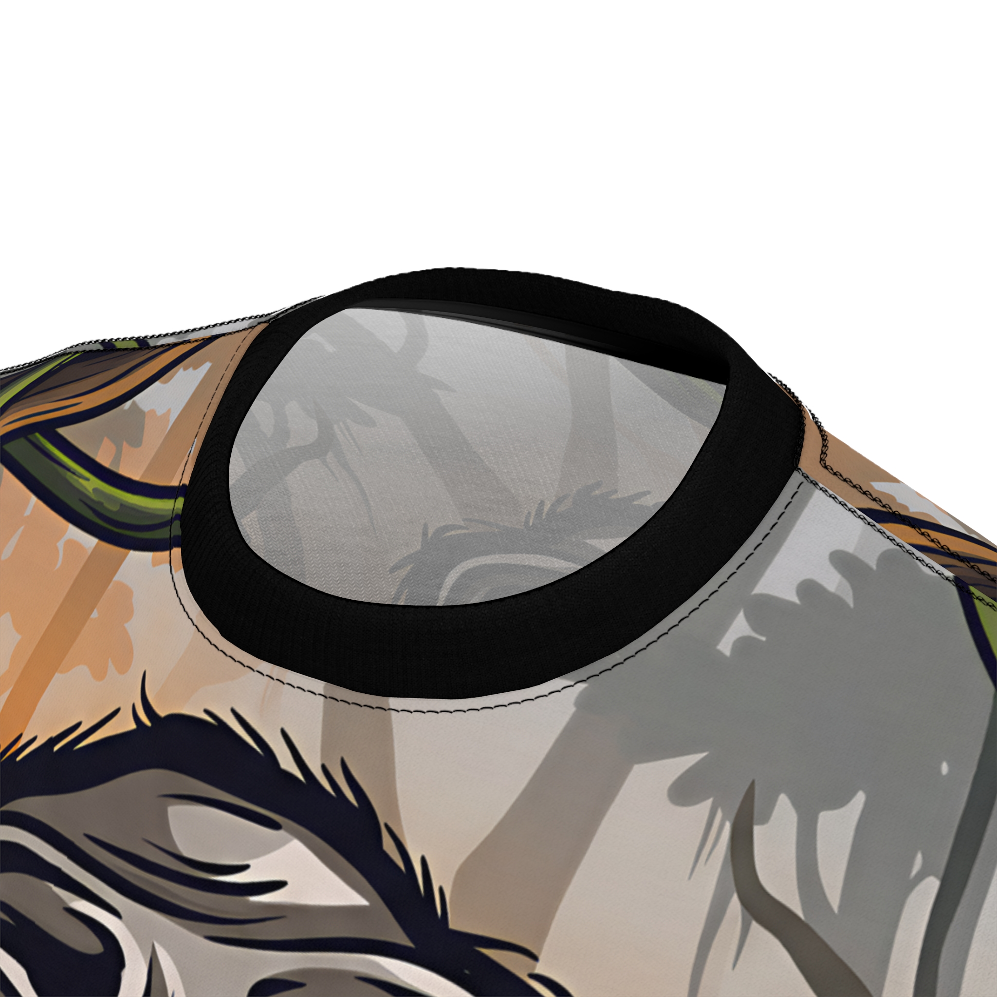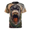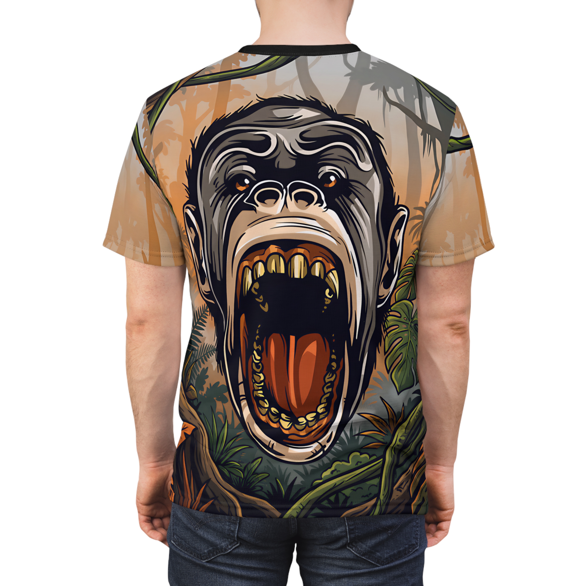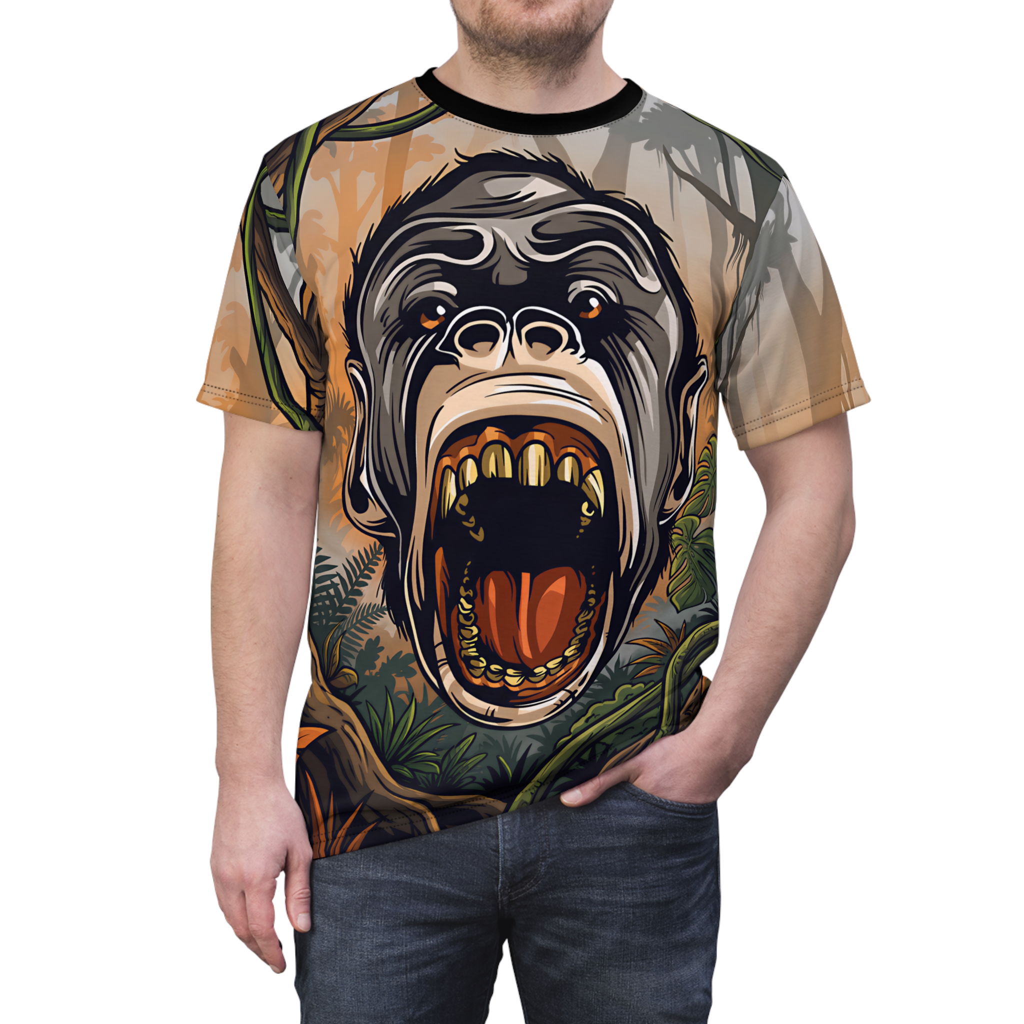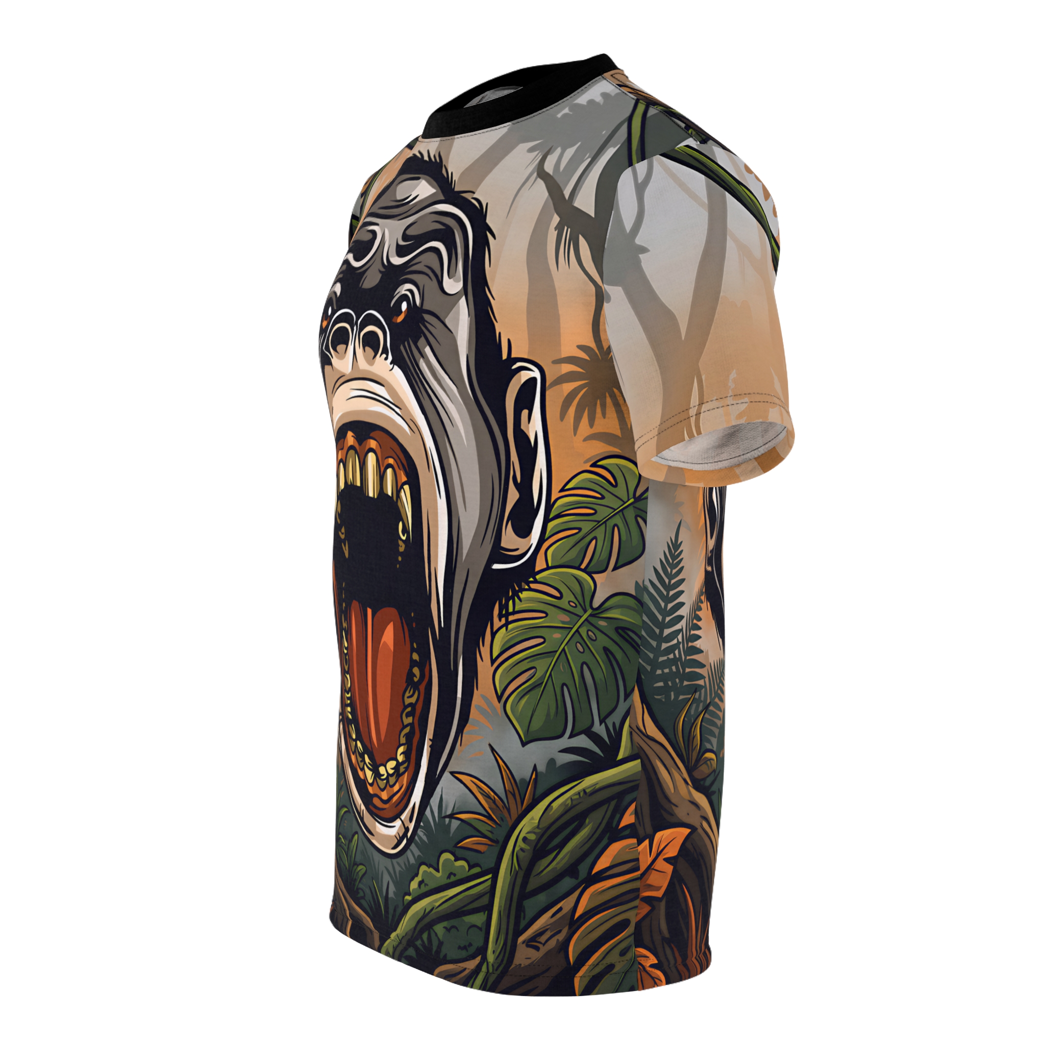 A bold, all-over print tee that puts raw jungle energy front and center. The full-coverage design wraps an expressive, roaring gorilla in lush vines and shadowed foliage — a shirt that reads like a fragment of a vivid adventure scene. Lightweight yet durable polyester keeps the colors bright and the print crisp, while the ribbed collar and shoulder taping hold the shape through wear. Wear it when you want to stand out: at outdoor gatherings, music nights, or while exploring city streets. It sits comfortably in a regular fit and comes tagless for irritation-free wear.
