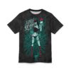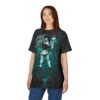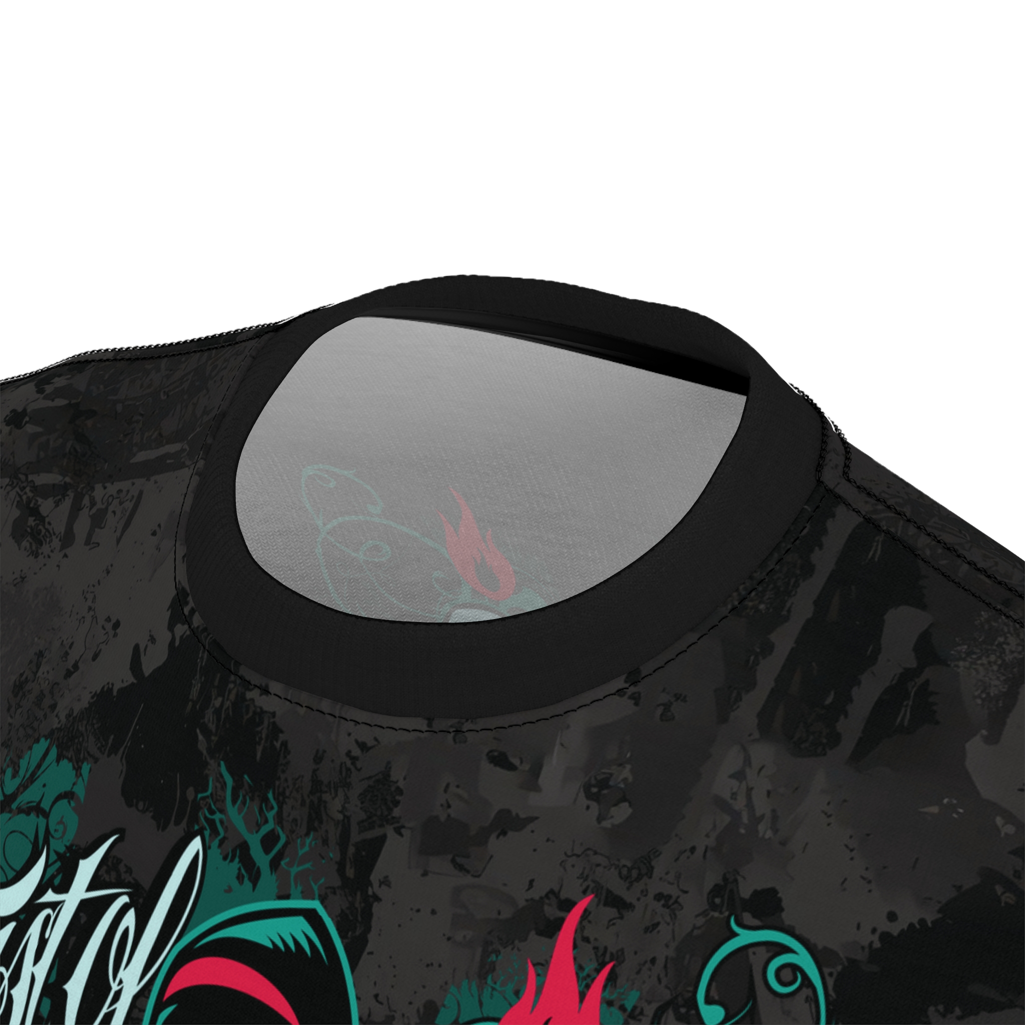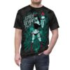 This all-over print tee wraps a bold, gothic-punk illustration across every inch — a teal-and-red vixen holding a flame, surrounded by writhing vines and skull motifs against a charcoal camo background. It feels like late-night city streets, neon buzzing and alleyways whispering secrets. Wear it when you want to lean into moodier style: layered under a leather jacket, or solo with ripped jeans and tall socks for an unapologetic statement. The graphic sits large and unapologetic, giving the wearer a confident, slightly dangerous energy that fits evenings out, music shows, and creative meetups.