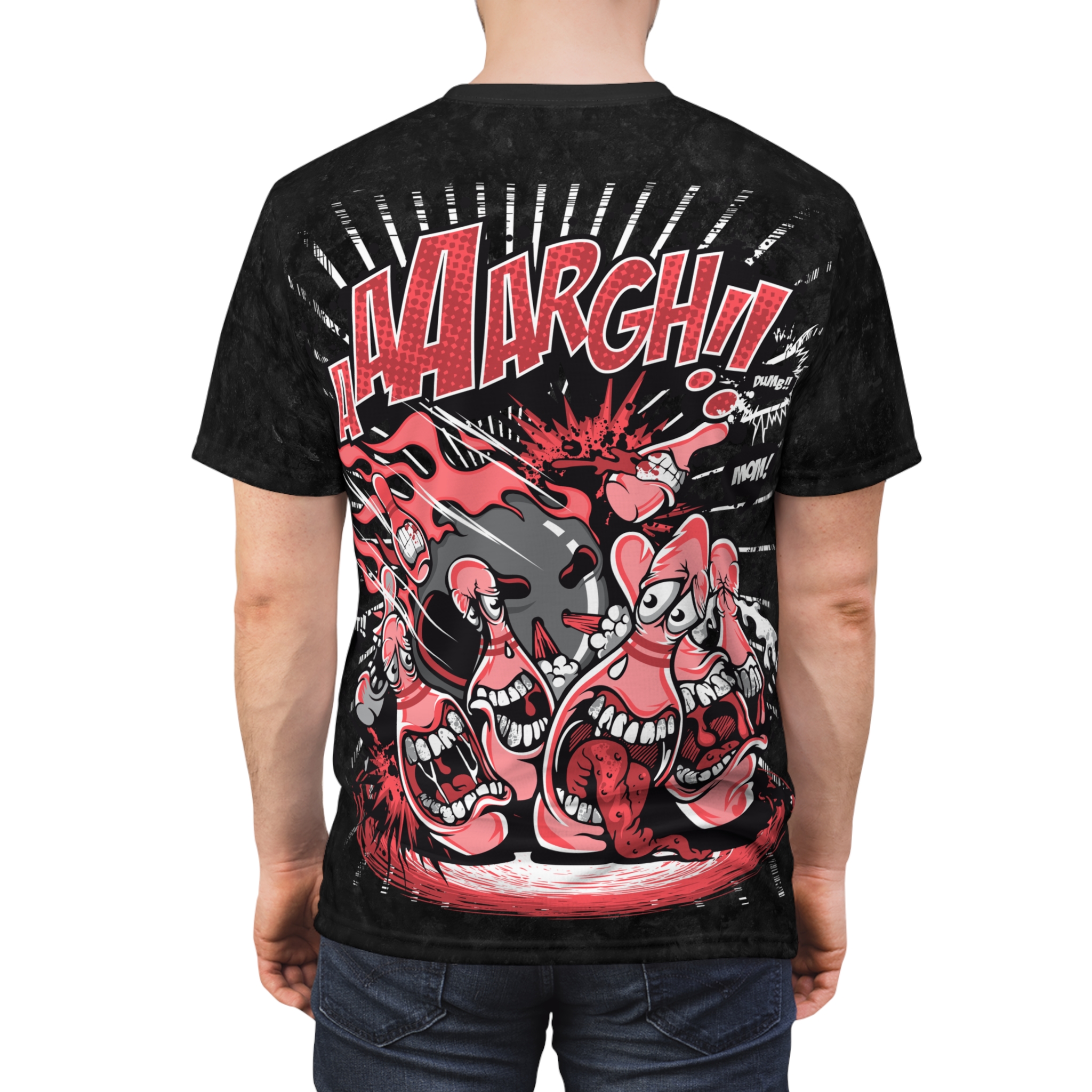 This all-over printed tee brings loud, chaotic energy to any casual wardrobe. The bold comic-style artwork — jagged lettering, exaggerated mouths, and splattered ink — reads like a frantic panel from an underground zine. The black, slightly marbled background makes the red and gray illustration pop, giving the shirt a gritty, street-ready attitude. Lightweight and quick-drying polyester keeps the print vivid and the fit comfortable, so it wears well during long shows, skate sessions, or late-night meetups. Slip it on when you want to stand out without saying a word — it’s visual storytelling for those who live loud and move fast.