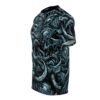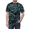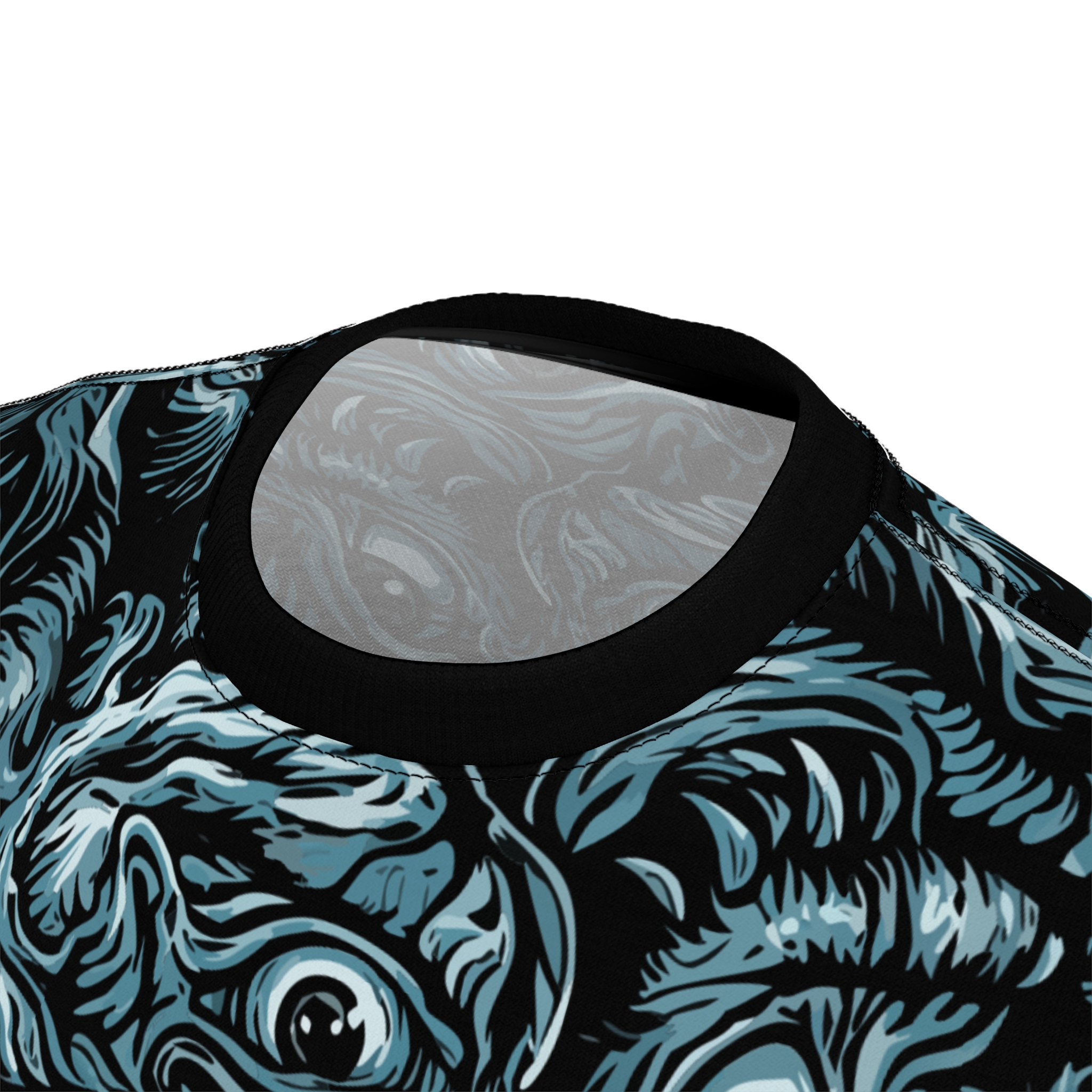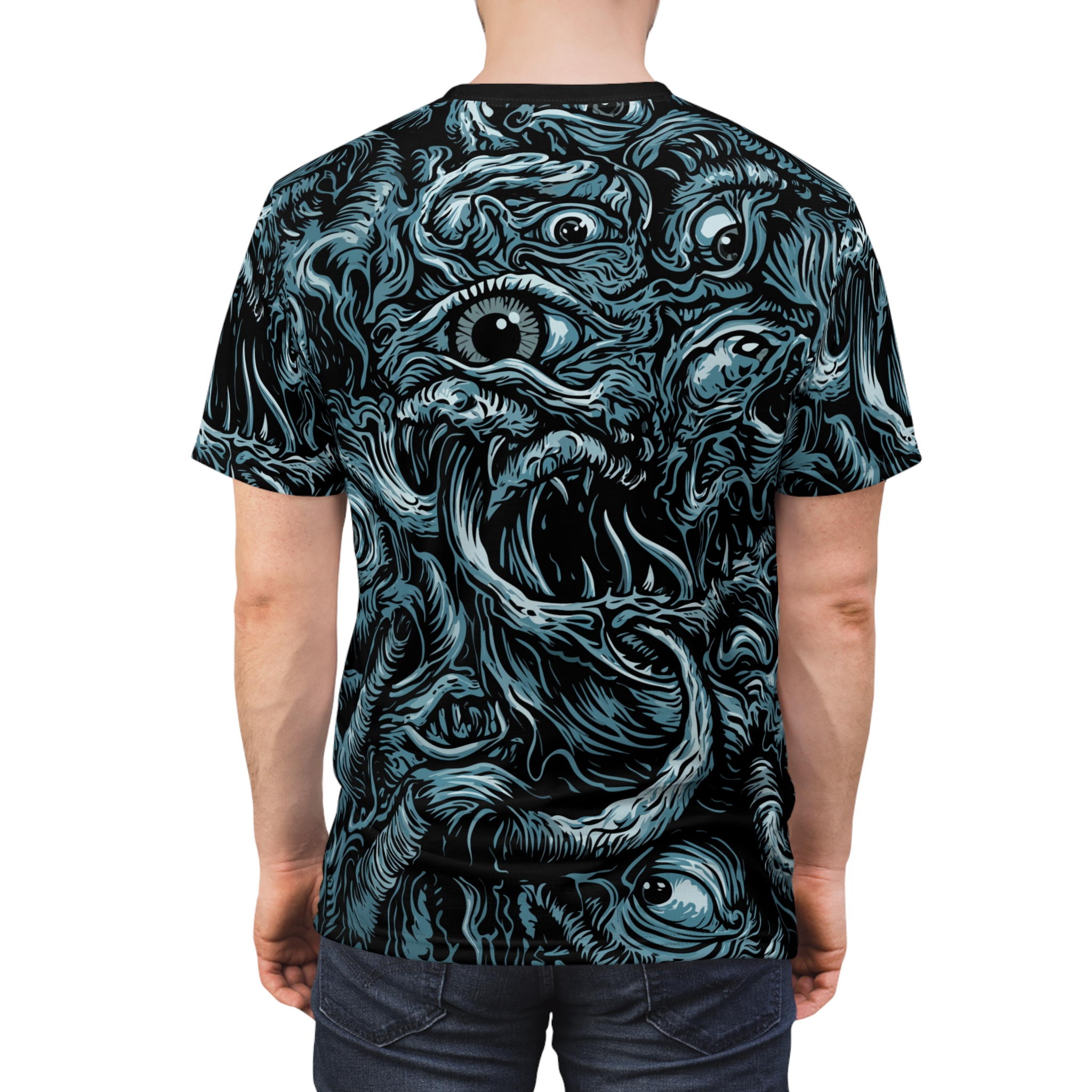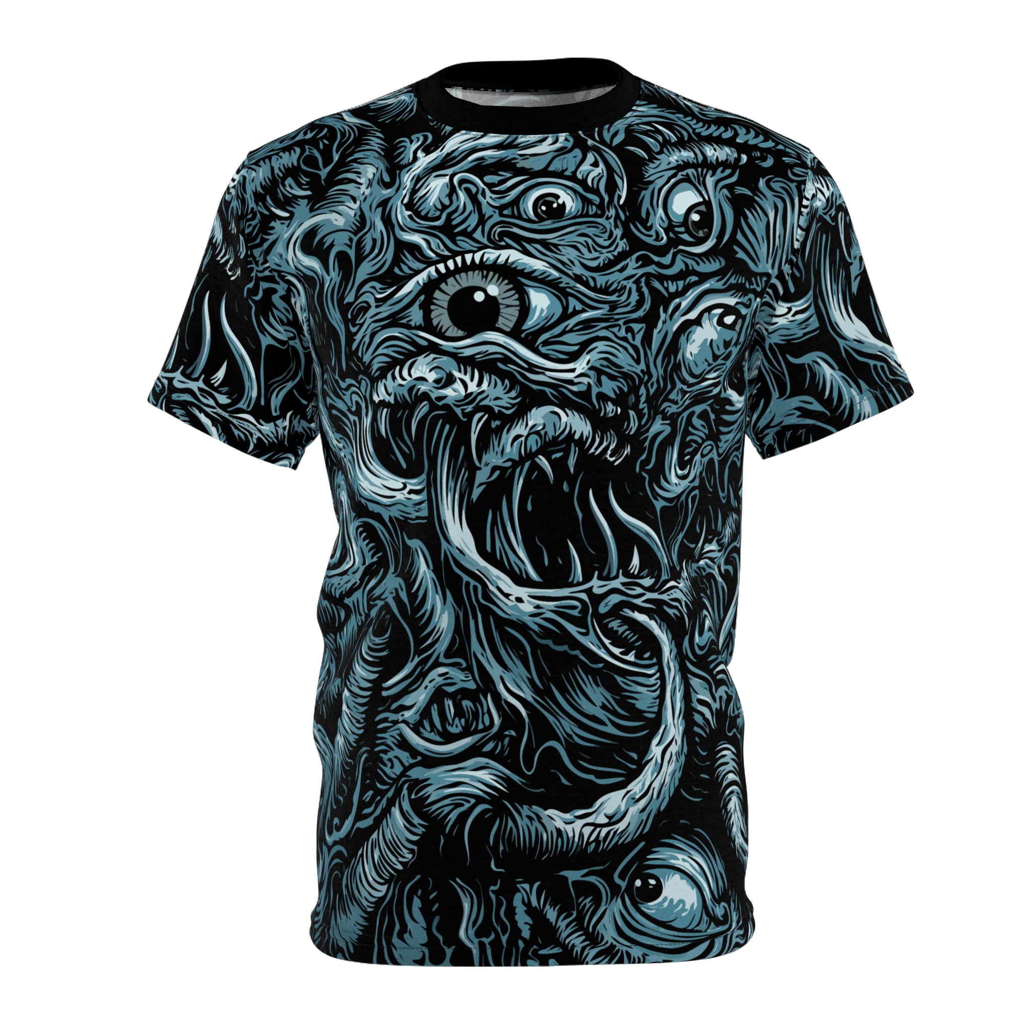This all-over print tee wraps you in a single, striking vision—swirling, monstrous forms and staring eyes rendered in moody blues and charcoal. Lightweight but resilient polyester keeps the art sharp and the fit consistent wash after wash. Wear it under a leather jacket for late-night shows, on gallery nights when you want to start conversations, or at horror-genre meetups where every inch of your outfit speaks the same language.