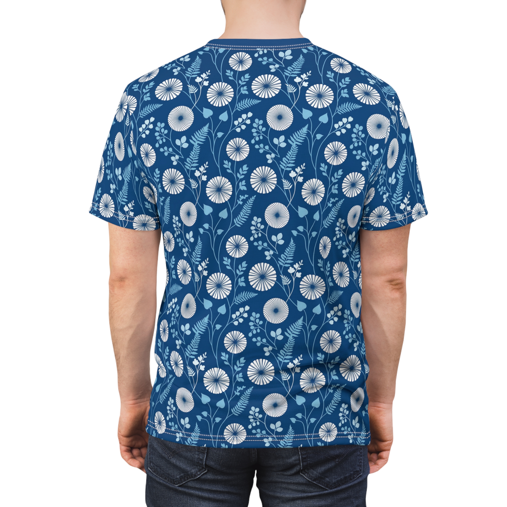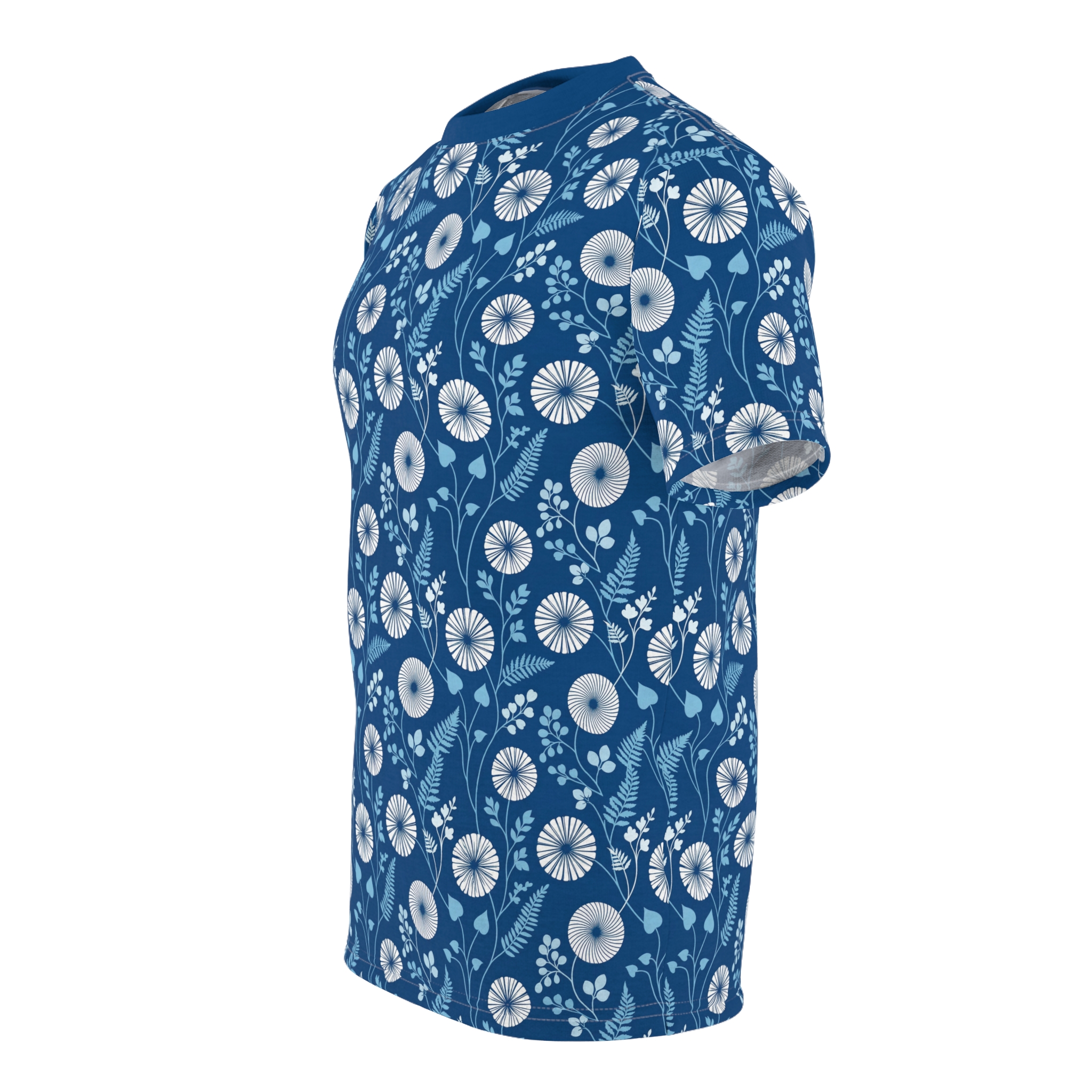 This lightweight, all-over printed tee wraps you in a calm, coastal garden. Soft blue tones and delicate white florals drift across the fabric, creating a quietly patterned surface that reads both vintage and modern. Wear it on cool mornings with your favorite jeans or layer it under a jacket for evenings by the water. The breathable polyester keeps the print vivid and the fit steady, so the shirt moves with you during long walks, market runs, or slow coffee breaks. It feels like a familiar summer sketch—easy, composed, and endlessly wearable for days when you want a gentle, artful statement without shouting for attention.