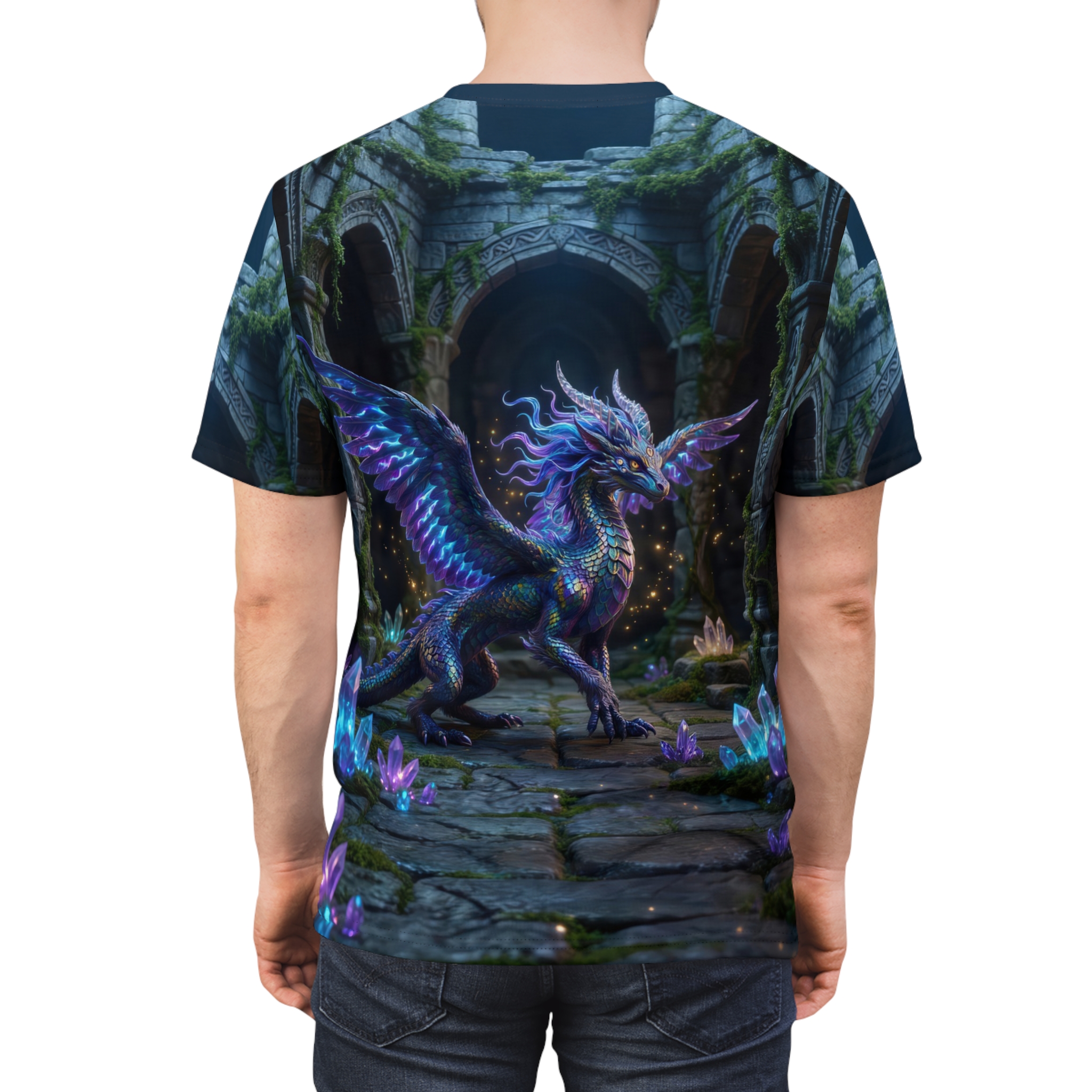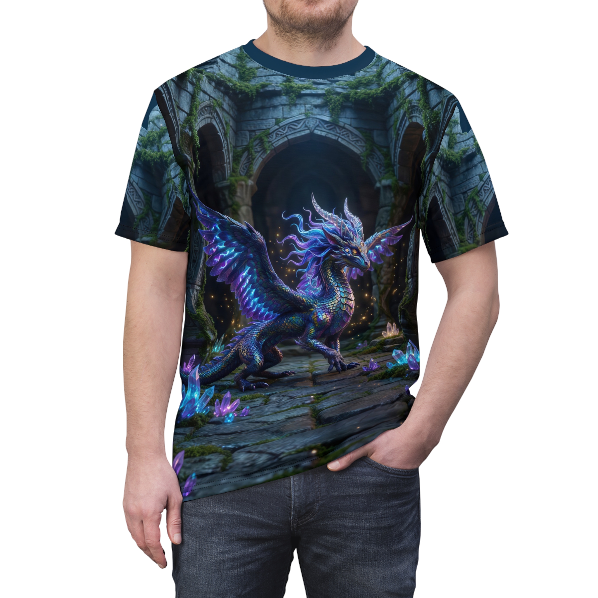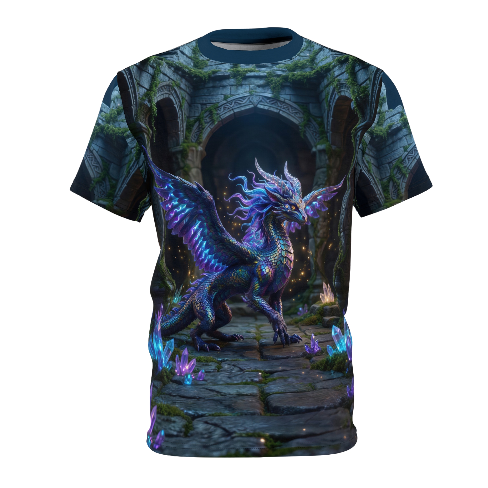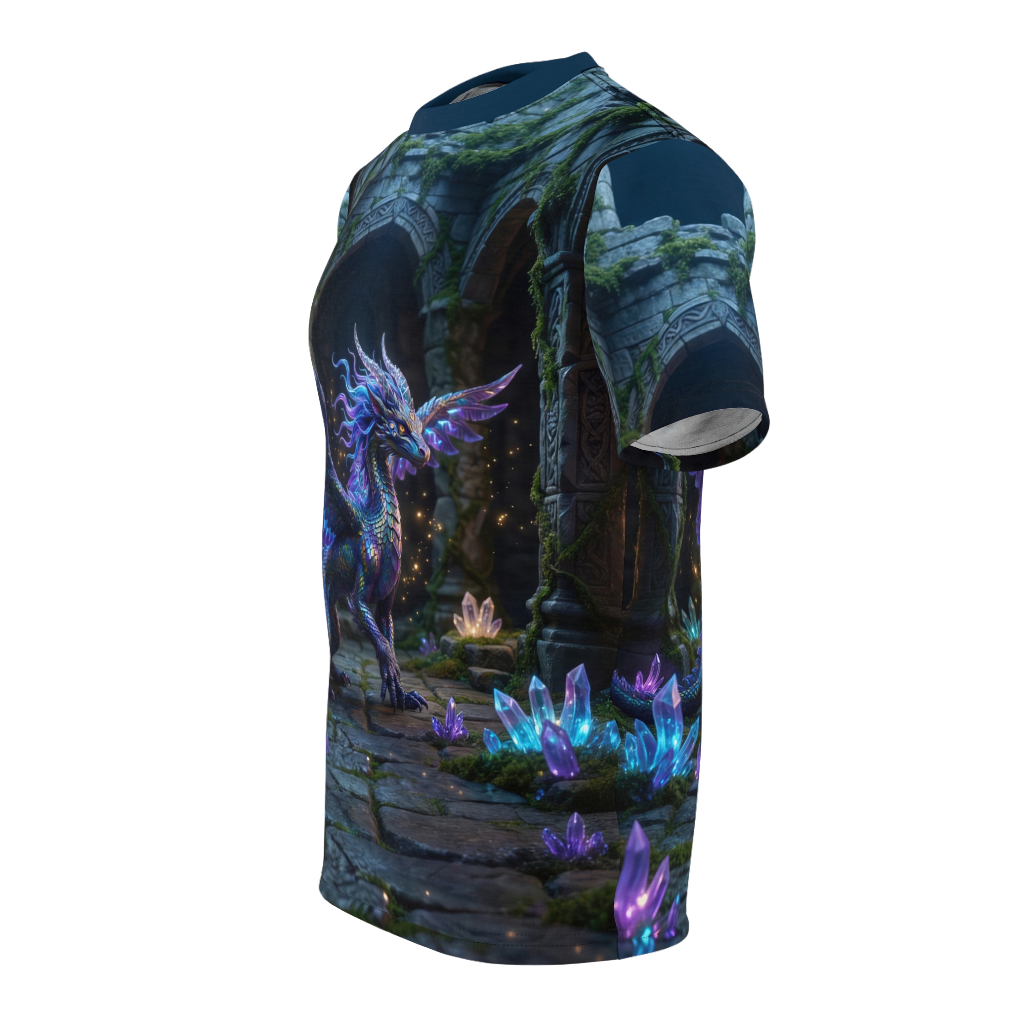 Step into a moonlit ruin where magic still hums beneath cracked stone. This all-over print tee wraps you in a luminous dragon’s hush—iridescent scales, glimmering crystals, and moss-grown arches that feel like the start of an underground quest. Wear it on slow evenings with friends or while sketching new worlds; its soft, quick-dry polyester keeps colors electric and details crisp, so the scene stays alive through long days and late-night creative sprints. It reads like a secret kept between you and the wild places you wander in your mind—mystical, steady, and quietly bold.
