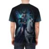 Wrap yourself in moonlit magic with this all-over printed tee that brings a fantasy scene to life. A serene, winged fae stands beside a noble white unicorn, their cool blues and deep forest tones flowing across the fabric. The print feels like a quiet moment in an enchanted glade—mystery, calm, and gentle strength combined. Wear it when you want to carry a little otherworldly calm with you: for late-night gaming sessions, convention days, or whenever you want an outfit that whispers stories instead of shouting them. The breathable polyester keeps the colors vivid and the silhouette smooth, while the regular fit and tagless neckline keep comfort front and center. This shirt lives in the wardrobe of someone who loves lore, subtle drama, and art that sparks imagination.
