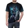Wrap yourself in moonlit magic with this all-over printed tee that brings a fantasy scene to life. A serene, winged fae stands beside a noble white unicorn, their cool blues and deep forest tones flowing across the fabric. The print feels like a quiet moment in an enchanted glade—mystery, calm, and gentle strength combined. Wear it when you want to carry a little otherworldly calm with you: for late-night gaming sessions, convention days, or whenever you want an outfit that whispers stories instead of shouting them. The breathable polyester keeps the colors vivid and the silhouette smooth, while the regular fit and tagless neckline keep comfort front and center. This shirt lives in the wardrobe of someone who loves lore, subtle drama, and art that sparks imagination.