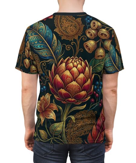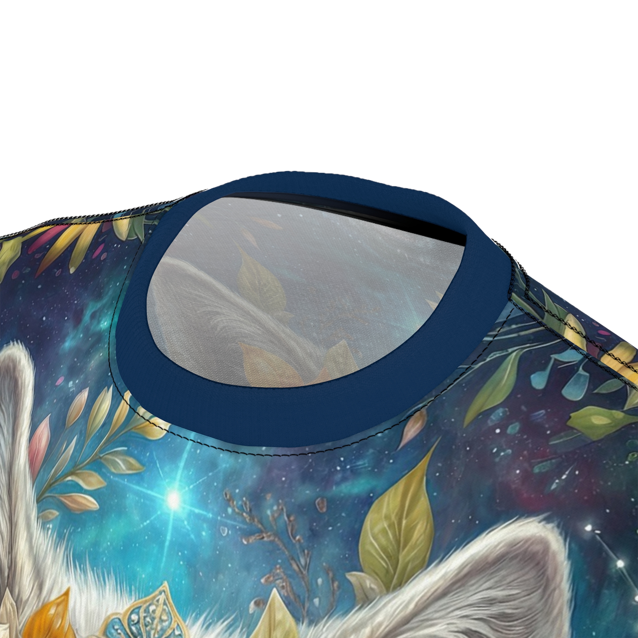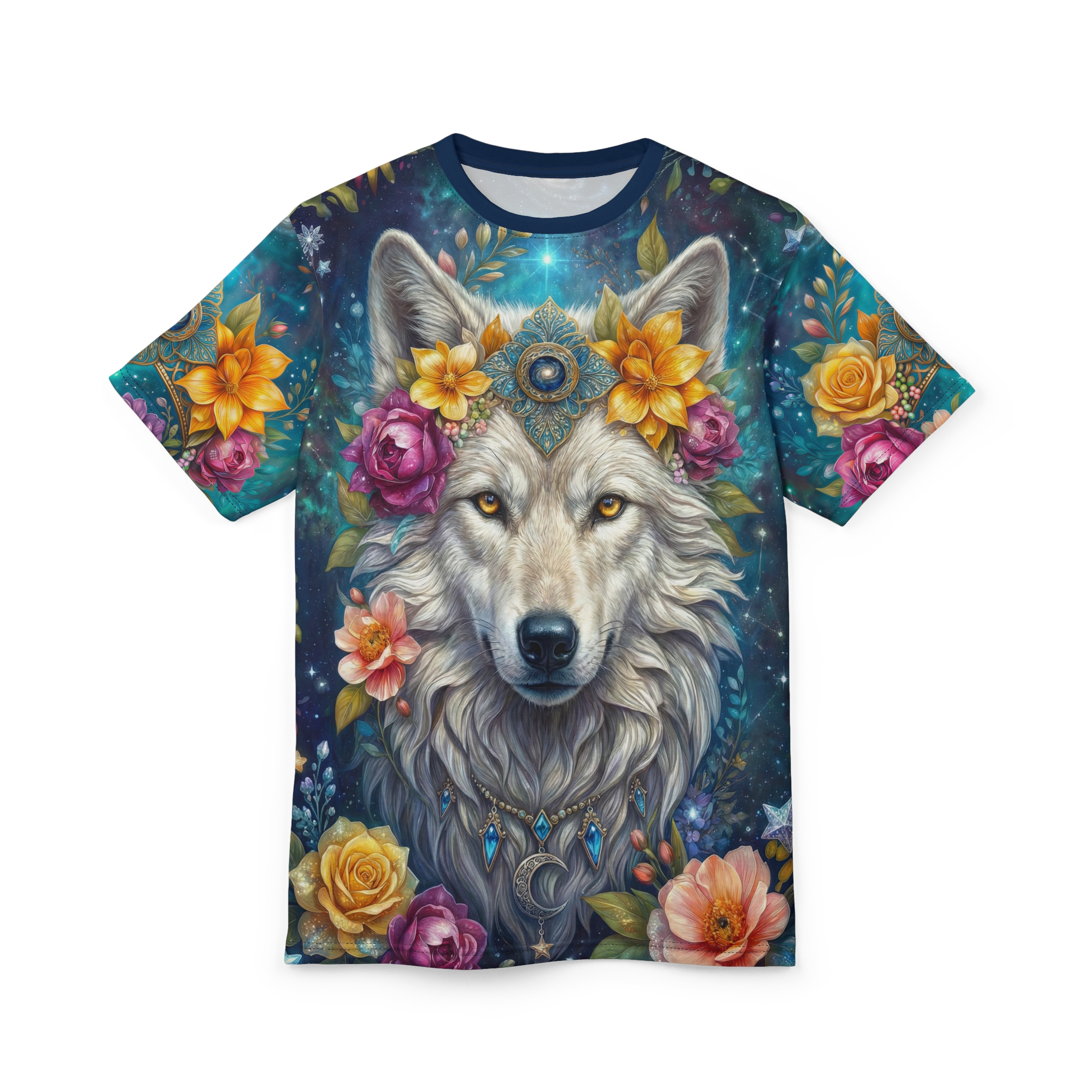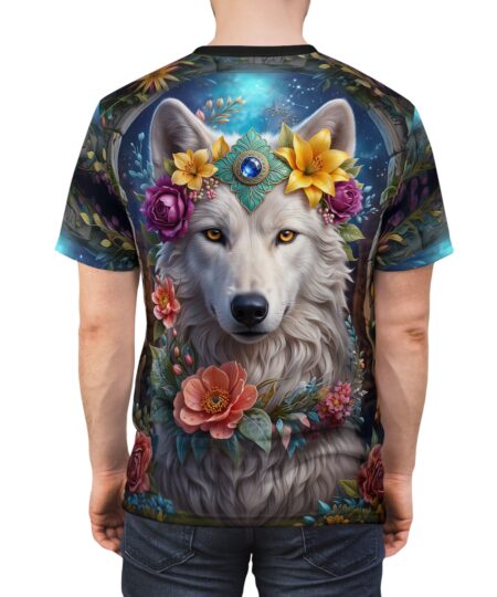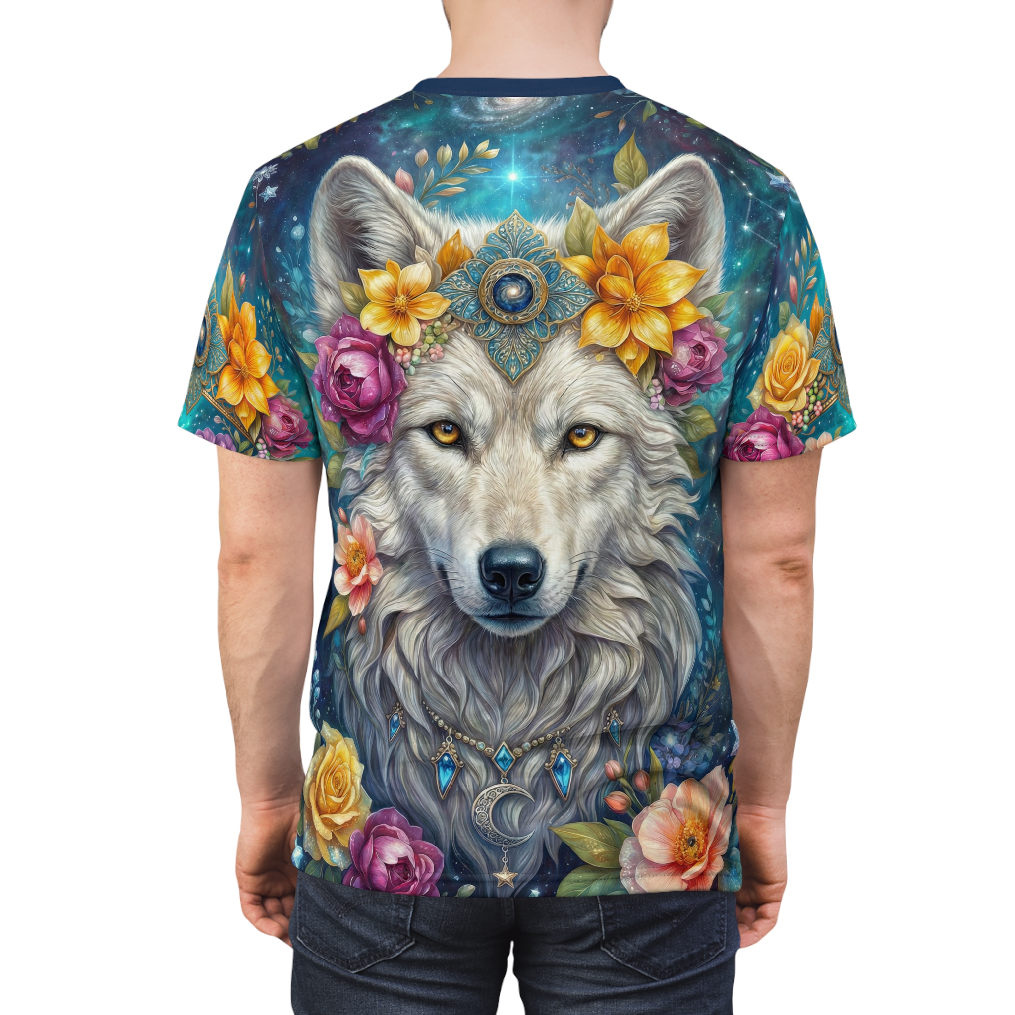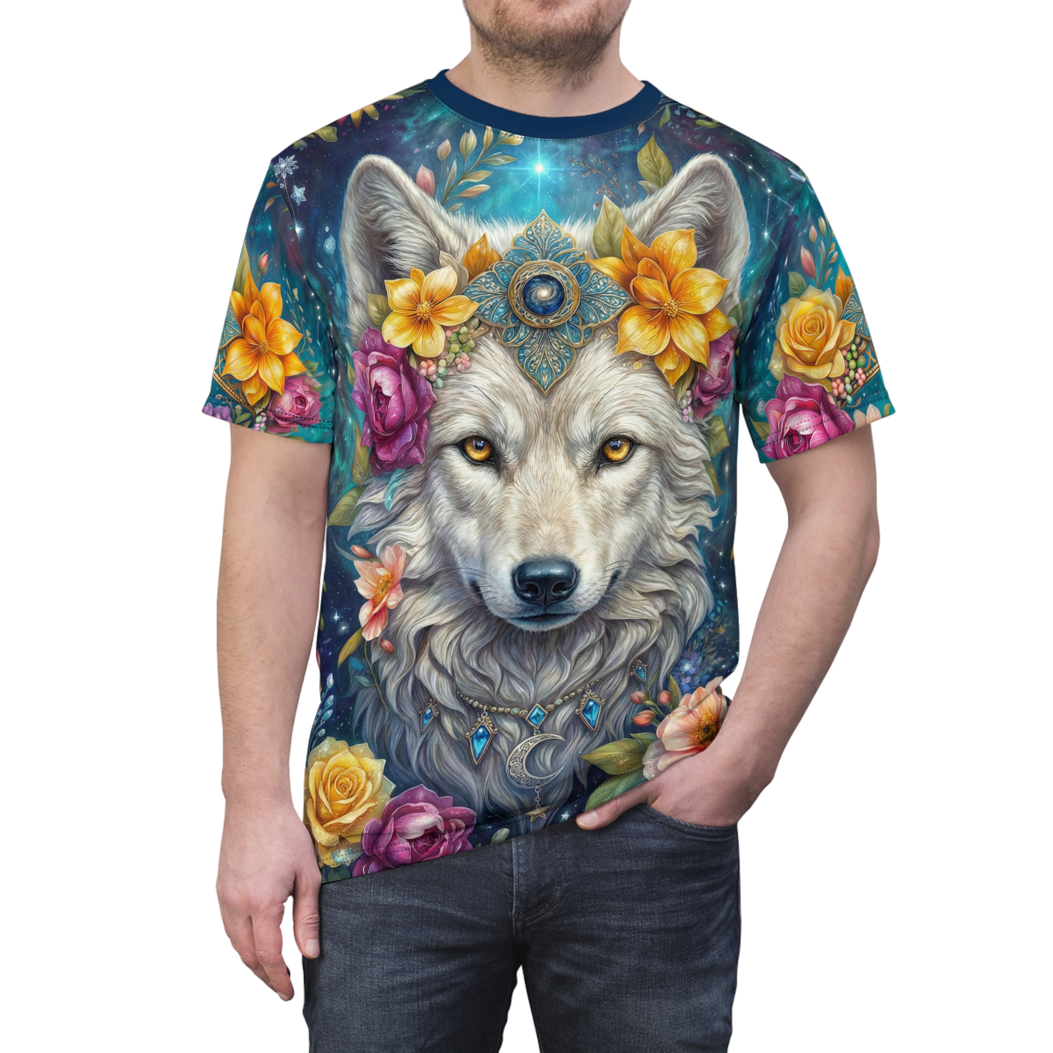This all-over print tee brings a touch of wild mysticism to everyday wear. An intricately detailed wolf portrait stares forward from a swirl of stars and jewel tones, framed by lush roses and golden blooms. The imagery reads like a talisman — protective, serene, and quietly fierce — so the shirt becomes a wearable vignette: a morning walk through fog, a late-night bonfire with friends, or a gallery visit where you’ll catch curious glances. The breathable, quick-drying polyester keeps the colors vibrant and the fit feeling light, so the design stays the focus while you move. Stylistically it sits between nature-inspired art and boho fantasy, speaking to people who collect meaningful visuals and layered outfits rather than trends.