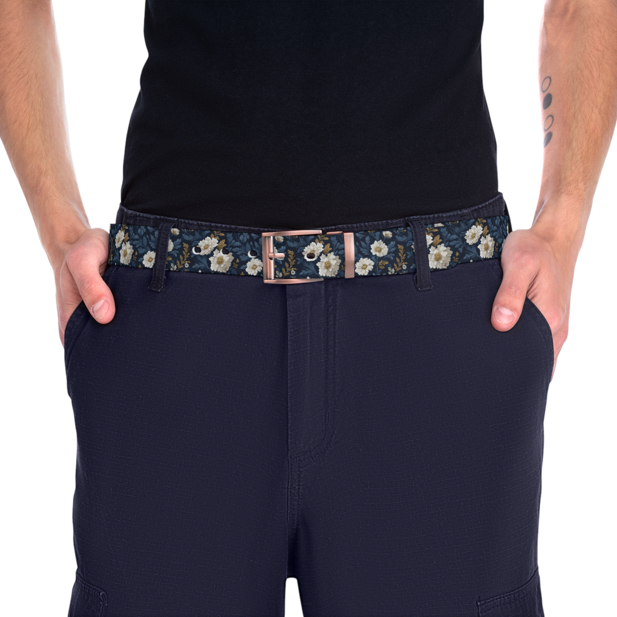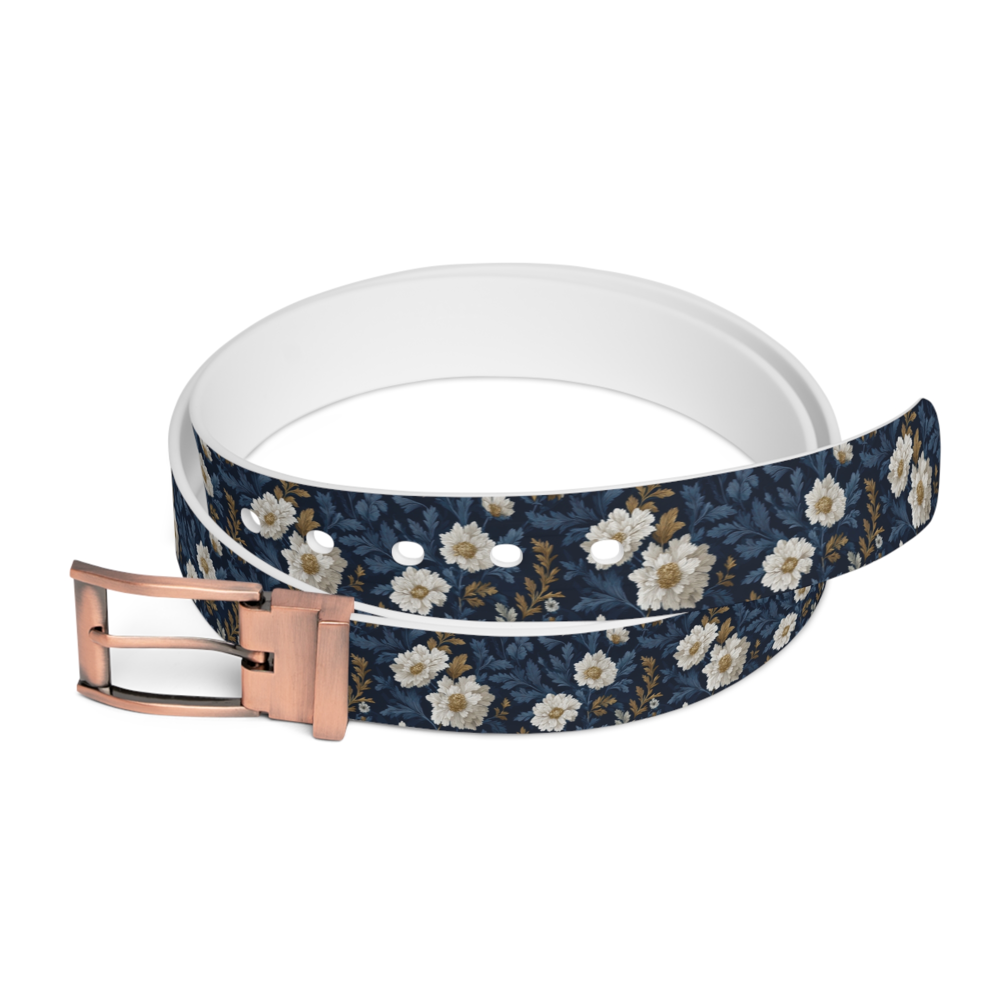 A waterproof, cut-to-size belt that brings a touch of hand-painted florals to everyday wear. The slim TPU strap feels smooth against your jeans and holds bright, detailed printing without fading, so the navy background and cream blossoms stay crisp through rain, travel, and daily life. The removable buckle and three metal finishes let you customize the look — swap to gunmetal for a muted edge or bronze for a warmer, vintage vibe. Lightweight and durable, this belt slips into weekend adventures or weekday errands, adding a subtle, artful accent to high-waisted denim or a simple dress.
