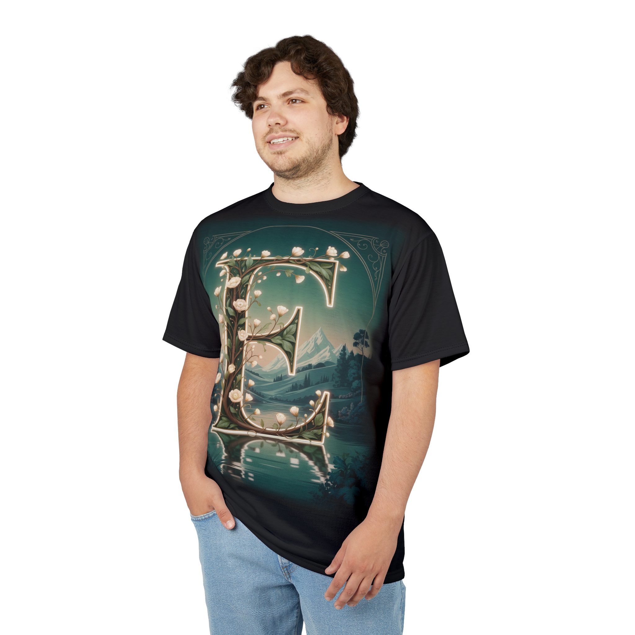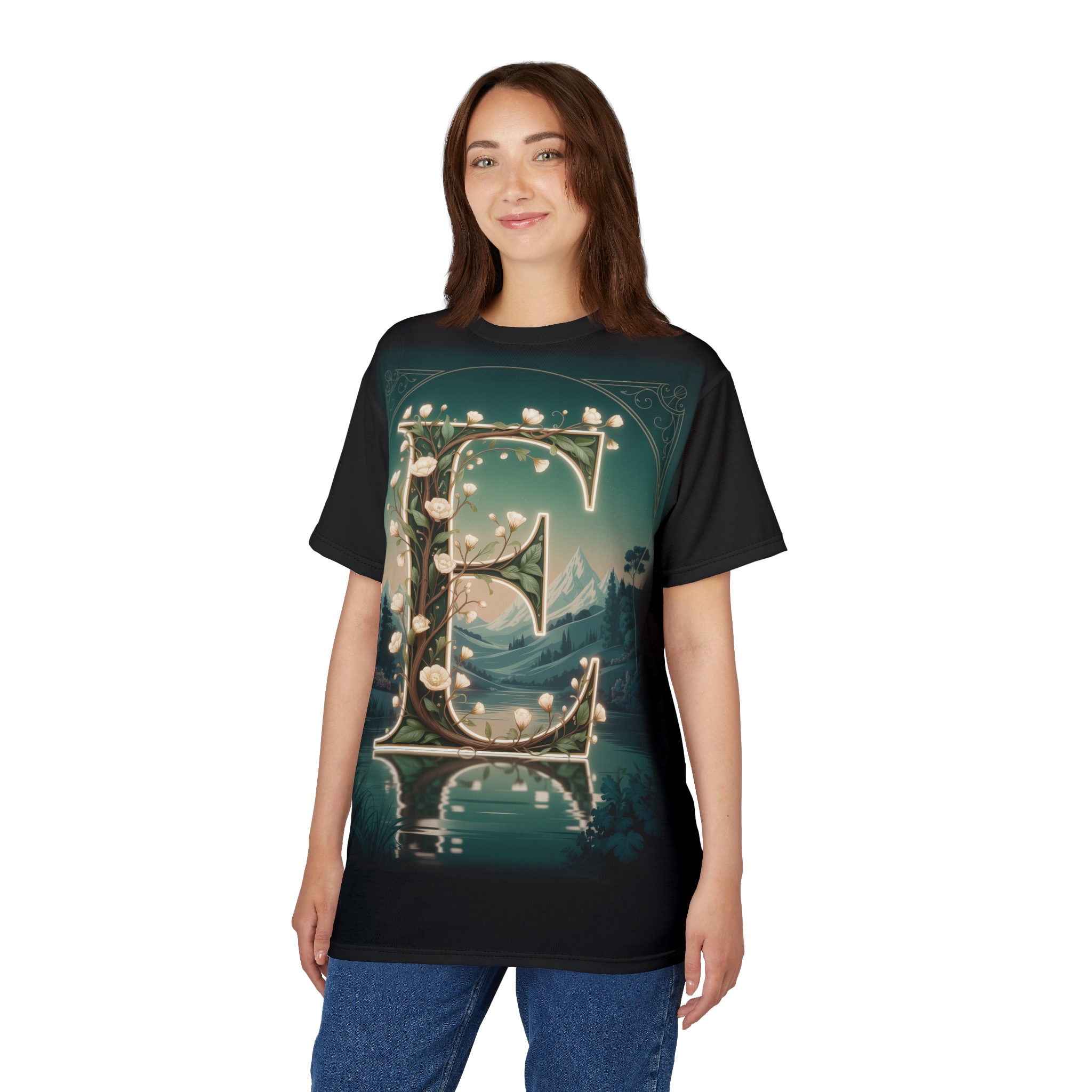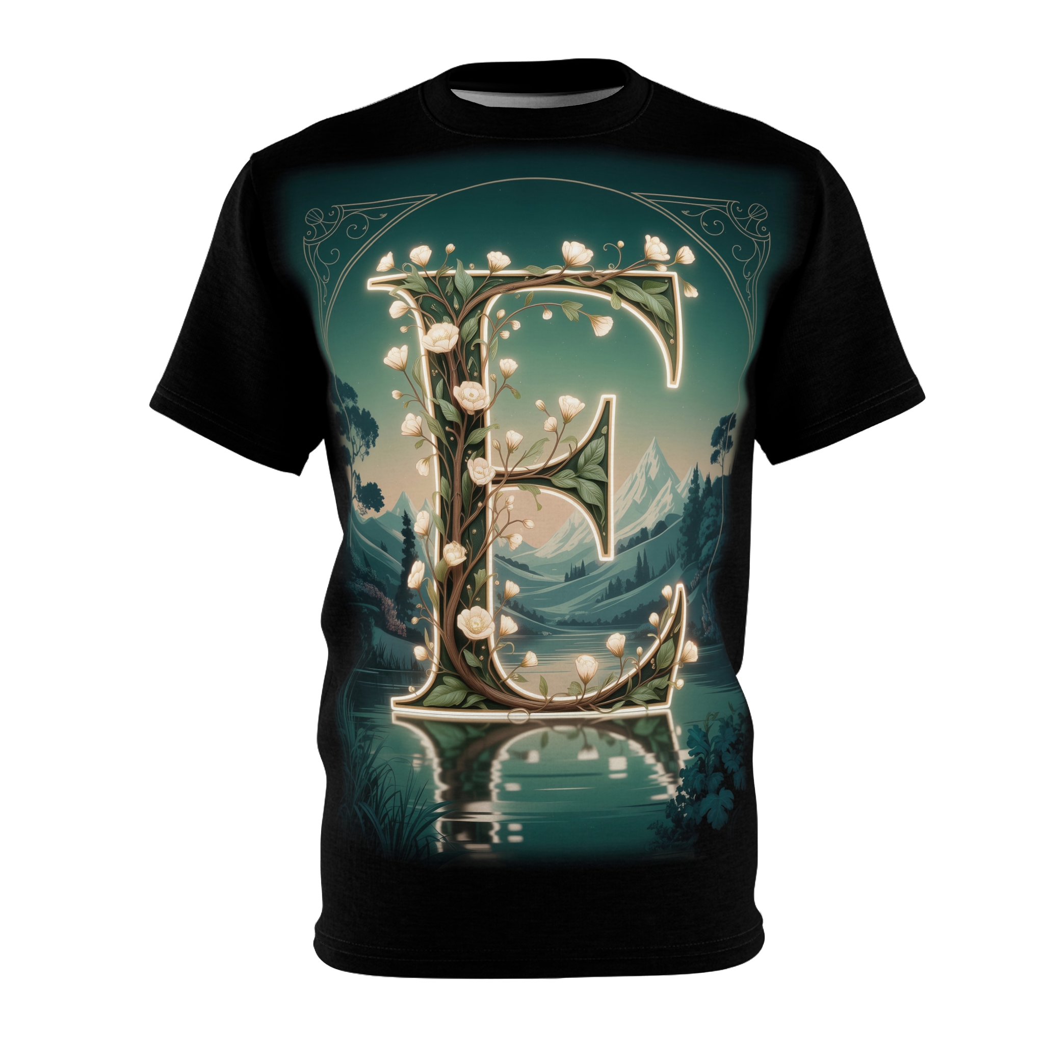 Personalized Forest Fairy Tale “E” Tee, Unisex All Over Print T-Shirt, Custom Initial Apparel, Magical Gift, Fantasy Shirt, Nature Lover T-shirt