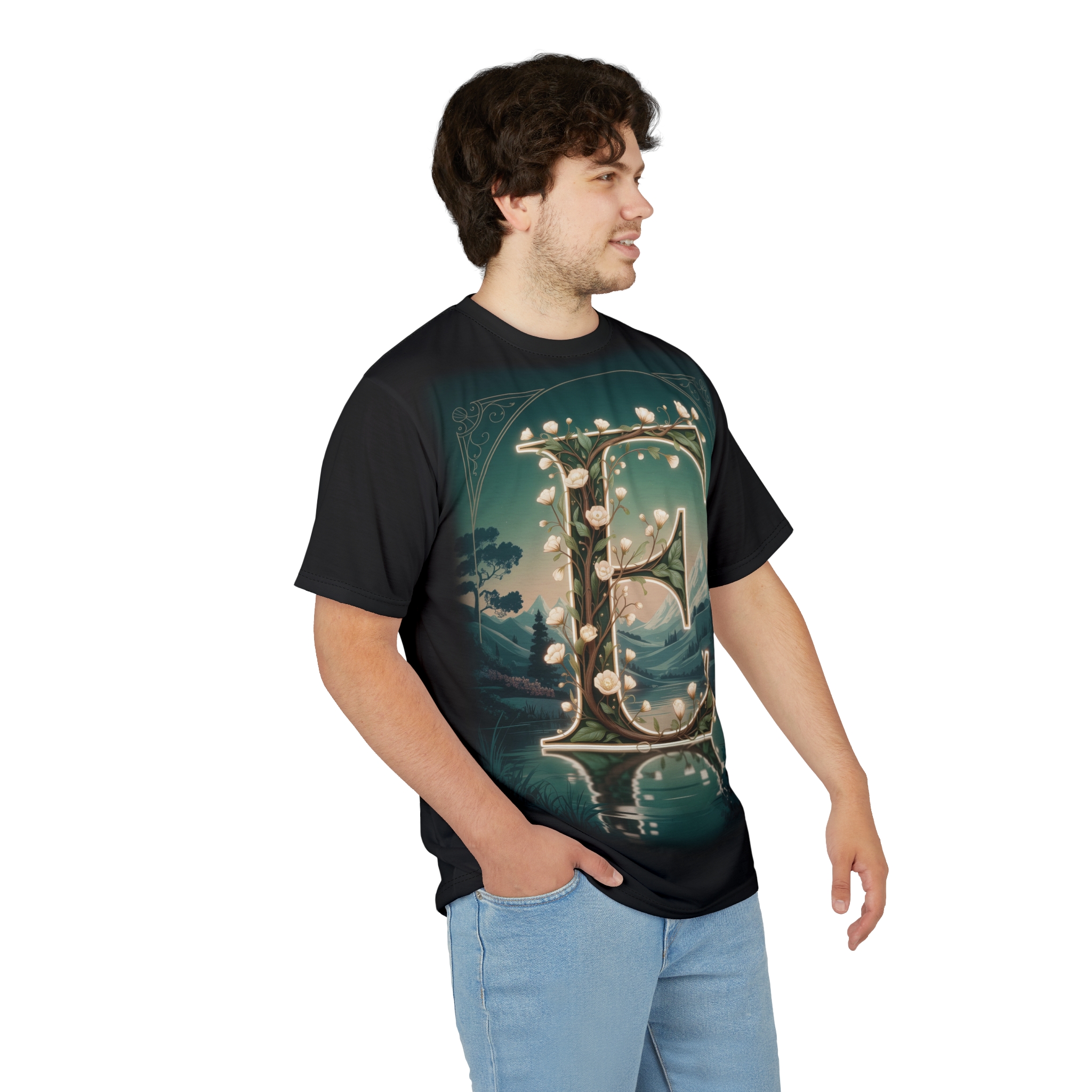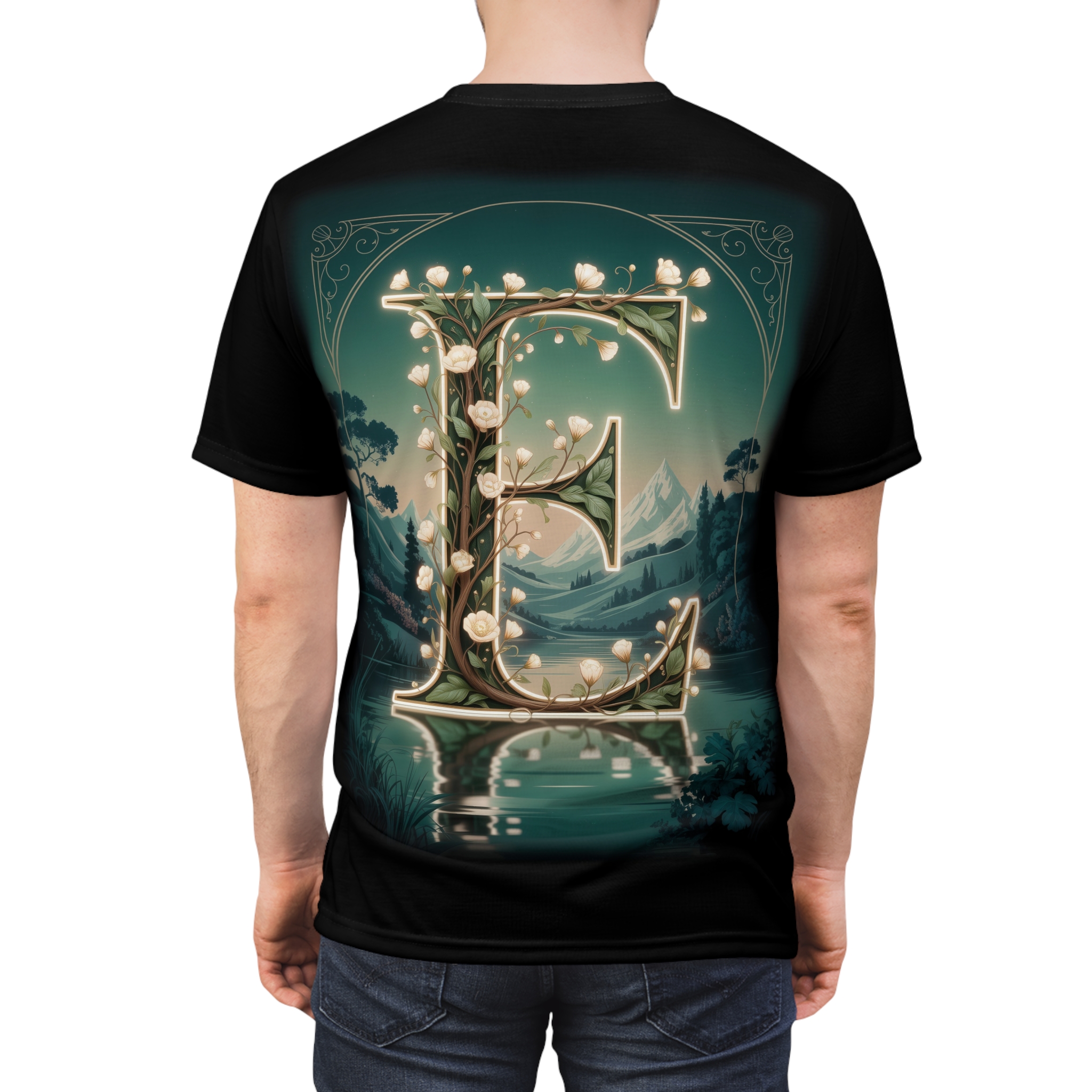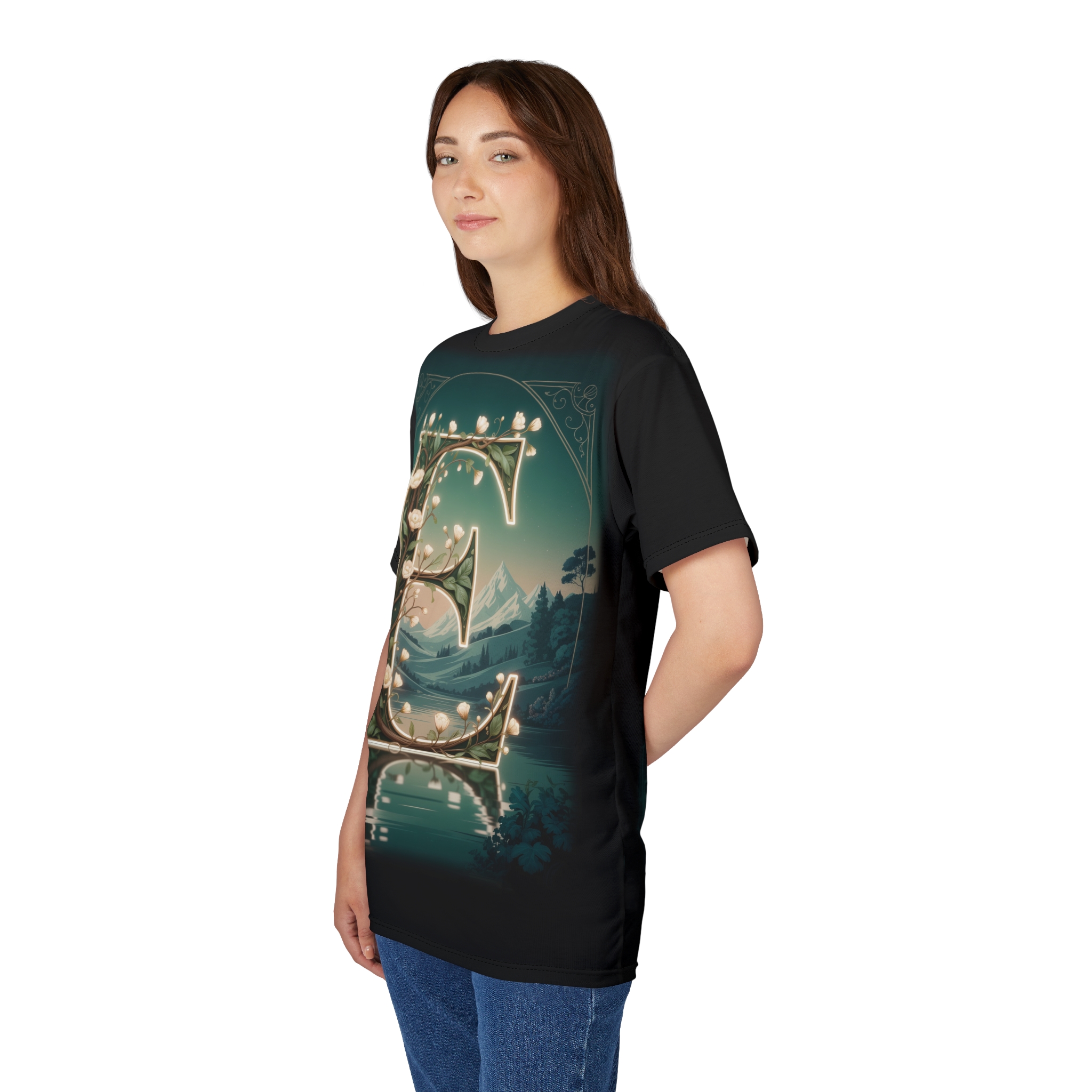 Personalized Forest Fairy Tale “E” Tee, Unisex All Over Print T-Shirt, Custom Initial Apparel, Magical Gift, Fantasy Shirt, Nature Lover T-shirt