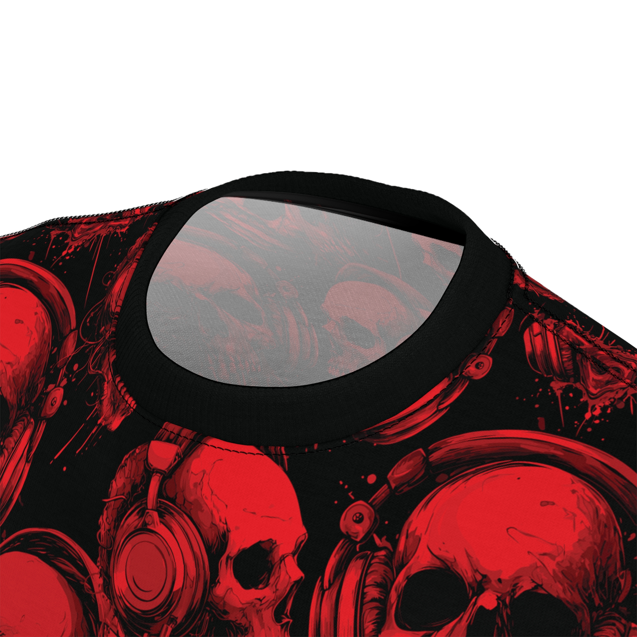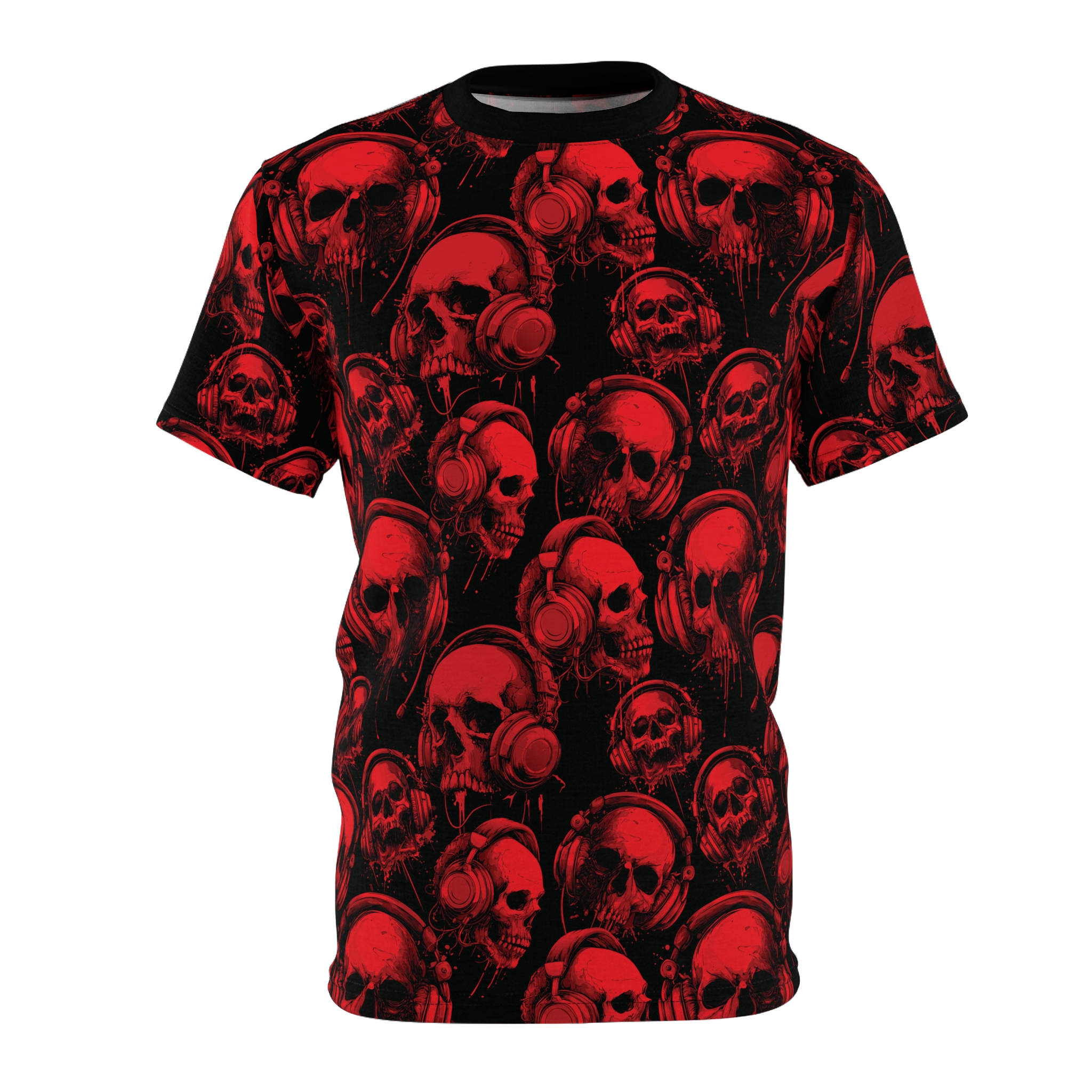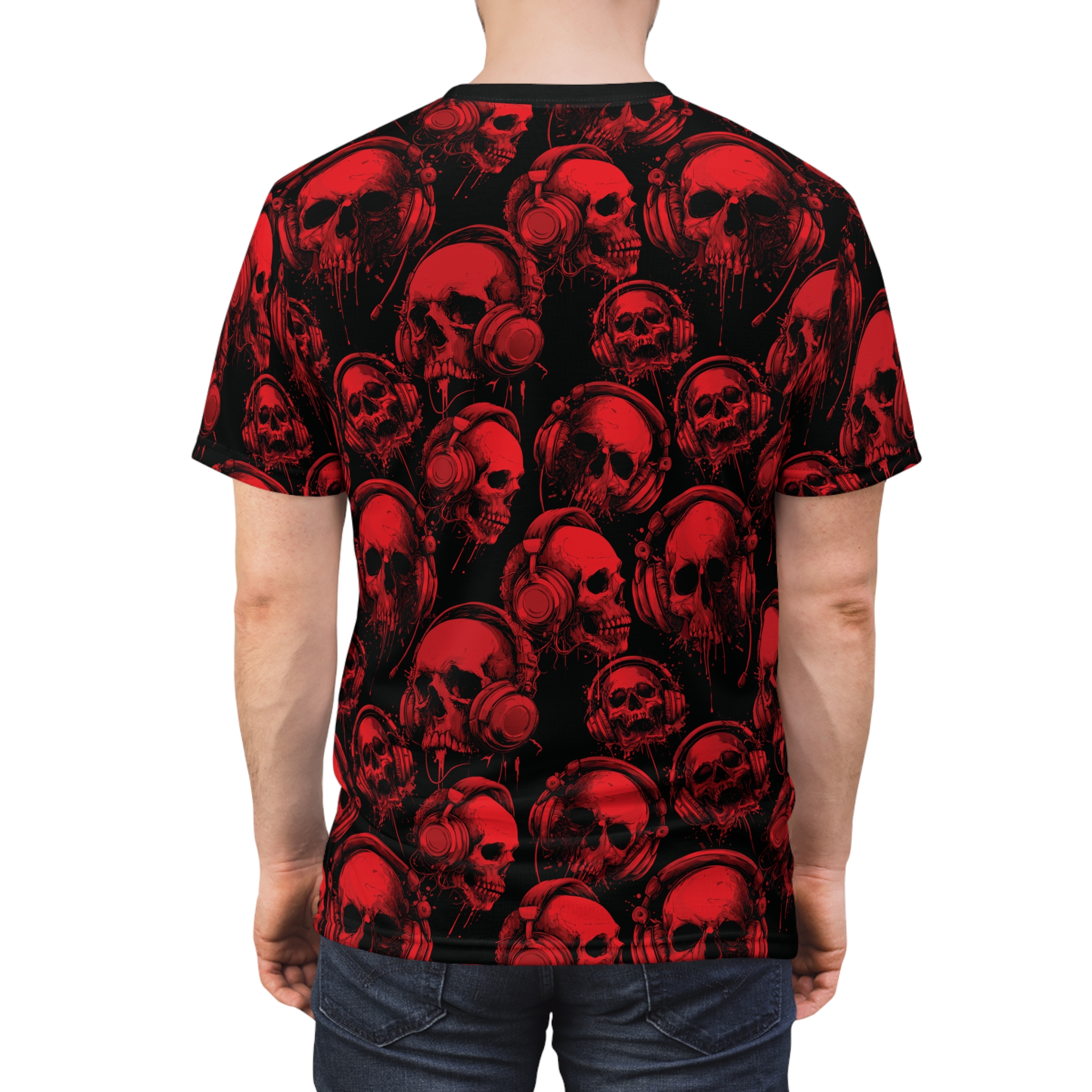 This all-over print tee wraps bold, blood-red skulls and shadowed headphones across the fabric for a look that’s equal parts edgy and expressive. Lightweight polyester keeps the print vibrant and the shirt dry, while a regular, true-to-size cut and ribbed collar make it comfortable for everyday wear. It sits naturally in the rotation of someone who lives loud—played-in leather jackets, late-night shows, and road-trip soundtracks. The seamless, all-over design maintains visual impact from every angle, and the sturdy construction holds its shape even after repeat wears and washes. Wear it to underground gigs, long drives, or whenever you want your style to speak like a scratched vinyl track—dark, loud, and unapologetic.