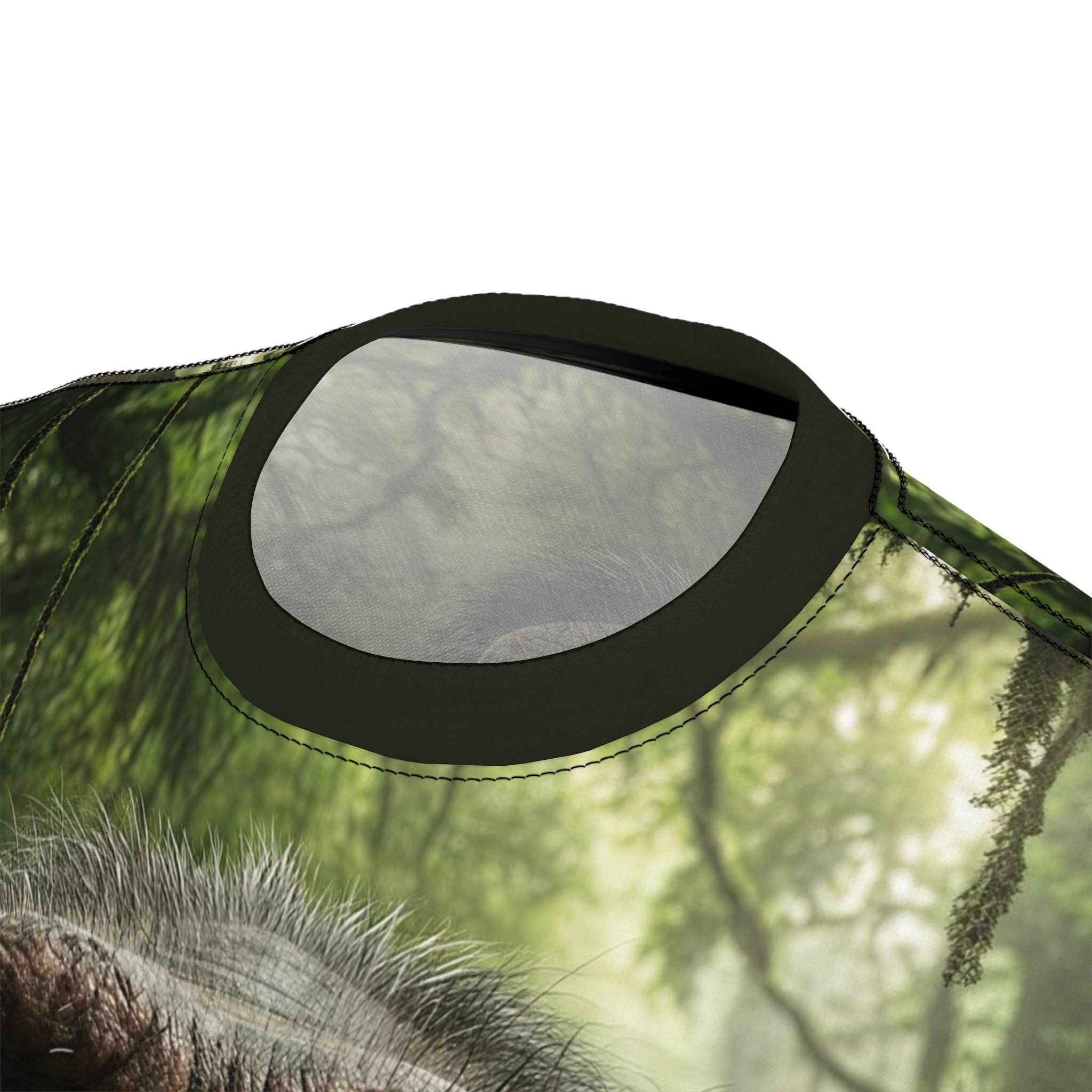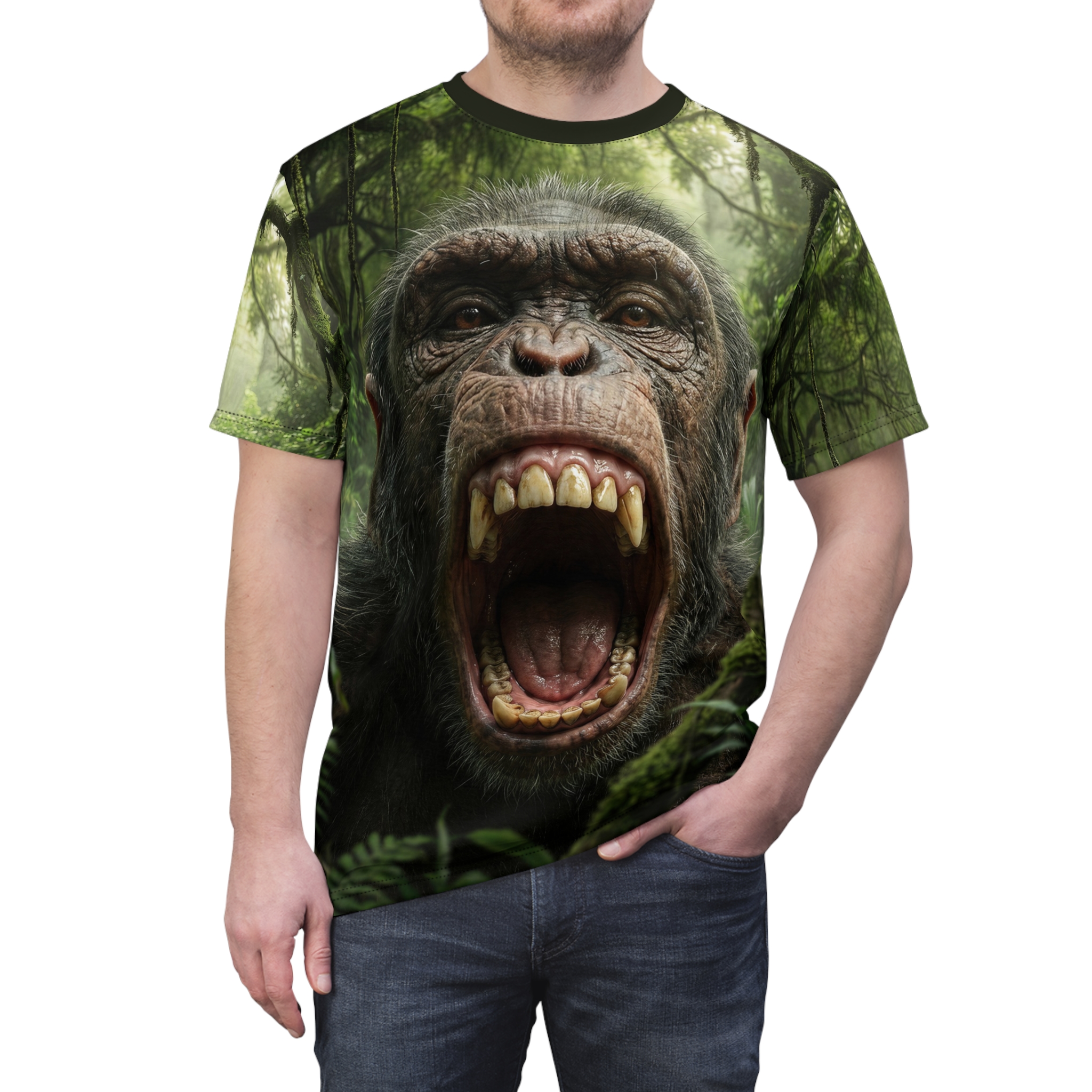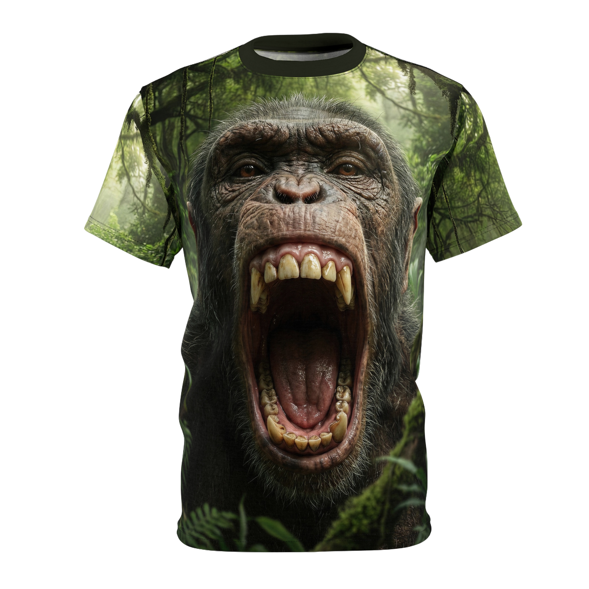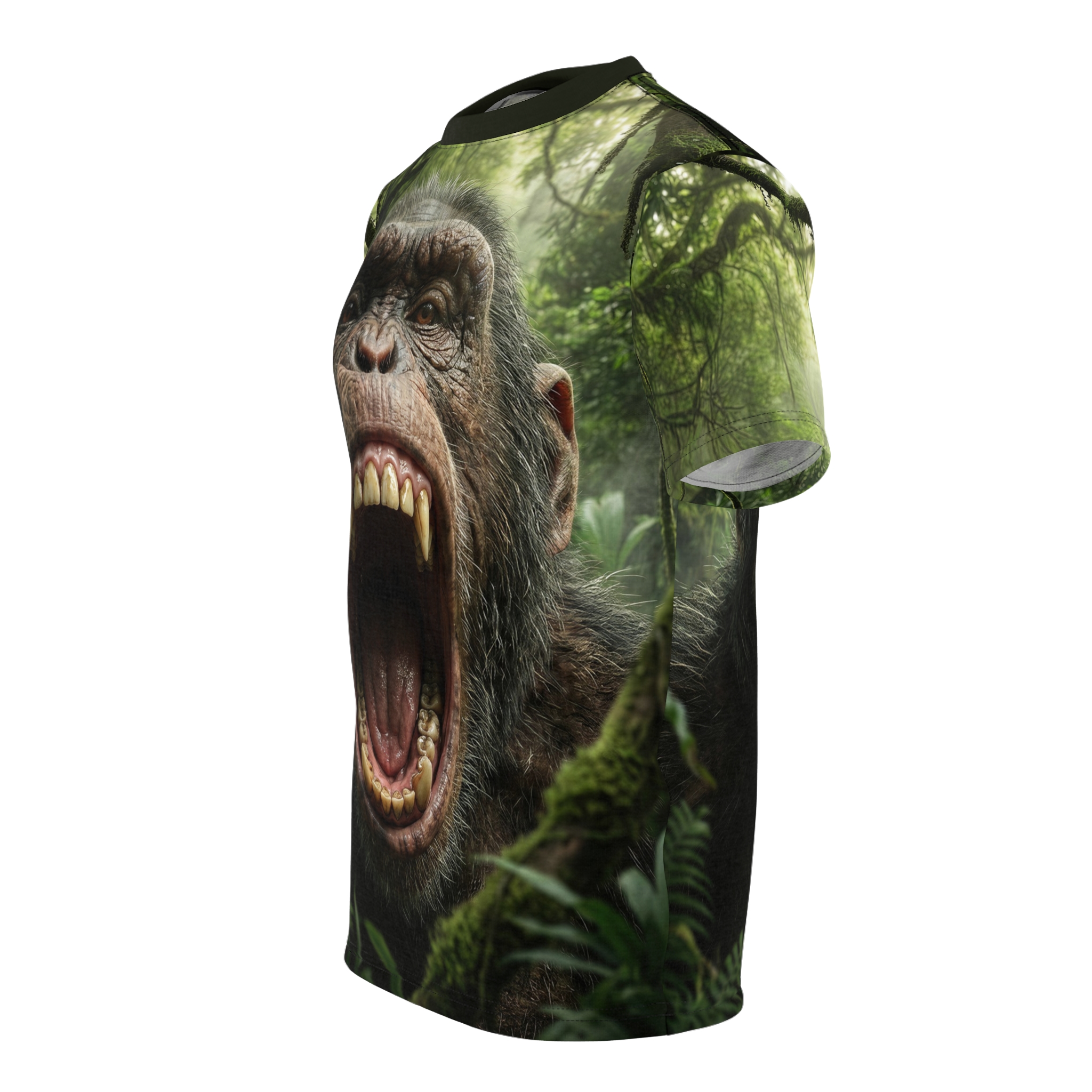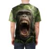 This all-over print tee drops you into the wild — a raw, visceral moment frozen on fabric. The front carries a close-up of a roaring ape framed by deep jungle greens and mottled light. Wear it when you want to stir something loud and untamed in your day: a conversation starter on hikes, a bold layer at outdoor meetups, or a statement piece for nights around a campfire. The breathable, quick-drying polyester keeps the colors punchy and the fit steady, so the art stays vivid through washes and adventures. Short, confident, and a little feral — it’s for people who like their style loud and their nature closer than most.
