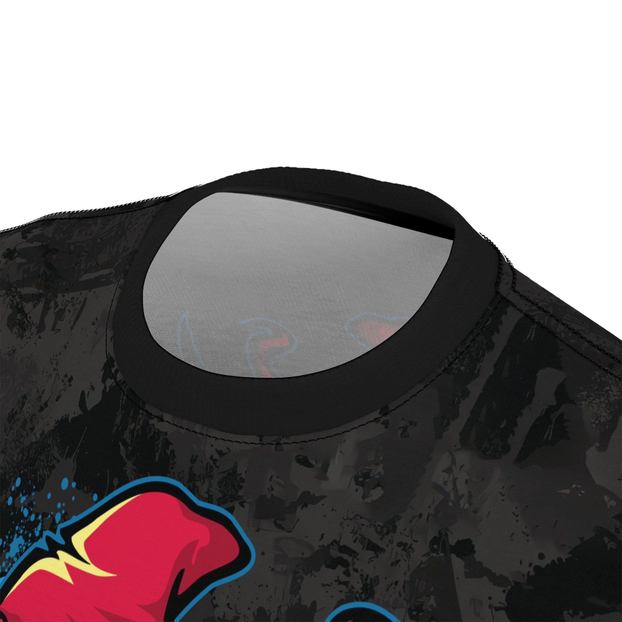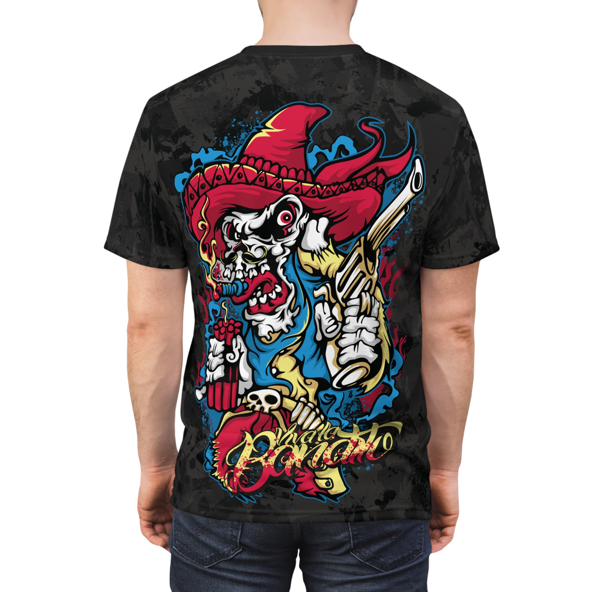 A bold, all-over print tee that channels gritty street-art energy with a Day-of-the-Dead–inspired outlaw character front and center. The skull-faced figure wears a wide-brimmed hat and brandishes a pistol, surrounded by vivid reds, blues and yellows that pop against a charcoal, textured background. This tee sits comfortably in a regular fit and drapes like a wearable poster—lightweight or slightly heftier options let you choose how it feels on the street. It’s built to keep its shape: ribbed collar, shoulder tape, and side seams add structure while a tagless finish keeps the neck smooth. Wear it layered under a moto jacket for nights out or solo with distressed denim for daytime grit—this shirt is for people who want their style loud and unapologetic.