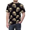 Introducing a stylish and edgy unisex tee perfect for any casual occasion. This shirt features a striking skull pattern set against a dark background, making it a bold fashion statement. Whether you’re headed to a music festival, a casual day out with friends, or just lounging at home, this tee brings an air of confidence and uniqueness to your wardrobe. It’s ideal for anyone who appreciates alternative fashion, particularly those celebrating Halloween or attending themed events. The tee’s standout design makes it a conversation starter, and its versatile style allows it to be paired effortlessly with jeans, shorts, or skirts.