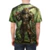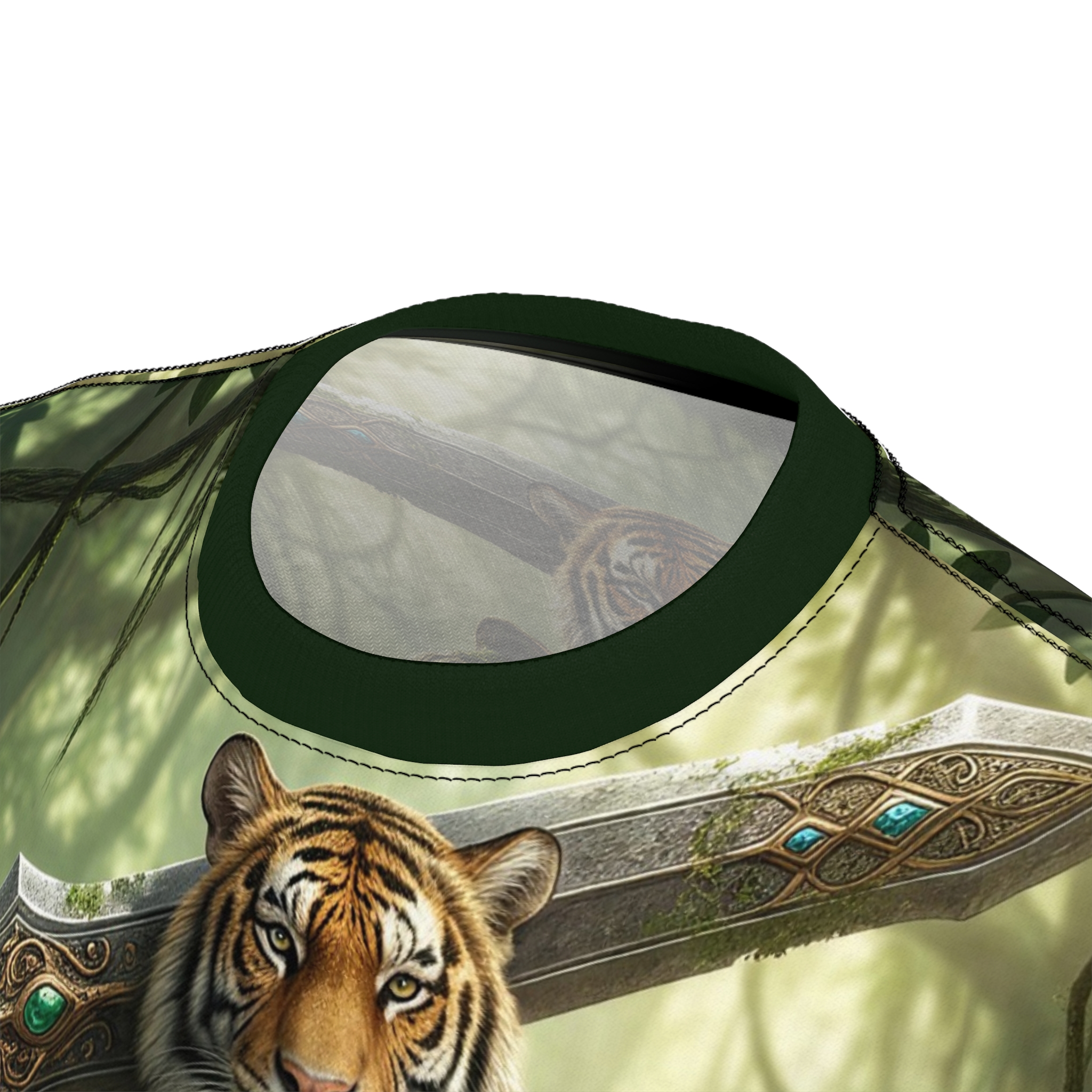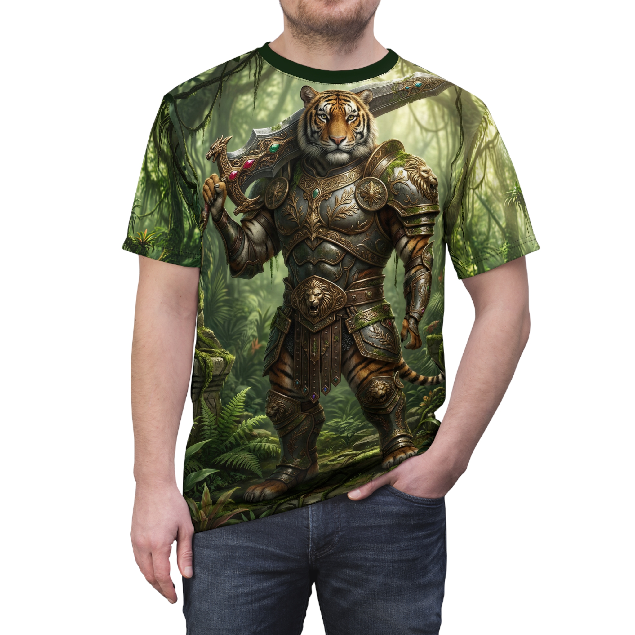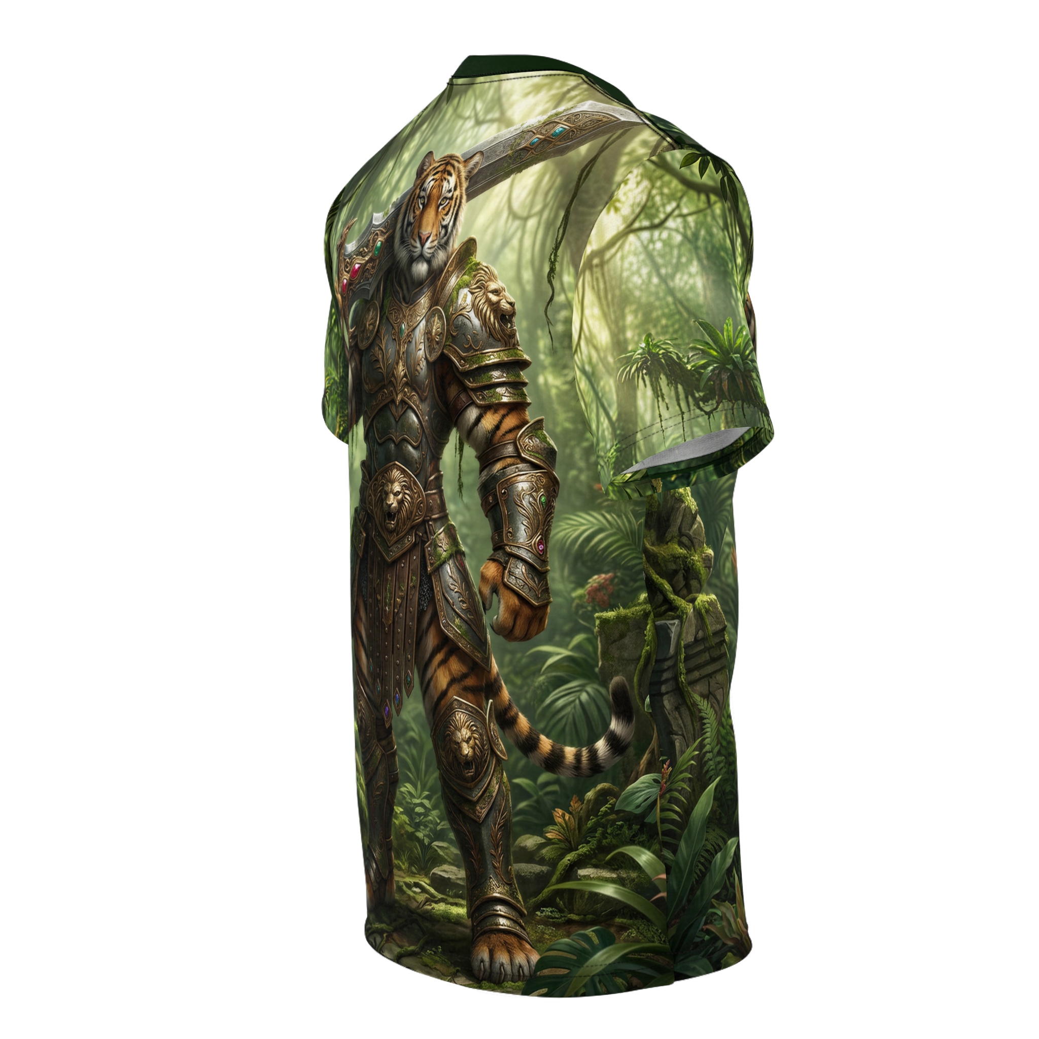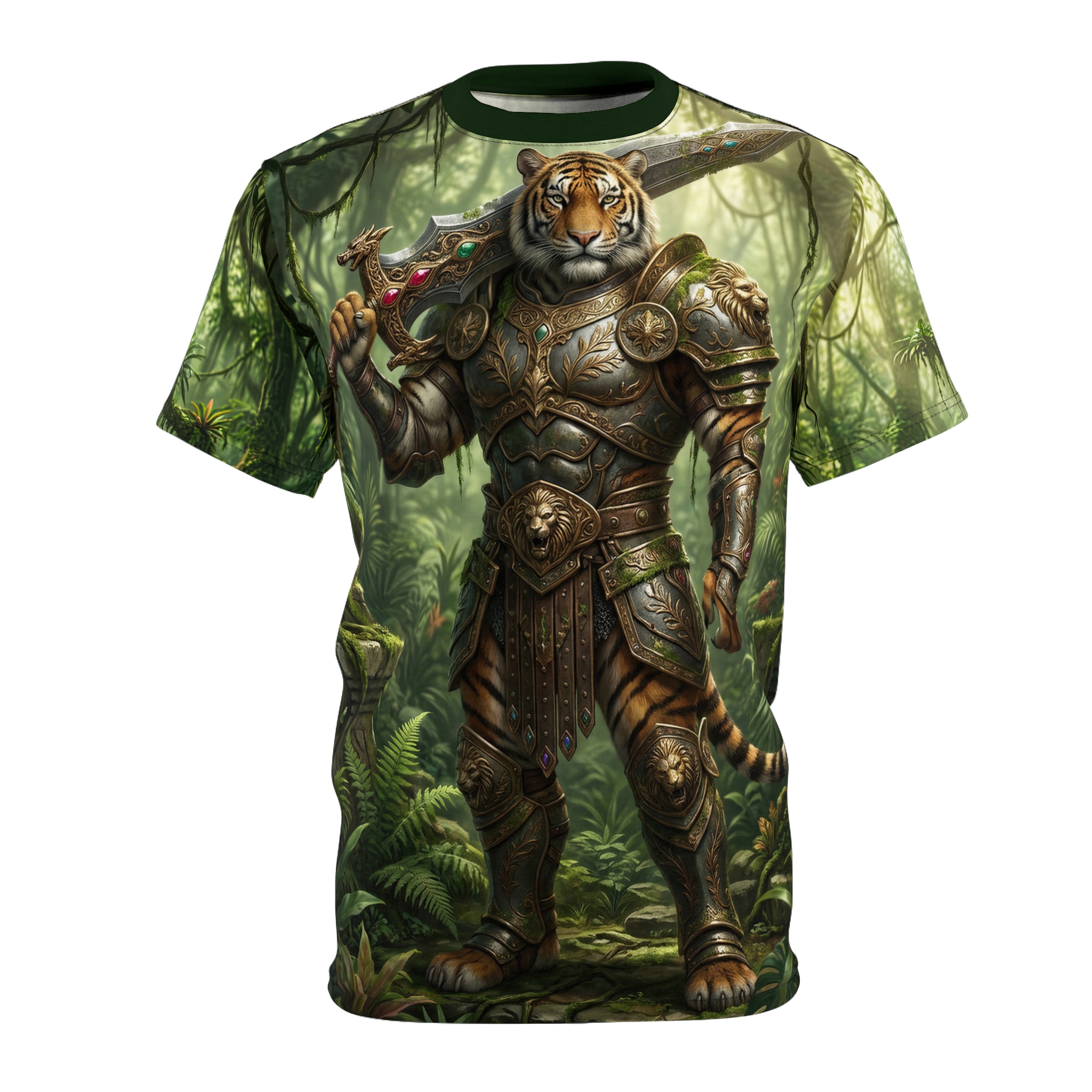 Step into the wild with a tee that tells a story. This all-over print shirt places a noble tiger-warrior in the heart of a misty, emerald jungle — armor gleaming, paw on a battle-axe, and eyes that hint at ancient guardianship. Wear it when you want your outfit to feel like a scene from a tabletop campaign or a late-night fantasy read. The dense foliage and weathered armor bring a sense of adventure and quiet strength. For players, collectors, and daydreamers, this tee becomes part of the narrative: it’s the armor you’d pick for a trek through forgotten ruins or the look you’d choose for a gaming night where legends are made. Short walks, convention halls, or cozy game nights — the design keeps conversations going and imaginations wandering.