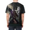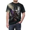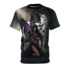 Slide into a scene of moonlit woods and hush—this all-over print tee wraps you in a quiet, magical moment. A dark-winged fairy kneels beside a solemn unicorn beneath shadowed trees, the artwork flowing edge-to-edge so the forest feels continuous across the front and back. Lightweight polyester gives the print vivid depth and a soft, drapey feel that layers easily under coats or stands alone for evenings when you want to carry a little mystery with you. Wear it to gatherings with fellow fantasy lovers, to midnight markets, or on long drives when you want a touch of story with you.