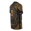 This all-over-print tee draws you into a world of runes, longships and carved knotwork. The front centers on a stern, bearded warrior beneath a golden helm, framed by twisting Celtic knots and faint runic bands that wrap across the shoulders and hem. Heavy, earthy tones—bronze, deep charcoal and oak—give the design a weathered, storybook feel. The fabric’s smooth polyester surface lets the artwork stay crisp and vibrant wash after wash, while the regular cut and ribbed collar keep the silhouette familiar and comfortable. Wear it under a leather jacket on an evening by the fire, or let it stand alone on festival days when you want to carry that old-world, seafaring mood with you.