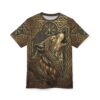 This all-over print tee brings ancient wildness into everyday wear. A bronze-toned wolf, braided with knotwork and runes, lifts its muzzle beneath a protective compass of runes — a design that feels both storied and alive. Lightweight and structured, the shirt keeps the art uninterrupted across front, back and sleeves so the scene reads like a single canvas. Wear it when you want to channel quiet strength on a trail, at a meetup, or around a campfire; the print invites conversation and holds up to repeated wear without losing its edge.